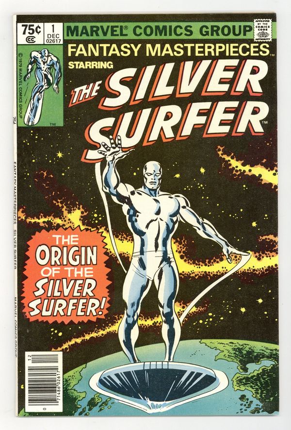 Newsstand Edition. Reprints Silver Surfer (1969 1st Series) #1. "The Origin of the Silver Surfer!" Cameos by the Incredible Hulk, Doctor Doom, and the Fantastic Four. Written by Stan Lee. Art by John Buscema and Joe Sinnott. Many years ago, in order to prevent the total annihilation of his civilization and homeworld, Norrin Radd bargained with the Devourer of Worlds. Imbued with the Power Cosmic, he became the Silver Surfer and Herald of Galactus. However, on the fateful day he arrived on Earth, for love of humanity, he betrayed his master, and thus was cursed to never traverse the space-ways again. This is his story. Cover price $0.75.