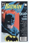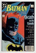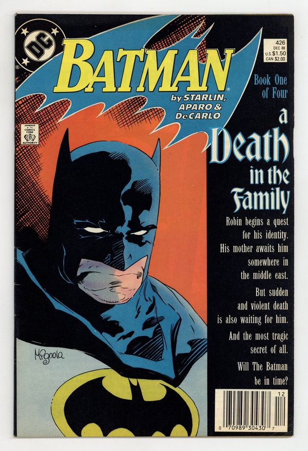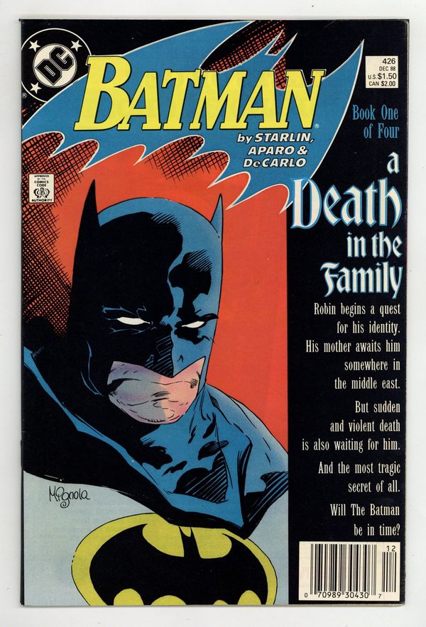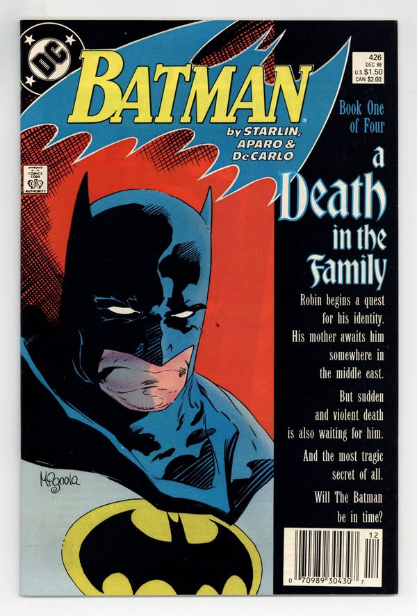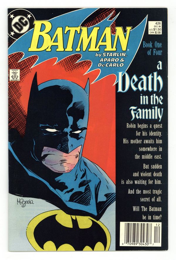 First printing. Newsstand Edition. Cover art by Mike Mignola. "A Death in the Family" part 1 of 4, script by Jim Starlin, pencils by Jim Aparo, inks by Mike DeCarlo; Jason discovers that his "real" mother was really his step-mother, and his birth mother is still alive; Joker escapes from Arkham and Batman chases him to the Middle East where he runs across Jason looking for one of the women he thinks is his mom. Infamous story where readers called an 800 number, and 'voted' to have Robin killed! Story continues in Batman #427. NOTE: Most issues from 397-432 were reprinted in 1989 and sold in multipacks. These 2nd and 3rd prints have back cover ads dated 1989. 52 Pages, Full Color. Cover price $1.50.
