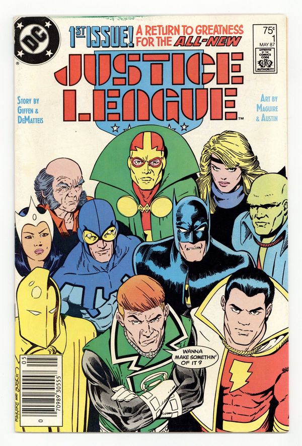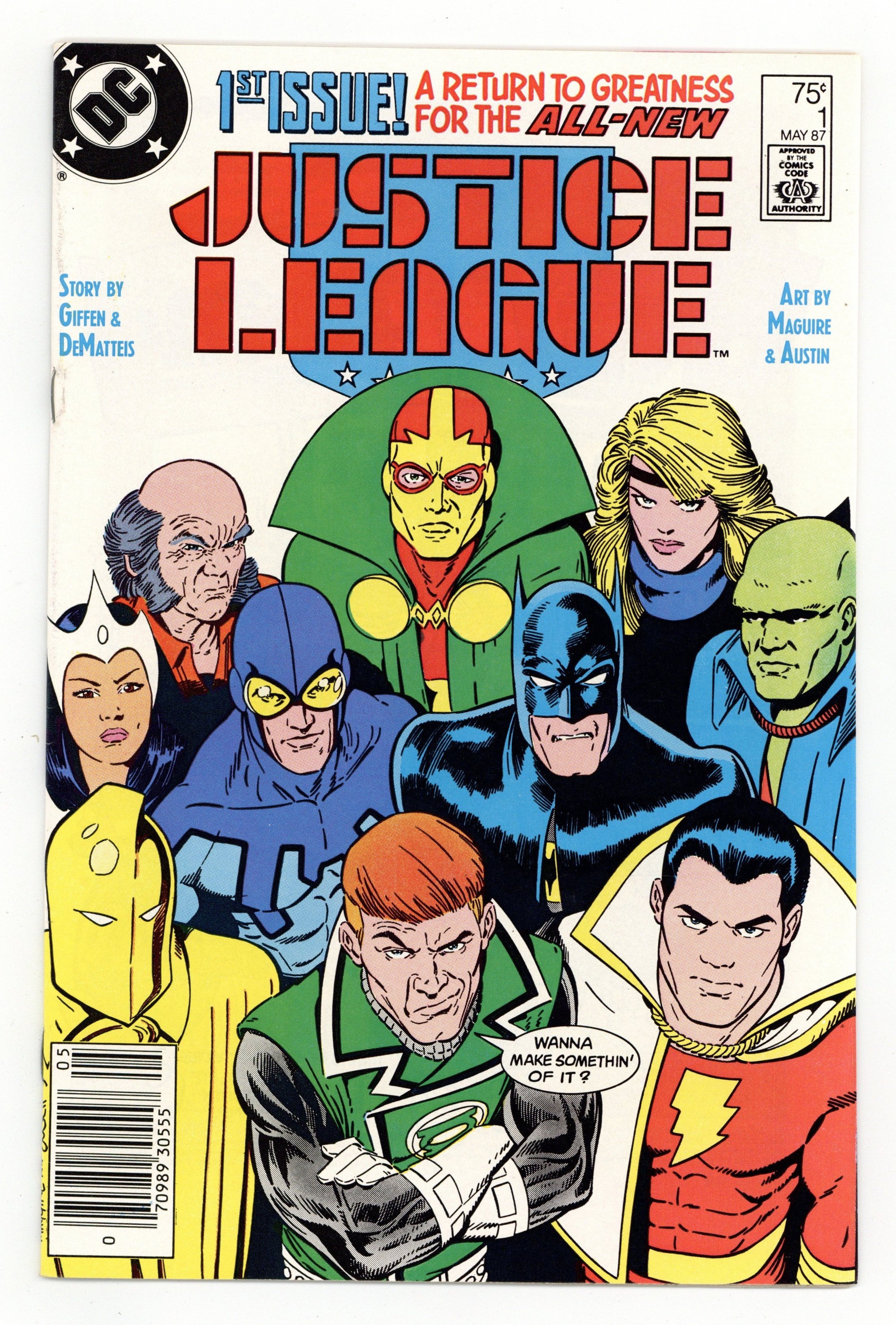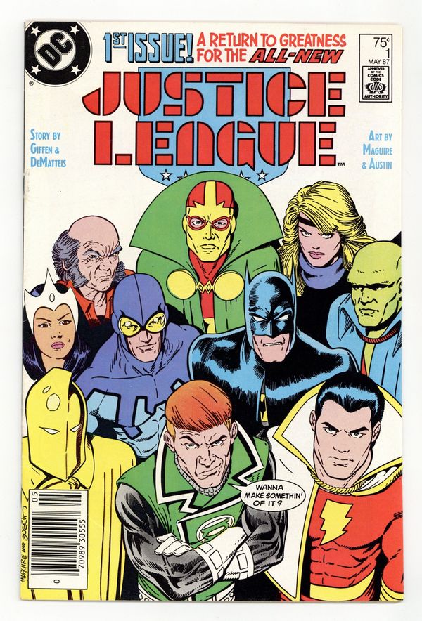 Newsstand Edition. When terrorists take the U.N. General Assembly hostage, Doctor Light (Kimiyo Hoshi) calls on the newly formed Justice League for help in "Born Again". Plot and breakdowns by Keith Giffen, script by Giffen and J.M. DeMatteis, pencils by Kevin Maguire, inks by Terry Austin. Batman, Guy Gardner, Black Canary, Mr. Miracle, Oberon, Captain Marvel, Martian Manhunter, Blue Beetle, Dr. Fate, Maxwell Lord. Maguire/Austin cover. Cover price $0.75.