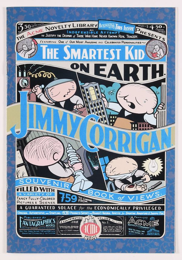 Starts May 18 1st app Jimmy Corrigan, Smartest Kid on Earth. Cover art by Chris Ware. Untitled Jimmy Corrigan story; Jimmy rustles up a new dad. Untitled Jimmy Corrigan story; God berates Jimmy for his dull life. Untitled Jimmy Corrigan story; Jimmy fantasies about a possible course for his life. Jimmy Gets Out Of The House; Young Jimmy makes a rocket ship and tries it out. Cut out and construct model of the Jimmy robot on the back cover. Scripts and art by Chris Ware. 36 pgs. $3.50. Cover price $3.50.