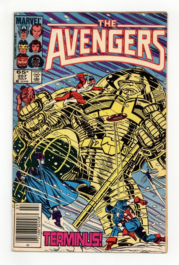 Newsstand Edition. "Holocaust in a Hidden Land!" Part 2 of 2. Guest-starring Ka-Zar and Shanna. Script by Roger Stern. Art by John Buscema (breakdowns) and Tom Palmer (finishes). Cover by John Buscema and Tom Palmer. Terminus is on a rampage through the Savage Land! And only Earth's Mightiest Heroes stand between the powerful alien and the utter destruction of the bottom of the world! Will the combined might of the Black Knight, shield-slinger, Starfox, Wasp, and Prince of Power be enough to prevent the annihilation of the hidden paradise? Or will Antarctica, centuries later, finally reclaim the Savage Land? A cold and bitter ending for Ka-Zar and the Avengers! Meanwhile light years away in outer space, Captain Marvel meets a new super-villain that will battle the Avengers for years to come! First appearance of Nebula. (Notes: The Savage Land first appeared in Uncanny X-Men (1st series) 10. The High Evolutionary attempts to restore the Savage Land in Uncanny X-Men Annual 12. This issue includes a full-page ad for the Secret Wars II Limited Series.) 36 pages Cover price $0.65.