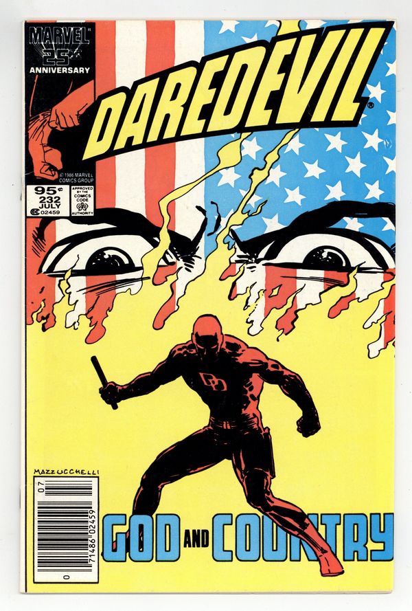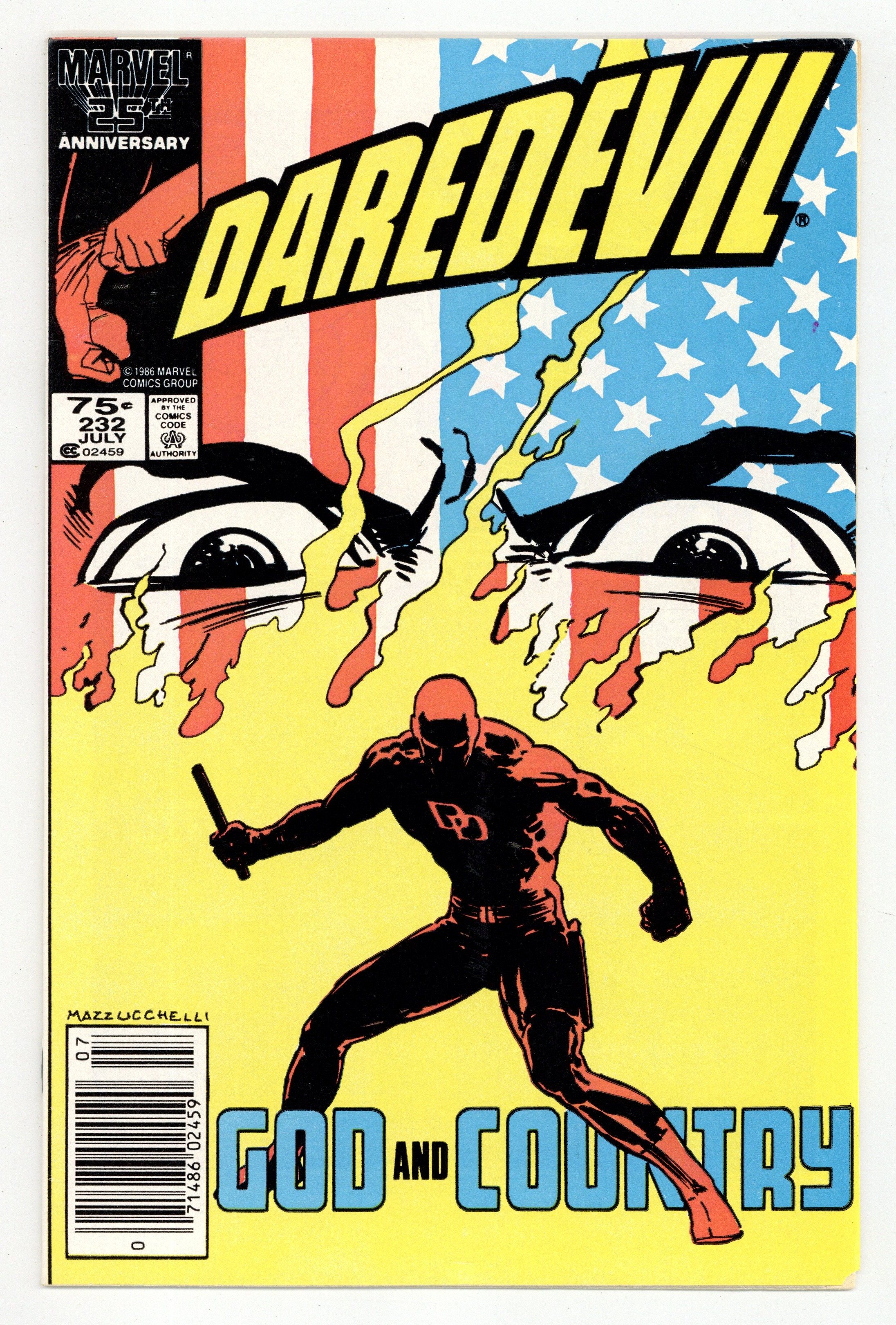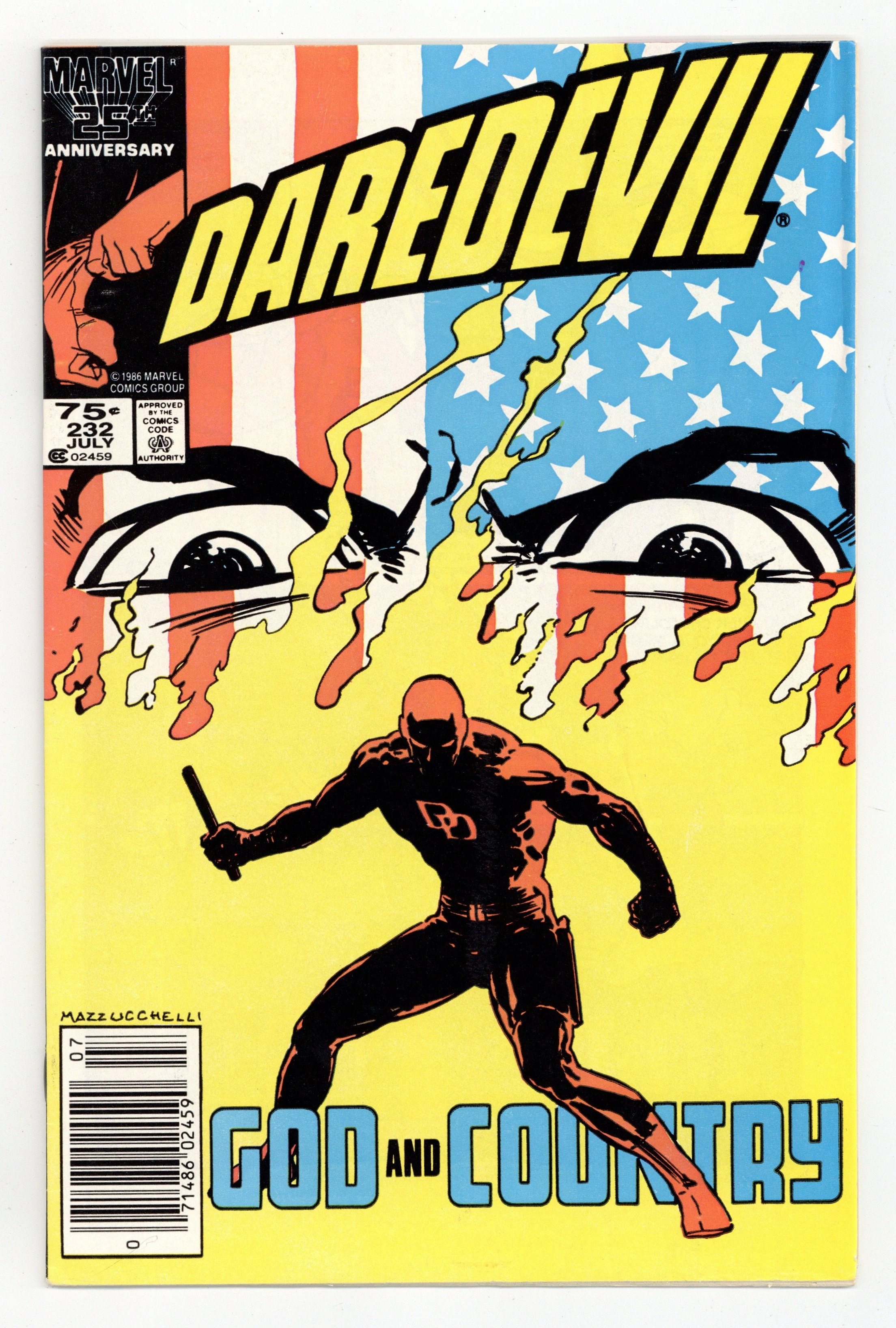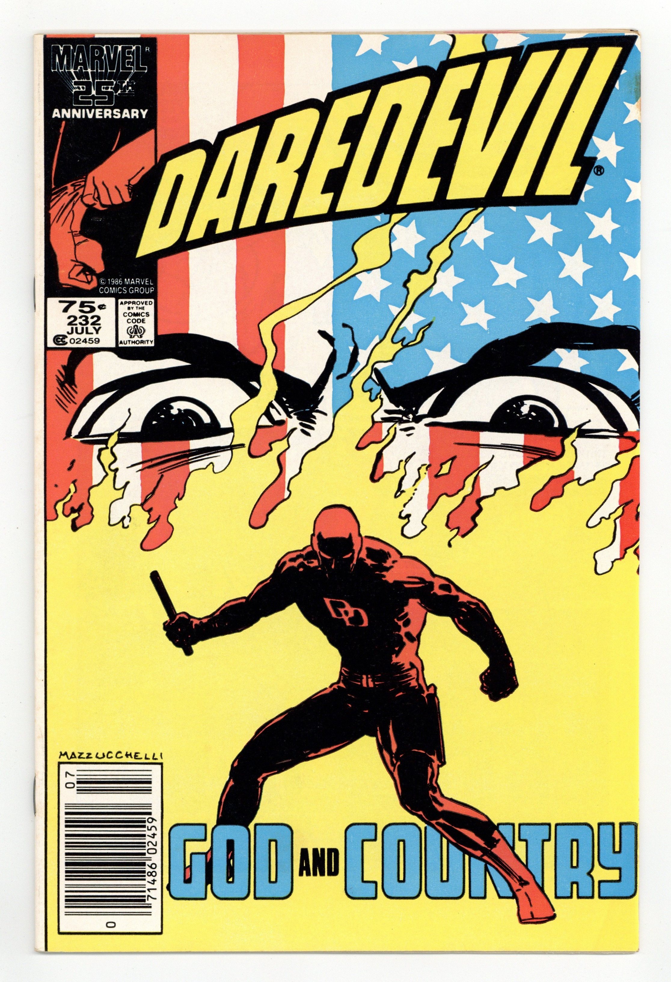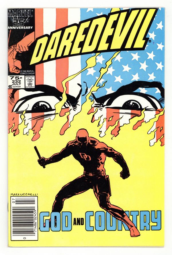 $25.00Newsstand Edition. Cover art by David Mazzucchelli. God and Country starring Daredevil, Karen Page, Foggy Nelson, Glorianna O'Breen, Ben Urich, Kingpin, and Nuke [Sgt. Simpson] (1st), script by Frank Miller, art by David Mazzucchelli; Matt helps Karen kick her drug habit; Kingpin hires a deranged Super Soldier to go after DD; part 6 of critically acclaimed Born Again storyline. 36 pgs. Cover price $0.75. Cover price $0.75.