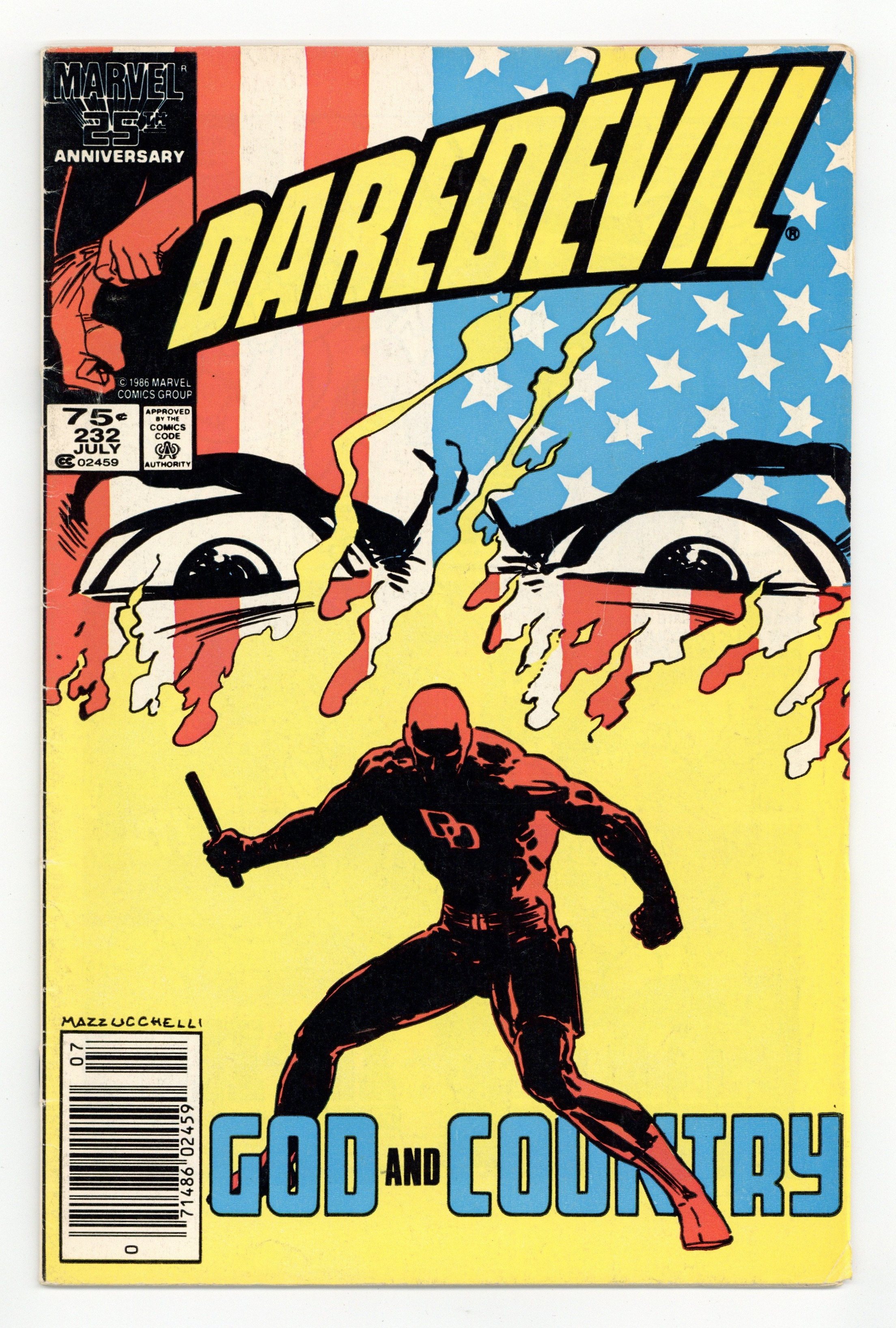 $26.00Newsstand Edition. Cover art by David Mazzucchelli. God and Country starring Daredevil, Karen Page, Foggy Nelson, Glorianna O'Breen, Ben Urich, Kingpin, and Nuke [Sgt. Simpson] (1st), script by Frank Miller, art by David Mazzucchelli; Matt helps Karen kick her drug habit; Kingpin hires a deranged Super Soldier to go after DD; part 6 of critically acclaimed Born Again storyline. 36 pgs. Cover price $0.75. Cover price $0.75.