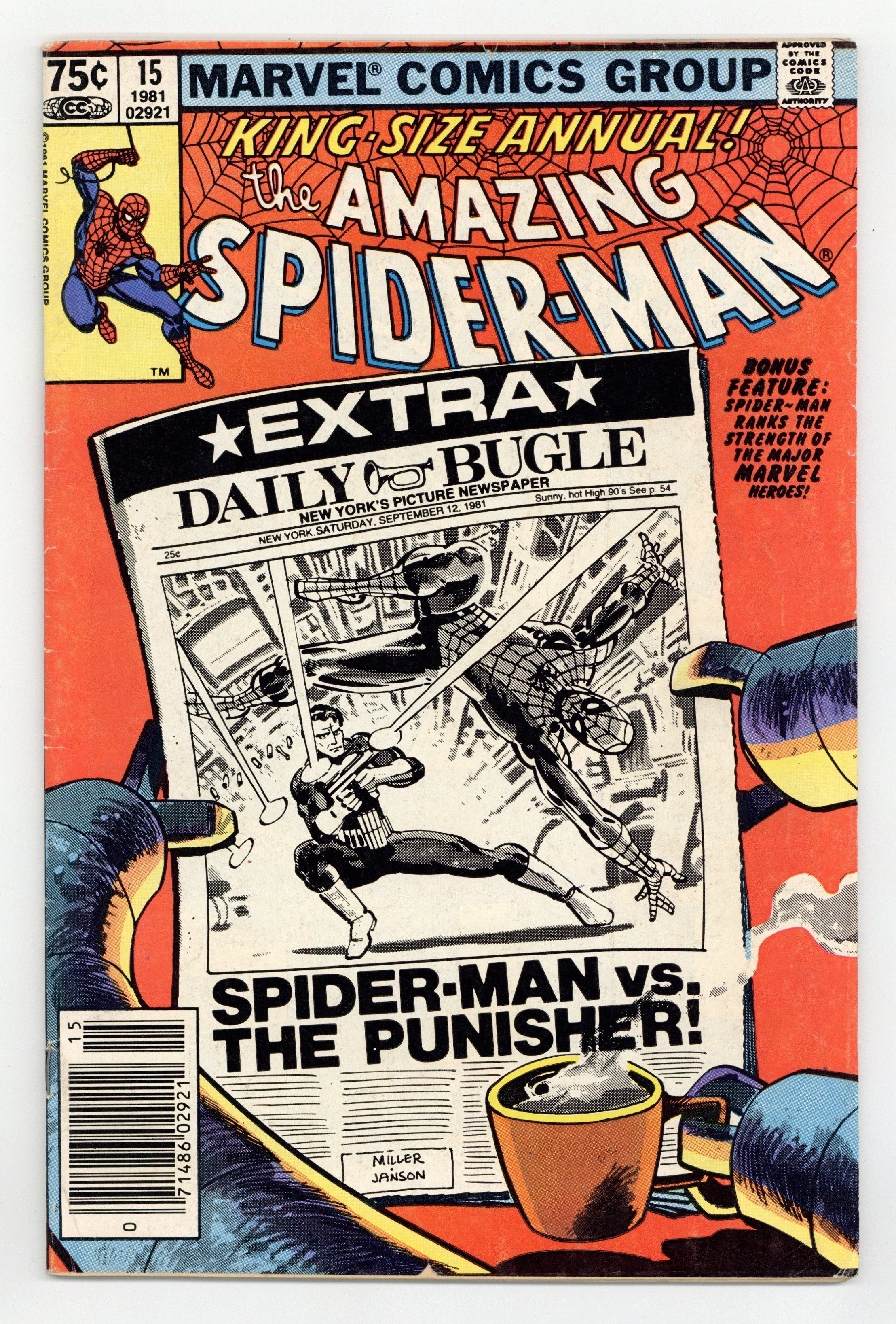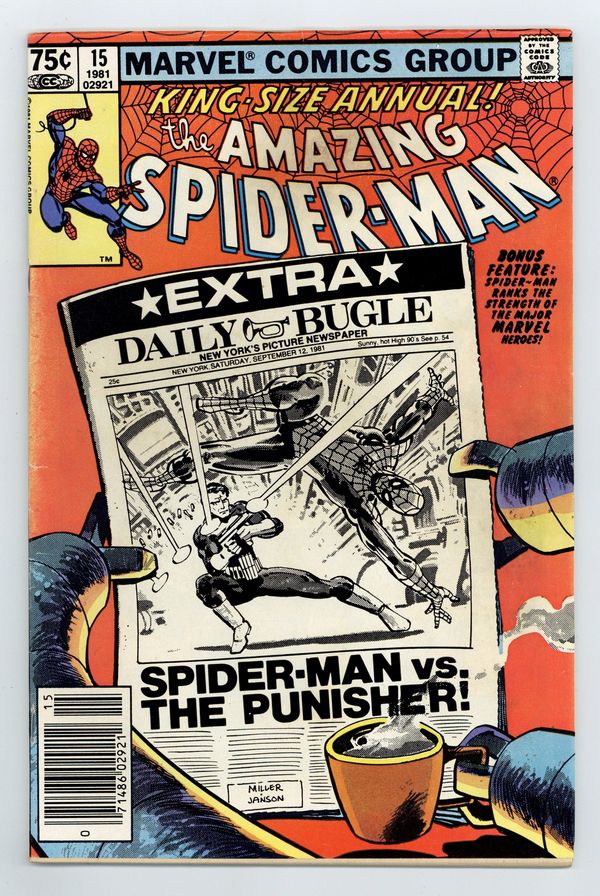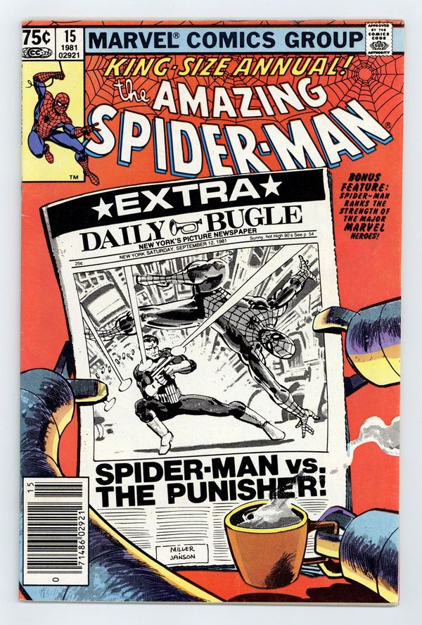 Starts Feb 9 Newsstand Edition. "Spider-Man: Threat or Menace?" Guest-starring the Punisher. Script by Denny O'Neil. Art by Frank Miller (breakdowns) and Klaus Janson (finishes). Cover by Frank Miller and Klaus Janson. The dynamic art tandem that took the Daredevil series to new heights in the early 1980's teams up to bring Spider-Man and the Punisher together again! But this time the web-slinger and the gun-toting vigilante are not facing the likes of Jigsaw or the Hitman! Their adversary is a certain six-armed super-villain...planning nothing less than the murder of five million people! The Punisher takes the first shot at Dr. Octopus in the city morgue! And later on the wondrous wall-crawler takes the last one at the Daily Bugle! Can Spidey get the story to press before Doc Ock? An excellent annual! Second feature: "Just How Strong Is...Spider-Man?" Script by Mark Gruenwald. Art by Mark Gruenwald (layouts) and Bob Layton (finishes). The heroes of the Marvel Universe are ranked in order of their physical strength. The first tier consists of the Hulk, Hercules, Thor, Wonder Man, and Iron Man. The Thing and the Sub-Mariner headline the second tier. Spider-Man is in the third tier. This may be the first such "power ranking" attempted...thus making it a landmark backup feature. Third feature: "Peter Parker's Apartment!" Script by Roger Stern. Art by Marie Severin and Terry Austin. One-page illustration of Peter's Chelsea apartment correcting the errors in Amazing Spider-Man Annual 13. Fourth feature: "A Gallery of Spider-Man's Most Famous Foes!" Script by Roger Stern. Art by Keith Pollard, Greg LaRocque, and Frank Giacoia. 4 pages of pin-ups featuring the Man-Wolf, Jackal, Punisher, and Tarantula. (Notes: Dr. Octopus previously appeared in Captain America 259. The Punisher appears next in Daredevil 181 & 182. This story was reprinted in the trade paperback The Sensational Spider-Man (1988); and also in the (1994) Complete Frank Miller Spider-Man.) 52 pages. Cover price $0.75.