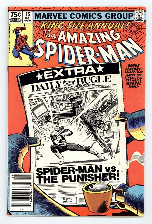 Newsstand Edition. "Spider-Man: Threat or Menace?" Guest-starring the Punisher. Script by Denny O'Neil. Art by Frank Miller (breakdowns) and Klaus Janson (finishes). Cover by Frank Miller and Klaus Janson. The dynamic art tandem that took the Daredevil series to new heights in the early 1980's teams up to bring Spider-Man and the Punisher together again! But this time the web-slinger and the gun-toting vigilante are not facing the likes of Jigsaw or the Hitman! Their adversary is a certain six-armed super-villain...planning nothing less than the murder of five million people! The Punisher takes the first shot at Dr. Octopus in the city morgue! And later on the wondrous wall-crawler takes the last one at the Daily Bugle! Can Spidey get the story to press before Doc Ock? An excellent annual! Second feature: "Just How Strong Is...Spider-Man?" Script by Mark Gruenwald. Art by Mark Gruenwald (layouts) and Bob Layton (finishes). The heroes of the Marvel Universe are ranked in order of their physical strength. The first tier consists of the Hulk, Hercules, Thor, Wonder Man, and Iron Man. The Thing and the Sub-Mariner headline the second tier. Spider-Man is in the third tier. This may be the first such "power ranking" attempted...thus making it a landmark backup feature. Third feature: "Peter Parker's Apartment!" Script by Roger Stern. Art by Marie Severin and Terry Austin. One-page illustration of Peter's Chelsea apartment correcting the errors in Amazing Spider-Man Annual 13. Fourth feature: "A Gallery of Spider-Man's Most Famous Foes!" Script by Roger Stern. Art by Keith Pollard, Greg LaRocque, and Frank Giacoia. 4 pages of pin-ups featuring the Man-Wolf, Jackal, Punisher, and Tarantula. (Notes: Dr. Octopus previously appeared in Captain America 259. The Punisher appears next in Daredevil 181 & 182. This story was reprinted in the trade paperback The Sensational Spider-Man (1988); and also in the (1994) Complete Frank Miller Spider-Man.) 52 pages. Cover price $0.75.
