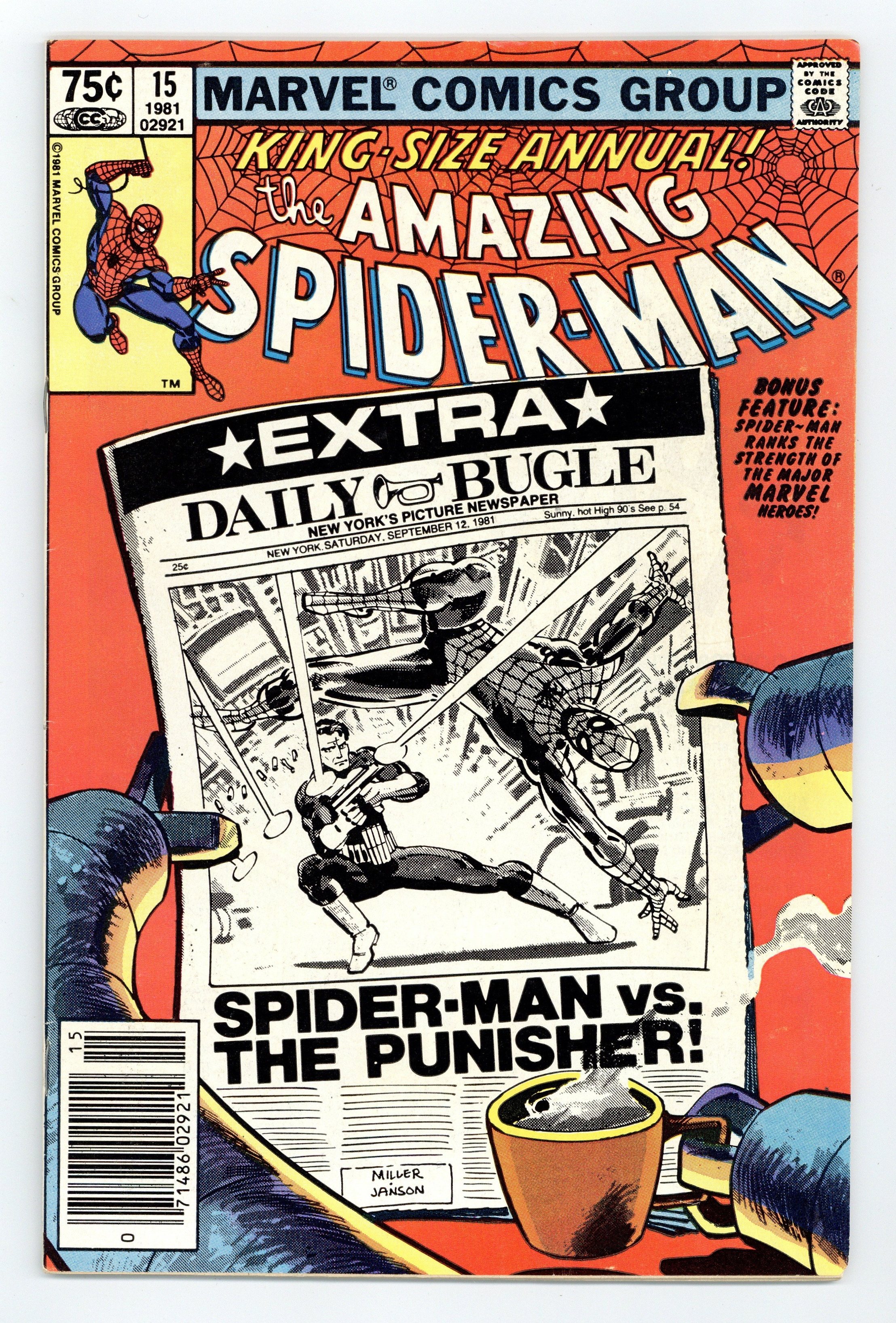 Tags: Spider-Man$22.00Newsstand Edition. "Spider-Man: Threat or Menace?" Guest-starring the Punisher. Script by Denny O'Neil. Art by Frank Miller (breakdowns) and Klaus Janson (finishes). Cover by Frank Miller and Klaus Janson. The dynamic art tandem that took the Daredevil series to new heights in the early 1980's teams up to bring Spider-Man and the Punisher together again! But this time the web-slinger and the gun-toting vigilante are not facing the likes of Jigsaw or the Hitman! Their adversary is a certain six-armed super-villain...planning nothing less than the murder of five million people! The Punisher takes the first shot at Dr. Octopus in the city morgue! And later on the wondrous wall-crawler takes the last one at the Daily Bugle! Can Spidey get the story to press before Doc Ock? An excellent annual! Second feature: "Just How Strong Is...Spider-Man?" Script by Mark Gruenwald. Art by Mark Gruenwald (layouts) and Bob Layton (finishes). The heroes of the Marvel Universe are ranked in order of their physical strength. The first tier consists of the Hulk, Hercules, Thor, Wonder Man, and Iron Man. The Thing and the Sub-Mariner headline the second tier. Spider-Man is in the third tier. This may be the first such "power ranking" attempted...thus making it a landmark backup feature. Third feature: "Peter Parker's Apartment!" Script by Roger Stern. Art by Marie Severin and Terry Austin. One-page illustration of Peter's Chelsea apartment correcting the errors in Amazing Spider-Man Annual 13. Fourth feature: "A Gallery of Spider-Man's Most Famous Foes!" Script by Roger Stern. Art by Keith Pollard, Greg LaRocque, and Frank Giacoia. 4 pages of pin-ups featuring the Man-Wolf, Jackal, Punisher, and Tarantula. (Notes: Dr. Octopus previously appeared in Captain America 259. The Punisher appears next in Daredevil 181 & 182. This story was reprinted in the trade paperback The Sensational Spider-Man (1988); and also in the (1994) Complete Frank Miller Spider-Man.) 52 pages. Cover price $0.75.