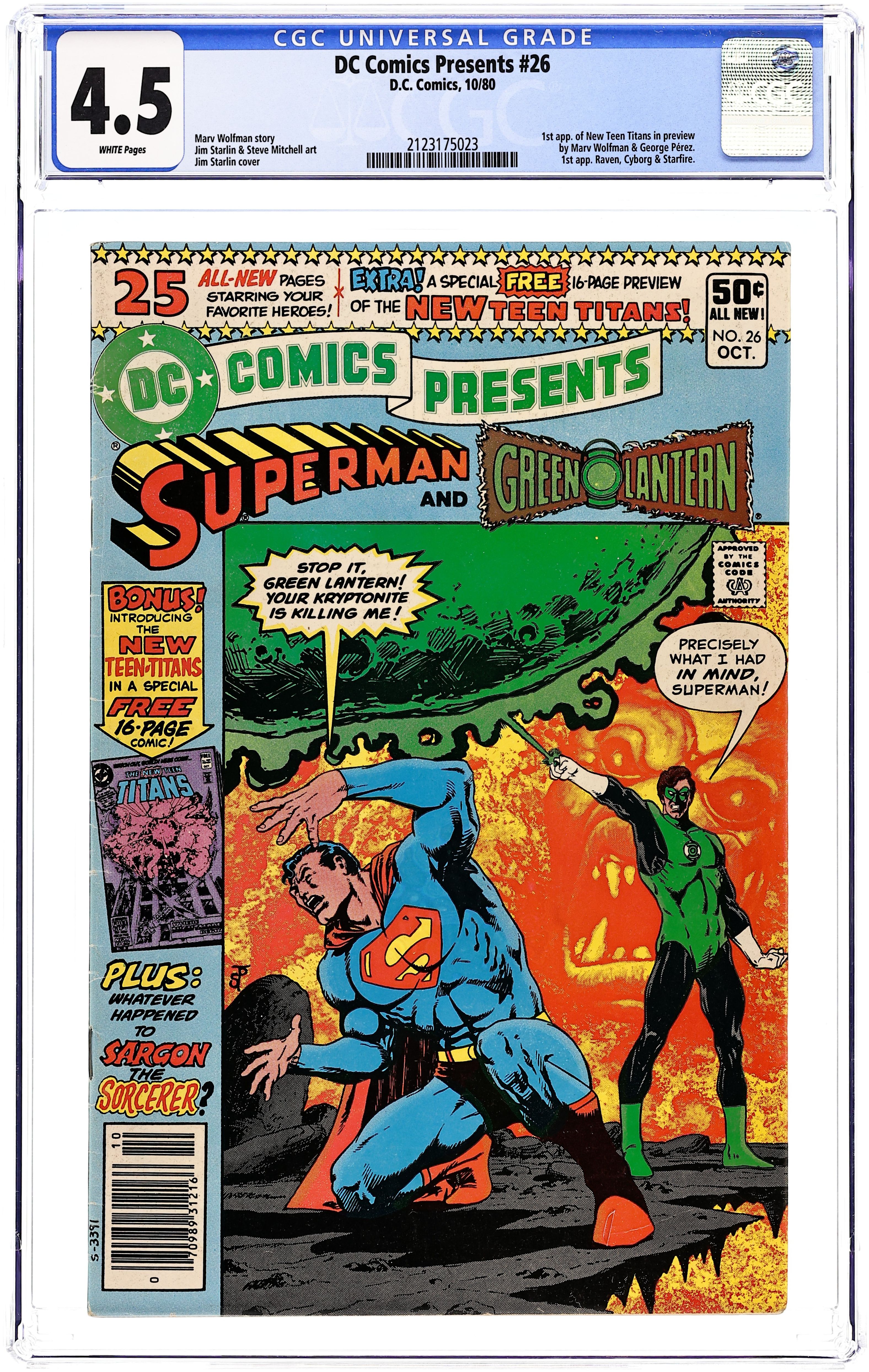 Tags: Superman$150.00Newsstand Edition. 1st appearance of the New Teen Titans in preview story; 1st appearances of Raven, Cyborg and Starfire. Cover by Jim Starlin. Stories by Jim Starlin, Marv Wolfman and Bob Rozakis. Art by Jim Starlin, George Pérez, José Delbo, Steve Mitchell, Dick Giordano and Kim DeMulder. N'Gon is attempting to gain power by taking it from other super-beings, but Superman and Green Lantern combine forces to imprison N'Gon in "Between Friend and Foe!" by Jim Starlin (plot and pencils), Marv Wolfman (script) and Steve Mitchell (inks). Characters in this story: Green Lantern [Hal Jordan]; Superman [Clark Kent]; Green Lantern [Archon Z'Gmora]; N'Gon (villain); Archie Jones. Plus: Raven uses her powers to enter Dick Grayson's dreams to show him a scene from the not-too-distant future of the new Teen Titans team battling to save the world from an other-dimensional protoplasmic creature in "Where Nightmares Begin!" by Marv Wolfman, George Pérez and Dick Giordano. Characters in this story: Teen Titans [Changeling [Garfield Logan] (introduction as Changeling); Cyborg [Victor Stone] (introduction); Kid Flash [Wally West]; Raven (introduction); Robin [Dick Grayson]; Starfire [Koriand'r] (introduction); Wonder Girl [Donna Troy]]; Silas Stone (introduction); an other-dimensional protoplasm (villain). Story continues in New Teen Titans (1980) (Tales of ...) #1. Also: The Matter Master attempts to steal the Ruby of Life but Sargon stops him in the back-up story "Whatever Happened to Sargon the Sorcerer?" by Bob Rozakis, José Delbo and Kim DeMulder. Characters in this story: Justice League of America [The Atom [Ray Palmer] (flashback); Batman [Bruce Wayne] (flashback); The Flash [Barry Allen] (flashback); Green Arrow [Oliver Queen] (flashback); Hawkman [Katar Hol/Carter Hall] (flashback); Superman [Clark Kent] (flashback); Wonder Woman [Diana Prince] (flashback)]; The Matter Master [Mark Mandrill] (villain); Sargon the Sorcerer [John Sargent]. And: Hawkman vs. Golden Raven in 1-page Hostess Fruit Pies ad "She's No Angel" with pencils by Curt Swan. 48 pages, full color. Cover price $0.50.