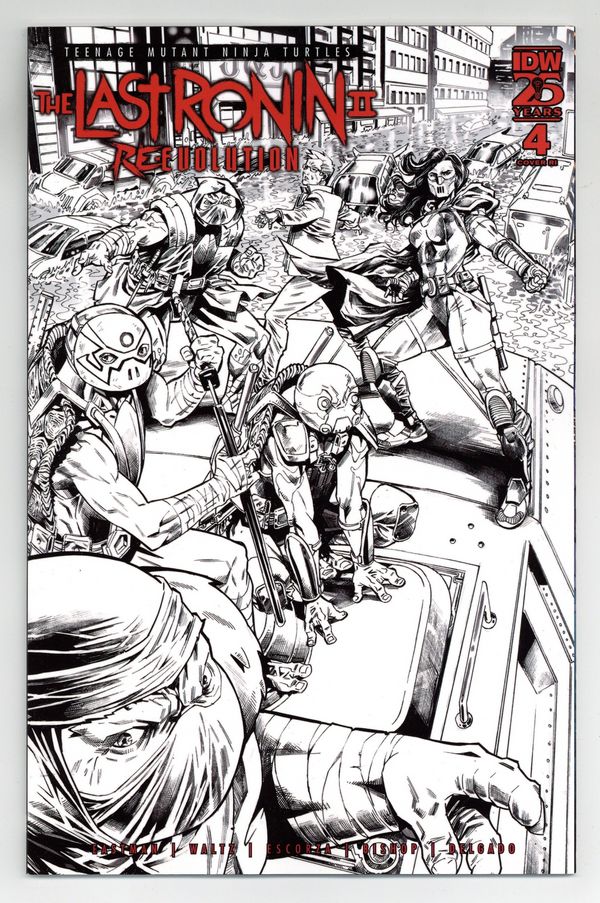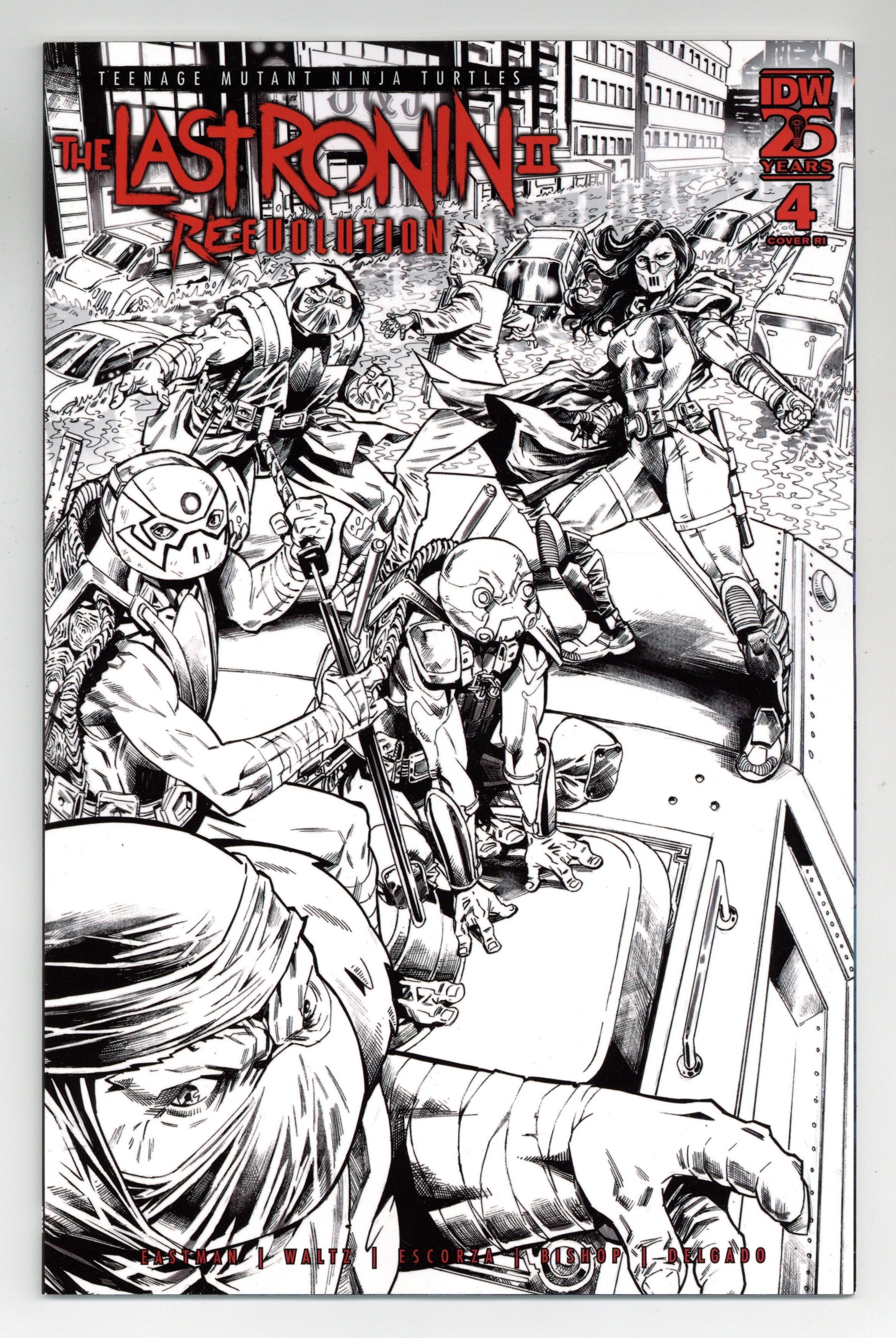 Published Jan 2025 by IDW Publishing.$27.00Limited 1 for 75 Retailer Incentive Variant Cover. Written by Kevin Eastman; Tom Waltz. Art by Escorza Brothers; Ben Bishop. Cover by Escorza Brothers. The criminal underworlds takeover of New York City is ongoing, and the violence is escalating as the city is overwhelmed by gang warfare in the streets. When coordinated attacks threaten to fully destroy the Resistance, April executes an untested contingency plan, and her allies and enemies alike must flee to safety. With the city so dangerous, though, theres few places of sanctuary left. As Resistance survivors retreat to an old stronghold, the new Teenage Mutant Ninja Turtles must reconcile the past with the present in the penultimate issue of the Re-Evolution story!The saga continues as legendary TMNT co-creator Kevin Eastman reassembles the acclaimed creative team for the next epic chapter of The Last Ronin! 48 pages, full color. Rated M Cover price $8.99.