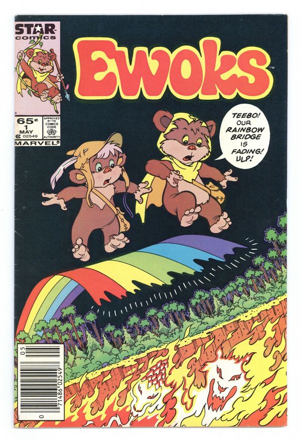 Newsstand Edition. "The Rainbow Bridge!" Story by David Manak. Art by Warren Kremer and Marie Severin. The brave Ewoks from the Star Wars: Return of the Jedi get their very own comics series. Wicket and Teebo embark on an epic quest to save the village. FC, 32 pages Cover price $0.65.