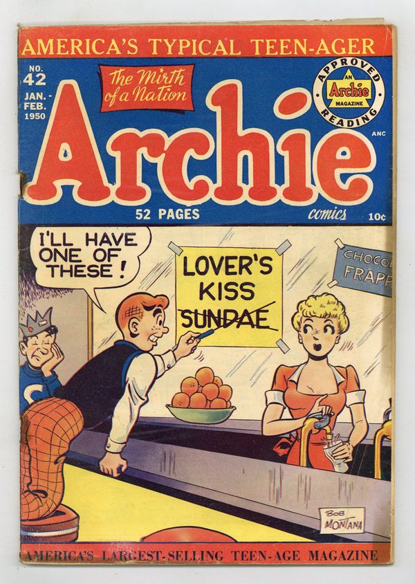 Cover by Bob Montana. Stories by unknown. Art by Ray Gill, Sam Schwartz and unknown. Featuring Archie in: "The Good Rumor Man"; "Ignorance Is Bliss"; "Fortune's Folly"; "Through the Looking Glass"; and "The Handwriting On the Wall"! Plus: Jughead in "Cupid's Boy"! Also: 2-page text piece "Hollywood Tattle Tales"! Full color. Cover price $0.10.