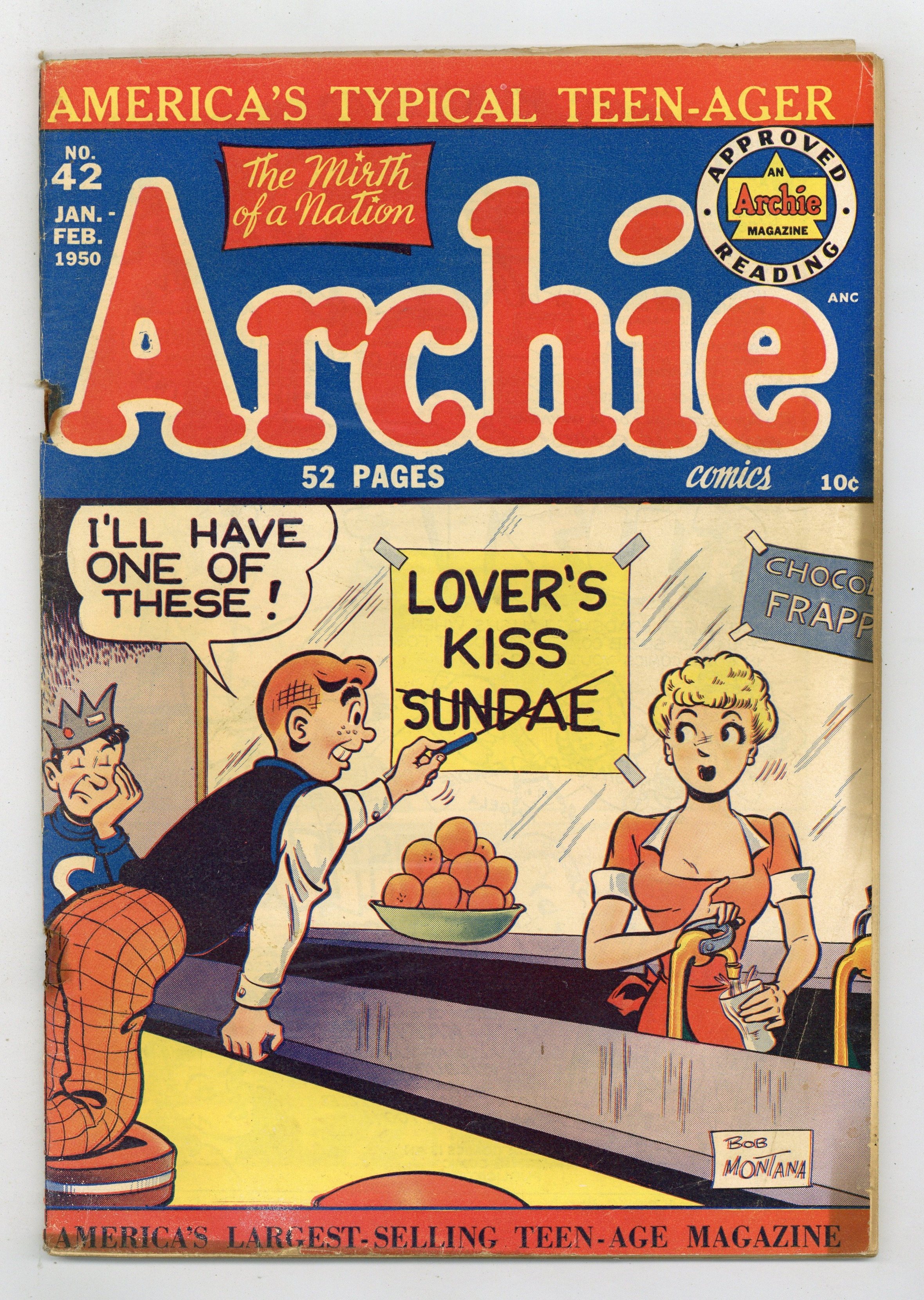 Tags: ArchiePublished Feb 1950 by Archie Publications.$80.00- Cover detached at one staple, staple rust/migration, moisture damage.