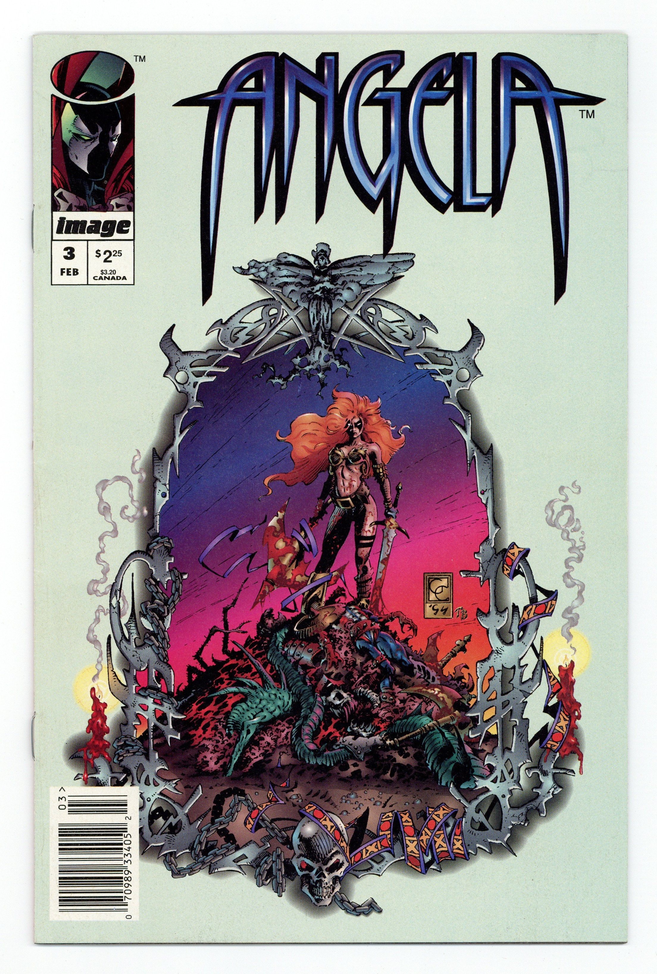Newsstand Edition. Cover art by Greg Capullo. Untitled Angela story, script by Neil Gaiman, pencils by Greg Capullo, inks by Mark Pennington; Angela is cleared of all charges, but leaves Heaven anyway. Angela pinup by Betty Ballew. Angela pinup by Gary Kwandis. 36 pgs. $2.25. Cover price $2.25.