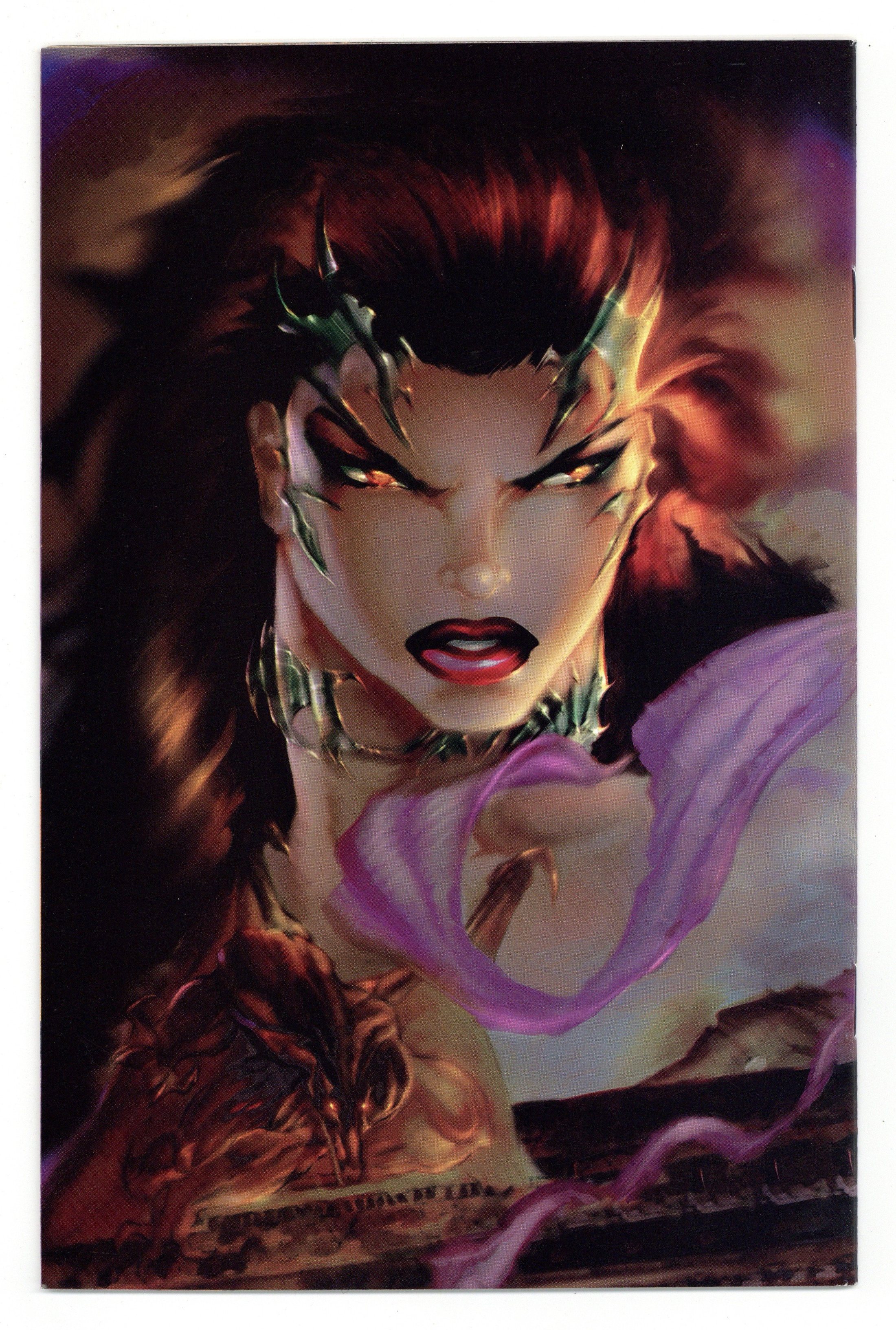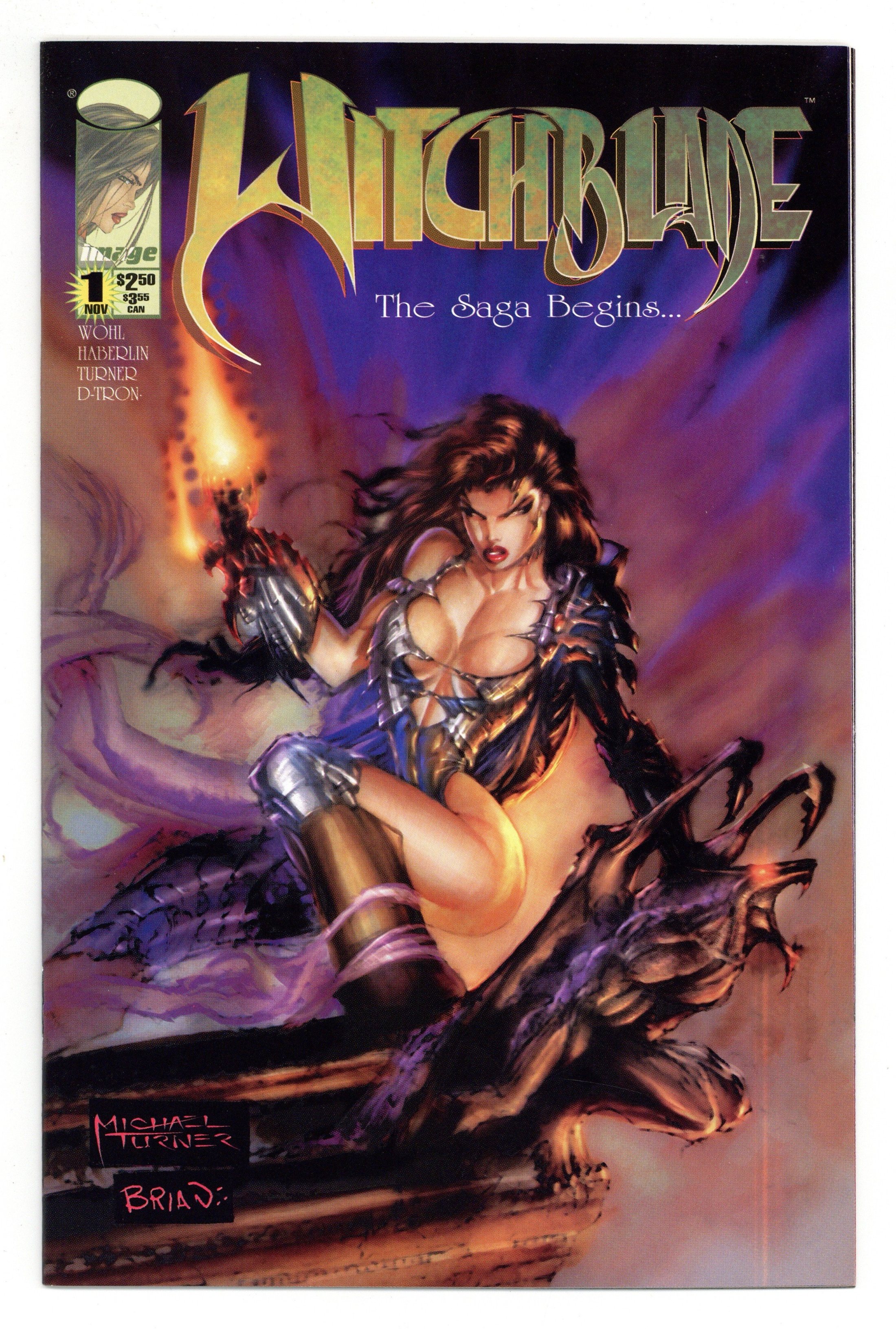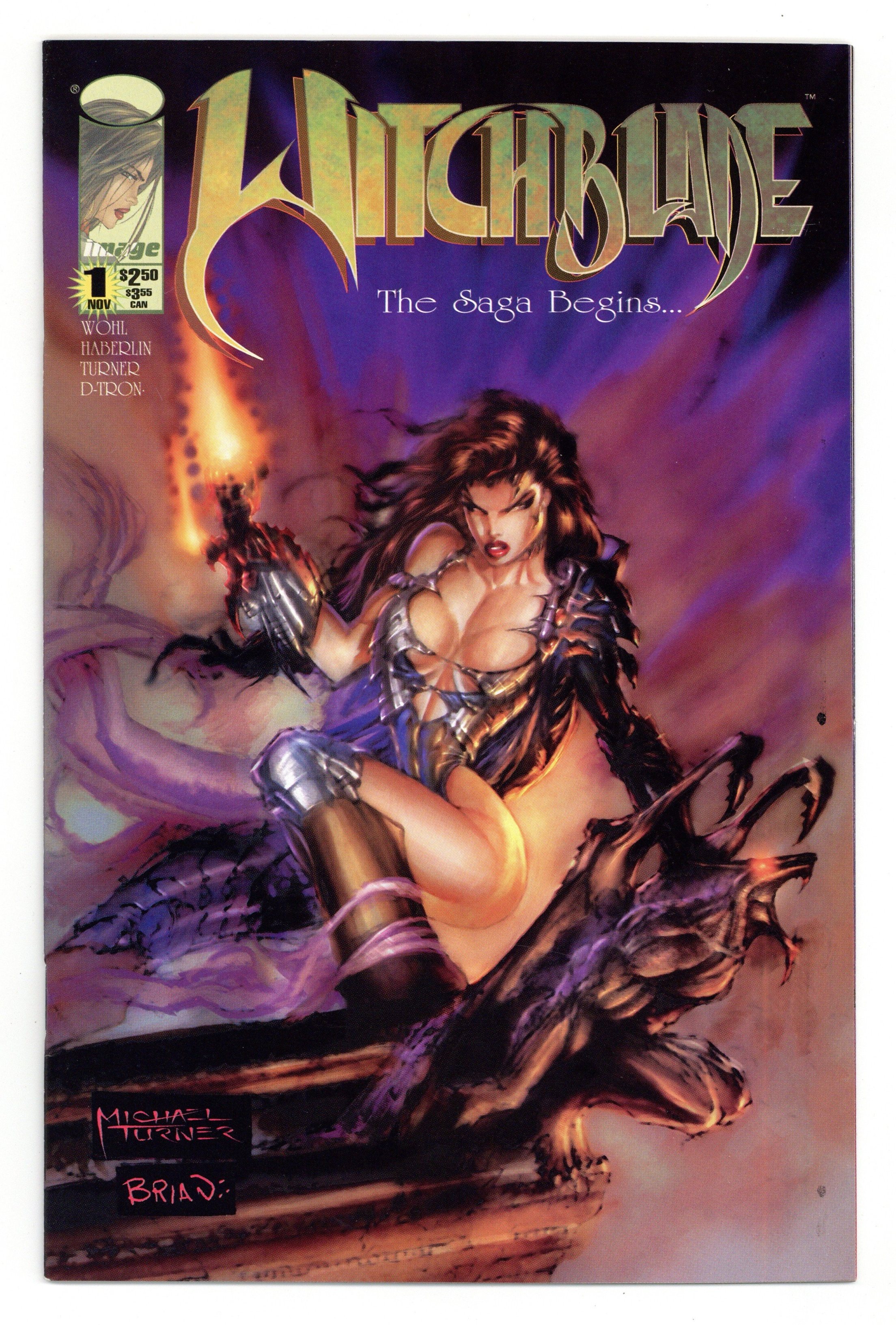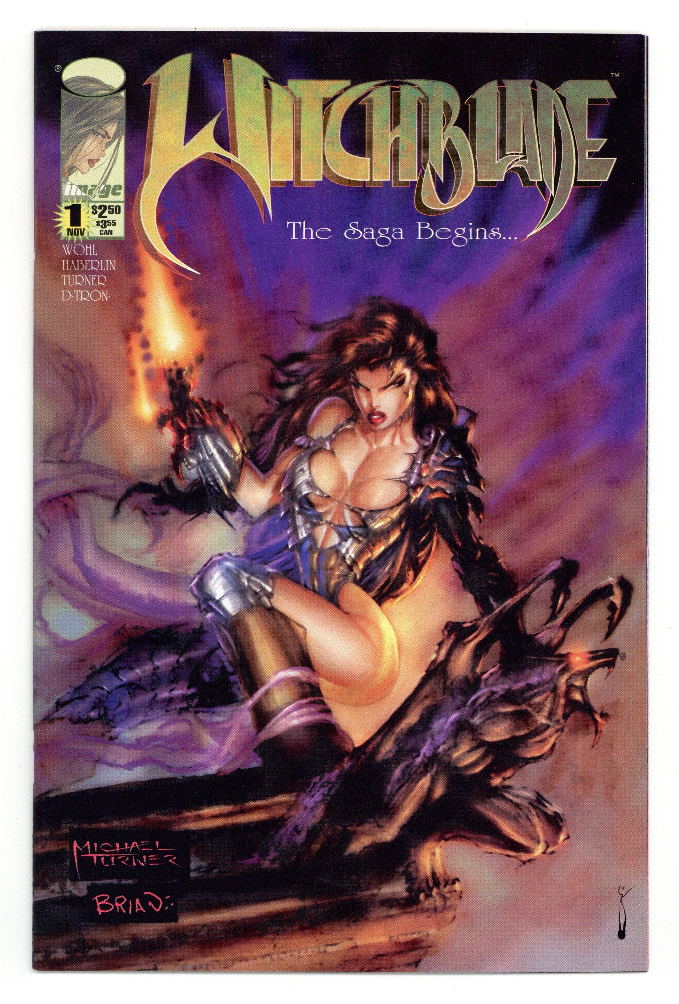 Wraparound cover art by Michael Turner. Untitled Witchblade story, script by David Wohl, Brian Haberlin (co-plot), and Michael Turner (co-plot), pencils by Michael Turner, inks by D-Tron. Police officer Sara Pezzini dresses to kill and engages in an unauthorized sting of a group of local drug dealers; she is chewed out by her boss for her antics and because she endangered her partner, Michael Yee, who was already undercover on the operation. During the interrogation of drug informant Drexler, Sara and Michael learn about something big going down at the old Rialto theatre on that very night, but on their way to the Rialto, Sara and Michael are called to a crime scene where the victim has literally been cooked from the inside out. Superstar businessman Kenneth Irons and his deadly bodyguard, Nottingham, begin their tournament by offering paying attendees a chance to try on a mystic gauntlet called the Witchblade. Sara has snuck in solo and watches in horror as mob boss, Cugliani, sticks his hand into the Witchblade and has it burned off; Irons' men catch Michael lurking about outside and prepare to execute him. 36 pgs. $2.50. Cover price $2.50.