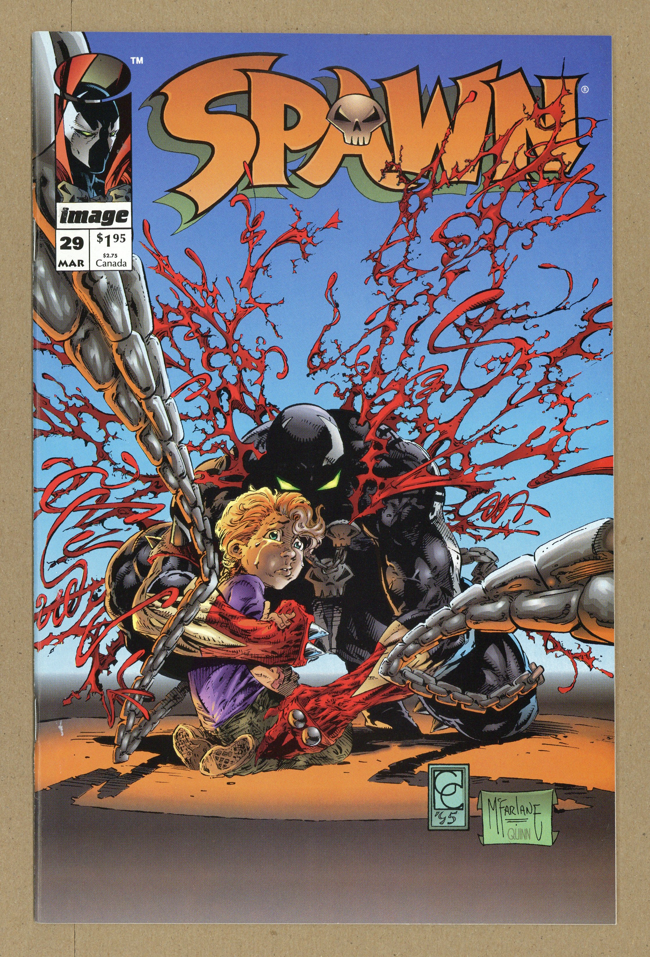 Direct Edition (has no bar code on cover). "Father!" Story by Todd McFarlane. Art by Todd McFarlane and Greg Capullo. Story continued from Angela (1994) #3. Fresh off his battle in Heaven, Spawn lands somewhere in middle America. In this disturbing look at child abuse, Spawn takes an active role in the life a young boy he has befriended. A young boy with an extremely abusive father. Includes a poster of Spawn and Red Star. Cover price $1.95.