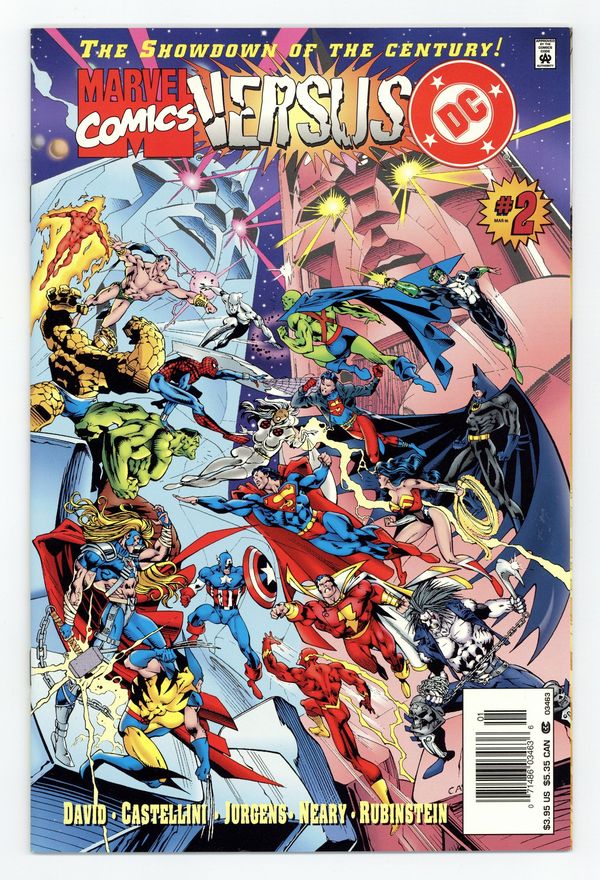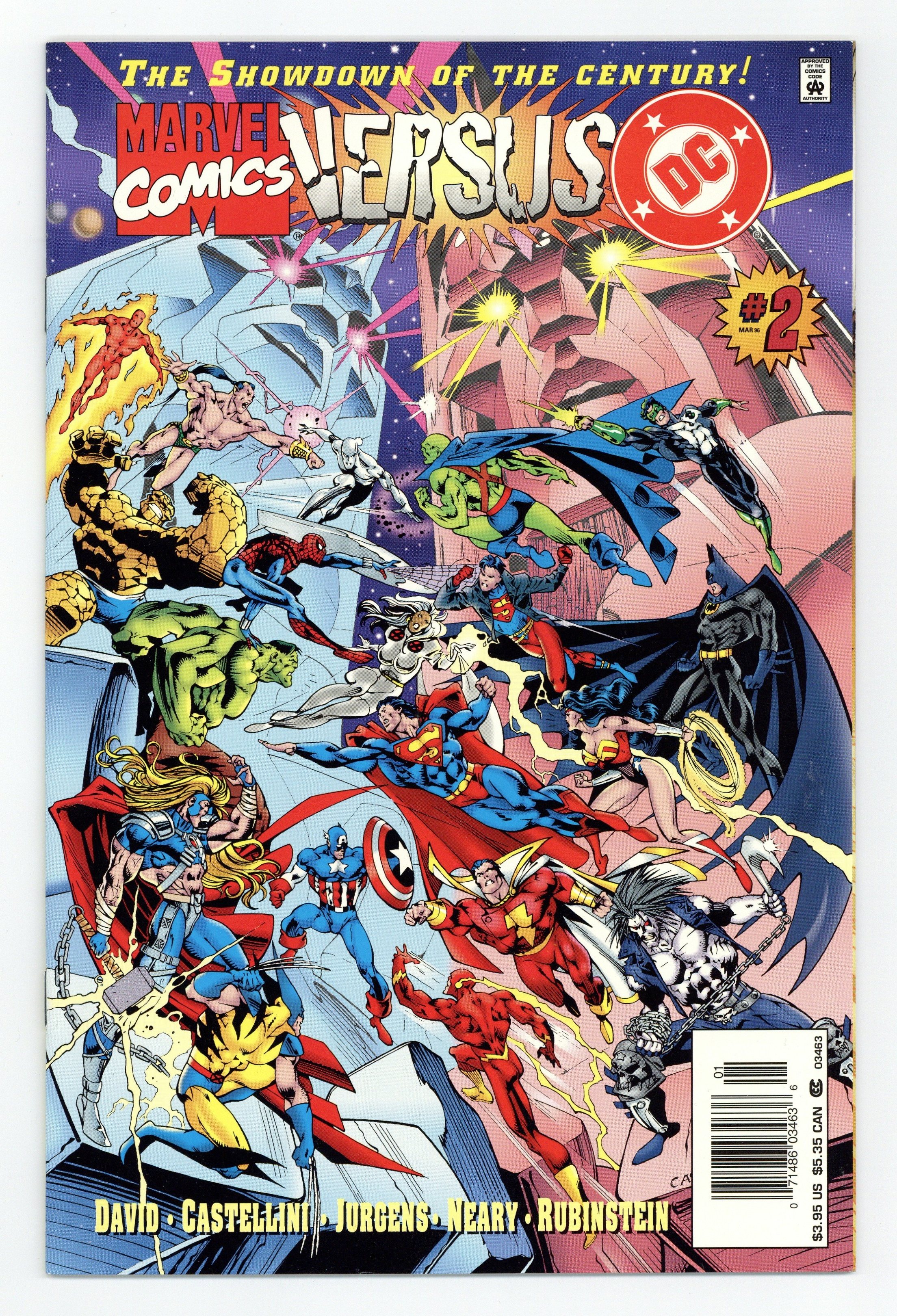 First printing. Newsstand Edition. "Round 2!" Part 2 of 4. Story by Peter David (with special thanks to Ron Marz). Art by Dan Jurgens, Claudio Castellini, Joe Rubenstein, and Paul Neary. In this issue the Lord of Apokolips, Darkseid, confronts the nihilistic Thanos in a battle of ultimate evil. Captain America trades blows with the Venom enhanced Bane, and Wolverine rips through the streets of Gotham in a savage battle with Killer Croc. But, these are just the preliminaries. Thor, the mighty Norse god of thunder, battles Captain Marvel, the emissary of the wizard Shazam and embodiment of Olympian power. Namor, the Savage Sub-Mariner, tangles with Aquaman. Finally, the Flash, Fastest Man Alive and caretaker of the Speedforce, battles the hot-headed Quicksilver. Includes a scoreboard to keep track of the outcomes and dossiers for Jubilee, Robin, Flash, Quicksilver, Thor, Captain Marvel, Catwoman, Elektra, Silver Surfer, Green Lantern, Aquaman, and Sub-Mariner. Cover price $3.95.