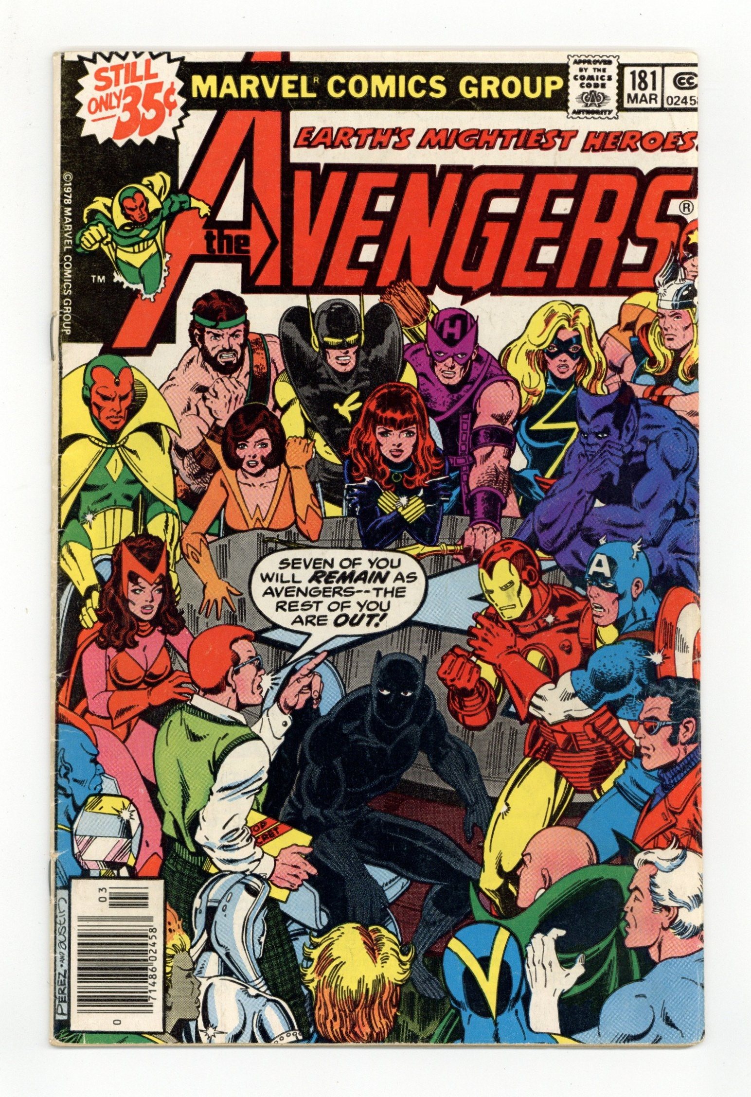 Tags: Marvel Legacy Numbering: Avengers (part 181), Avengers$32.50"On the Matter of Heroes!" Part 1 of 2. Written by David Michelinie. Art by John Byrne (breakdowns) and Gene Day (finishes). Cover by George Perez and Terry Austin. A new era for 'Earth's Mightiest Heroes' begins, and the first order of business is selecting the seven members of the new roster. But this time the federal government is going to help the Avengers choose! Peter Gyrich announces the selections: the Beast, Captain America, Iron Man, Scarlet Witch, Vision, Wasp,...and the Falcon! Hold on, is the Falcon even an avenger? That's what Hawkeye would like to know! Meanwhile, the old man from Vladivostok, Django Maximoff, finally arrives in New York City. And the lives of Pietro and Wanda will never be the same again. Cameo appearances by the Guardians of the Galaxy, Captain Marvel, Ms. Marvel, Black Widow, Hercules, and Moondragon. Note: John Byrne begins his 1-year stint as the regular artist on the series. Note: First appearance of Scott Lang (the second Ant-Man). 36 pgs. Cover price $0.35.