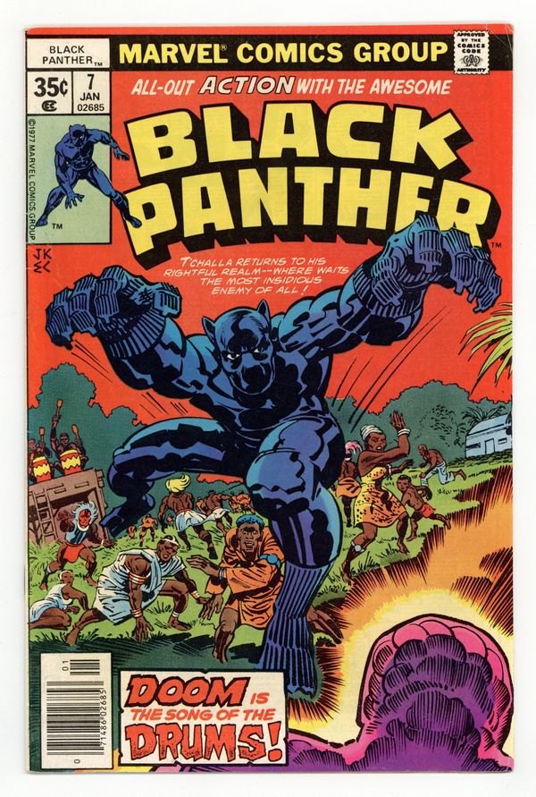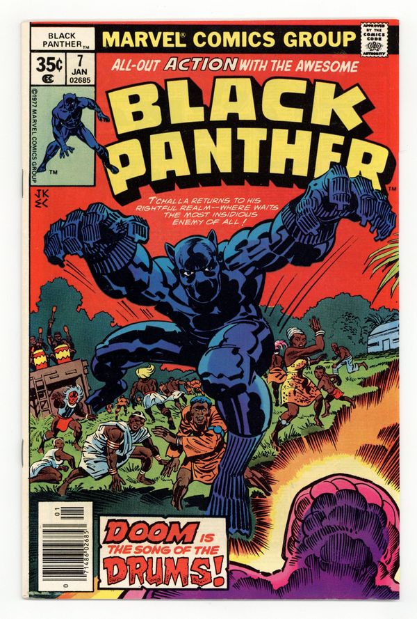 Tags: Marvel Legacy Numbering: Black Panther (part 7), Black Panther$15.00Cover pencils by Jack Kirby, inks by Ernie Chan. Drums!, script and pencils by Jack Kirby, inks by Mike Royer; T'Challa reveals the origin of the Black Panther cult and Wakanda's vibranium mound; Black Panther and Abner Little return to the Collectors and Little reveals he managed to steal a vial of the miracle water from Samurai City; But, the vial is broken in the ensuing fight among the Collectors for the vial and T'Challa returns to Wakanda; In Wakanda, General Jakarra exposes himself to raw vibranium hoping to gain power, but is mutated by the contamination. 32 pgs. $0.35. Cover price $0.35.