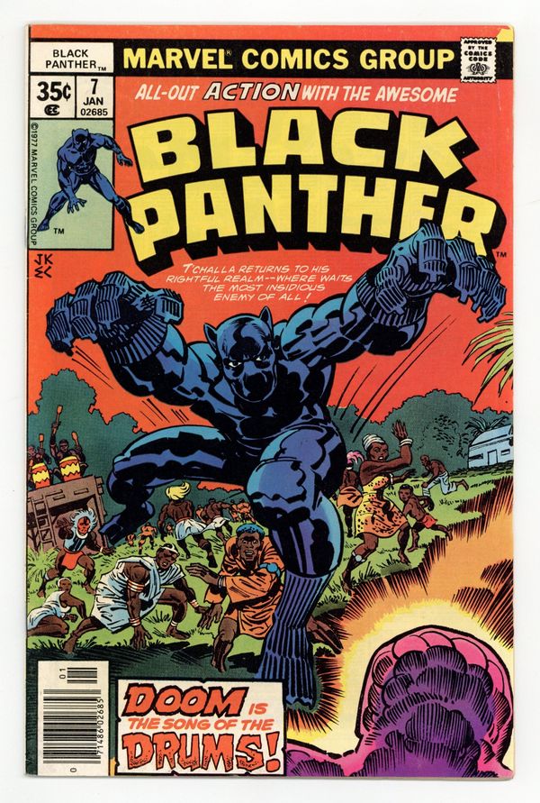 Cover pencils by Jack Kirby, inks by Ernie Chan. Drums!, script and pencils by Jack Kirby, inks by Mike Royer; T'Challa reveals the origin of the Black Panther cult and Wakanda's vibranium mound; Black Panther and Abner Little return to the Collectors and Little reveals he managed to steal a vial of the miracle water from Samurai City; But, the vial is broken in the ensuing fight among the Collectors for the vial and T'Challa returns to Wakanda; In Wakanda, General Jakarra exposes himself to raw vibranium hoping to gain power, but is mutated by the contamination. 32 pgs. $0.35. Cover price $0.35.