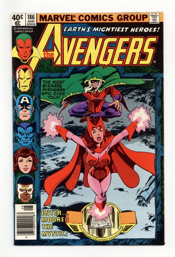 Newsstand Edition. "Nights of Wundagore!" Part 2 of 3. Plot by Mark Gruenwald and Steven Grant. Script by David Michelinie. Pencils by John Byrne. Inks by Dan Green. Cover by John Byrne and Terry Austin. The situation in Transia has taken a turn for the worse! While Bova tells Pietro about his childhood, Wanda wages a life-and-death struggle against Modred the Mystic atop Wundagore Mountain! Unfortunately, the battle goes poorly and an elder demon from centuries ago possesses the Scarlet Witch! Recognizing the imminent danger, Quicksilver makes a mad dash to the only telephone in the village...and places a desperate call to Avengers Mansion! Can the lightning-fast avenger contain his sister's destructive rampage while the other avengers travel to Transia? Hope is fading by the minute! Flashback cameos by the High Evolutionary, Magda, Jonathan Drew, Robert Frank, and Madeline Frank. 36 pages Cover price $0.40.