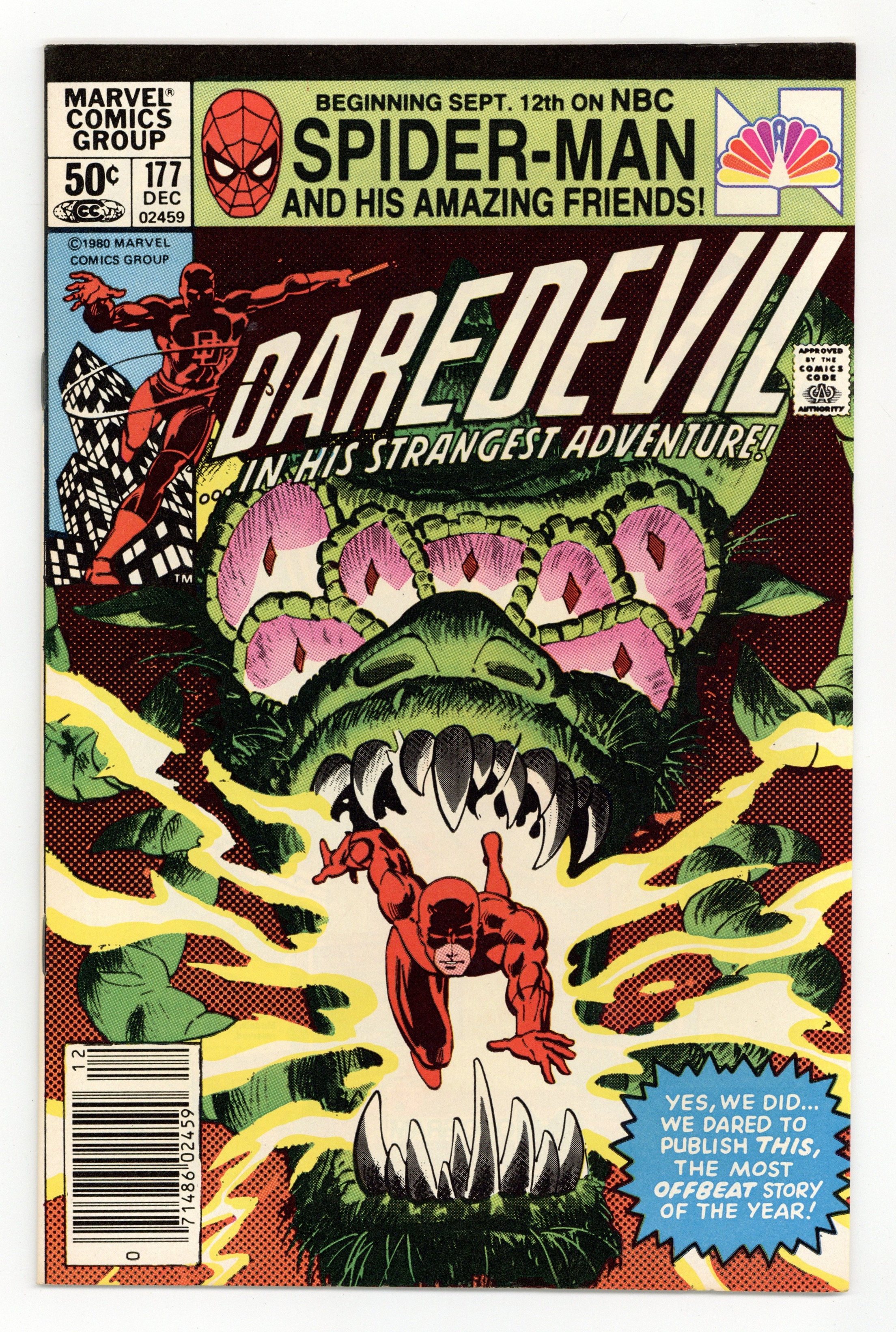 $23.50Newsstand Edition. Last 50-cent issue. Cover pencils by Frank Miller, inks by Klaus Janson. Where Angels Fear To Tread, script by Frank Miller, pencils by Frank Miller (breakdowns) and Klaus Janson (finished art), inks by Klaus Janson; Stick helps his old pupil face his demons and regain his radar sense; The Bugle publishes an expose on Kingpin's candidate for Mayor of New York; Elektra is brought to Kingpin's attention; Daredevil origin retold; Jonah Jameson appearance; cameo by the Hand. 36 pgs. Cover price $0.50. Cover price $0.50.