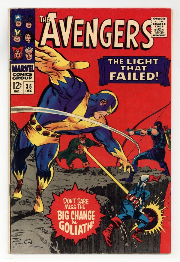 "The Light That Failed!" Part 2 of 2. Plot by Stan Lee and Roy Thomas. Script by Roy Thomas. Art by Don Heck. Cover by Don Heck. The Living Laser has emerged triumphant from his battle against Earth's Mightiest Heroes. And now with the winsome Wasp as his prisoner, the laser-focused villain moves on to his next endeavor! Strangely enough...and for several million dollars, Arthur Parks is going to help overthrow the government of Costa Verde -- a country in Central America. However news of the Living Laser's involvement in Costa Verde's civil war reaches Avengers Mansion! So Cap, Hawkeye, and Goliath know where to find him! When the Avengers arrive south of the border, the non-stop action starts! The Living Laser and his new laser cannon are very formidable. Thus it will take a dangerous gamble by Hank Pym to save the day! Go to the ants! Cameo appearances by Dr. Bill Foster and the Black Widow. (Notes: Jack Kirby and Frank Giacoia contributed the drawing of Captain America to the cover. This issue begins Roy Thomas' five-and-a-half-year run as the writer of the Avengers title. The letters page includes a letter from comics artist Dave Cockrum. This story was reprinted in Marvel Triple Action #27.) 36 pages. Cover price $0.12.