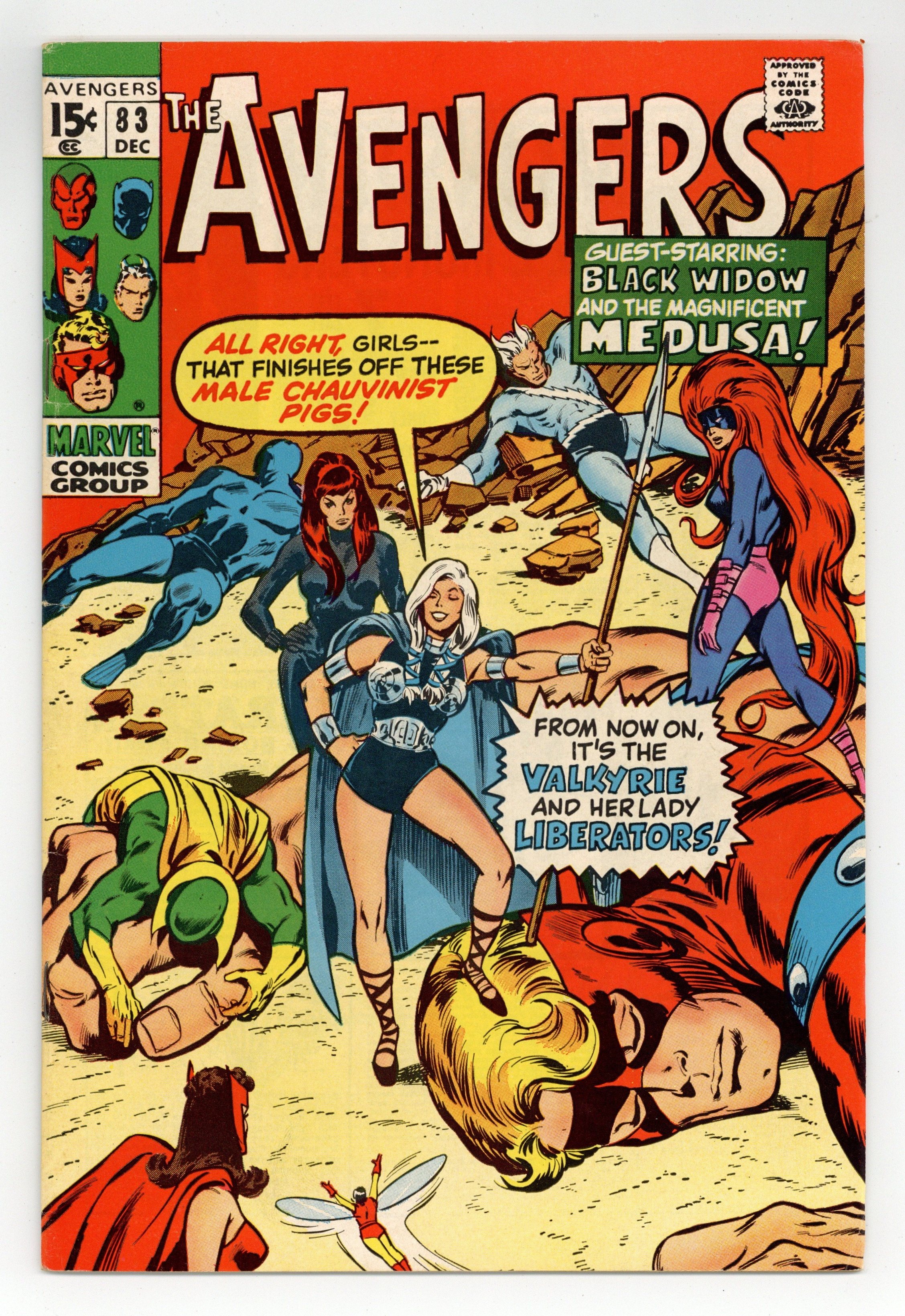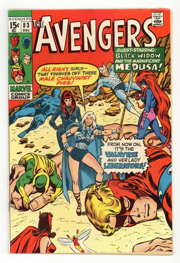 Tags: Marvel Legacy Numbering: Avengers (part 83), Avengers$46.50"Come on in, the Revolution's Fine!" Guest-starring Medusa and the Black Widow. Script by Roy Thomas. Pencils by John Buscema. Inks by Tom Palmer. Cover by John Buscema and Tom Palmer. One of the landmark issues of the bronze age! While Earth's Mightiest Heroes participate in the Halloween parade in Rutland, Vermont; something very strange is taking place at Avengers Mansion! A new superhero called the Valkyrie assembles the Wasp, Scarlet Witch, Black Widow, and Medusa for a special ladies only meeting! The manipulative Valkyrie (with an Asgardian accent) convinces the four heroines to form their own group called the Lady Liberators! And take revenge on their male counterparts in the Avengers! Wow, women's lib to the max! But minutes before the liberators arrive in the green mountain state, the Masters of Evil ambush the Avengers' parade float! Earth's Mightiest Heroes reel under the Masters of Evil's surprise assault until the Lady Liberators strike back…against both teams! Pure chaos in the streets of Rutland! Who could orchestrate such a wild affair? Only an enchanting foe from years ago! Truly an Avengers classic! Cameo appearances by Roy Thomas, Jean Thomas, and Tom Fagan. Cameo Halloween costume appearances by Batman, Captain America, Daredevil, Deadman, Doctor Doom, Dr. Strange, Nighthawk, Sub-Mariner, Thor, and the Red Skull. Flashback cameos by Odin and the Executioner. Masters of Evil Lineup: Klaw, Melter, Whirlwind, and the Radioactive Man. Avengers Lineup: Black Panther, Goliath, Quicksilver, Scarlet Witch, Vision, and the Wasp. (Notes: This is the first appearance or incarnation of the Valkyrie; but not the one of long-time Defenders fame. The next Valkyrie appears in Incredible Hulk 142. This issue was reprinted in Marvel Treasury Edition 7 (published in 1975) and again in Marvel Illustrated Books: The Avengers -- Origin of the Vision (published in 1982). The Avengers return to Rutland for another Halloween parade in Avengers 119.) 36 pgs. Cover price $0.15.