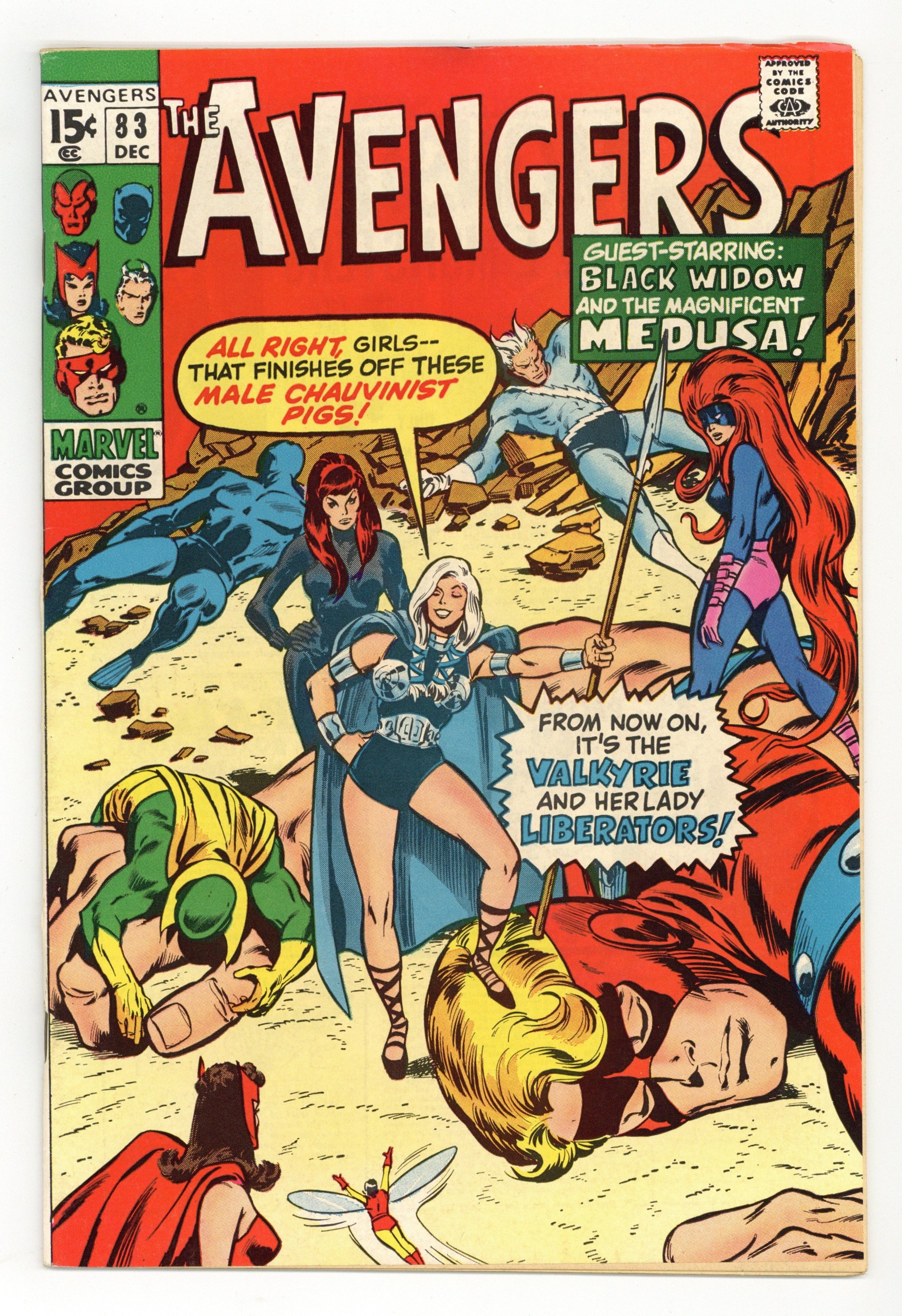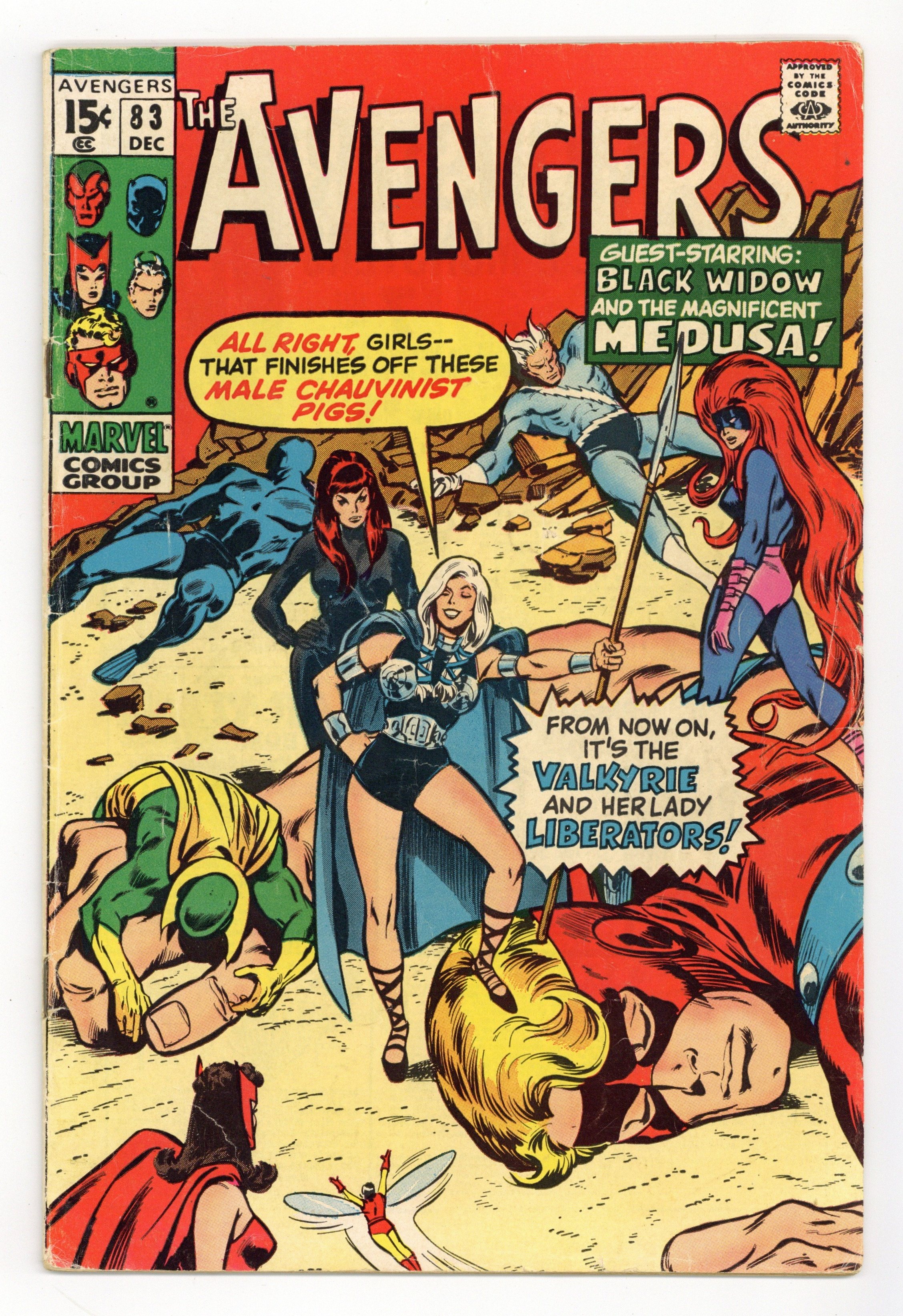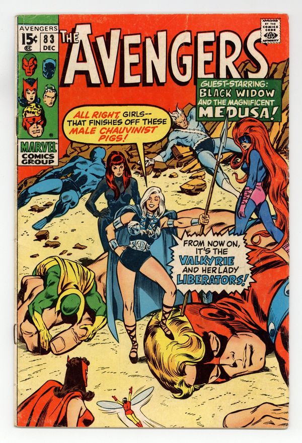 Tags: Marvel Legacy Numbering: Avengers (part 83), Avengers$37.00"Come on in, the Revolution's Fine!" Guest-starring Medusa and the Black Widow. Script by Roy Thomas. Pencils by John Buscema. Inks by Tom Palmer. Cover by John Buscema and Tom Palmer. One of the landmark issues of the bronze age! While Earth's Mightiest Heroes participate in the Halloween parade in Rutland, Vermont; something very strange is taking place at Avengers Mansion! A new superhero called the Valkyrie assembles the Wasp, Scarlet Witch, Black Widow, and Medusa for a special ladies only meeting! The manipulative Valkyrie (with an Asgardian accent) convinces the four heroines to form their own group called the Lady Liberators! And take revenge on their male counterparts in the Avengers! Wow, women's lib to the max! But minutes before the liberators arrive in the green mountain state, the Masters of Evil ambush the Avengers' parade float! Earth's Mightiest Heroes reel under the Masters of Evil's surprise assault until the Lady Liberators strike back…against both teams! Pure chaos in the streets of Rutland! Who could orchestrate such a wild affair? Only an enchanting foe from years ago! Truly an Avengers classic! Cameo appearances by Roy Thomas, Jean Thomas, and Tom Fagan. Cameo Halloween costume appearances by Batman, Captain America, Daredevil, Deadman, Doctor Doom, Dr. Strange, Nighthawk, Sub-Mariner, Thor, and the Red Skull. Flashback cameos by Odin and the Executioner. Masters of Evil Lineup: Klaw, Melter, Whirlwind, and the Radioactive Man. Avengers Lineup: Black Panther, Goliath, Quicksilver, Scarlet Witch, Vision, and the Wasp. (Notes: This is the first appearance or incarnation of the Valkyrie; but not the one of long-time Defenders fame. The next Valkyrie appears in Incredible Hulk 142. This issue was reprinted in Marvel Treasury Edition 7 (published in 1975) and again in Marvel Illustrated Books: The Avengers -- Origin of the Vision (published in 1982). The Avengers return to Rutland for another Halloween parade in Avengers 119.) 36 pgs. Cover price $0.15.