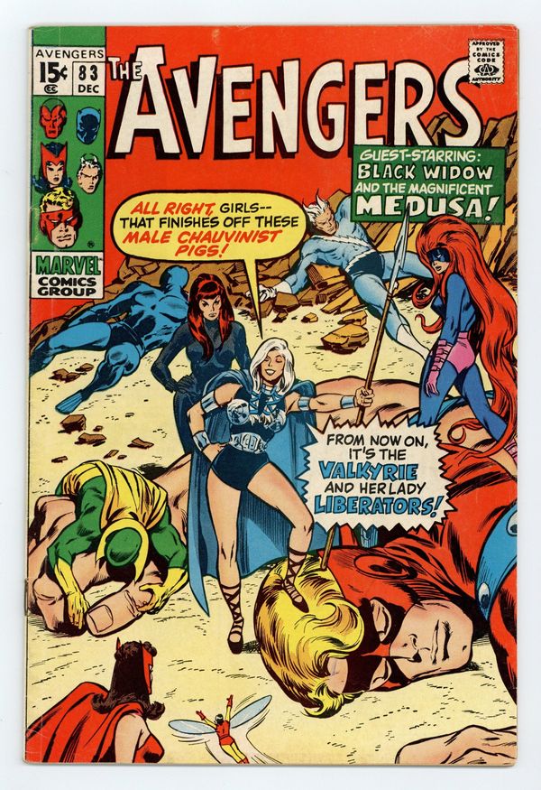 Tags: Marvel Legacy Numbering: Avengers (part 83), Avengers$33.00"Come on in, the Revolution's Fine!" Guest-starring Medusa and the Black Widow. Script by Roy Thomas. Pencils by John Buscema. Inks by Tom Palmer. Cover by John Buscema and Tom Palmer. One of the landmark issues of the bronze age! While Earth's Mightiest Heroes participate in the Halloween parade in Rutland, Vermont; something very strange is taking place at Avengers Mansion! A new superhero called the Valkyrie assembles the Wasp, Scarlet Witch, Black Widow, and Medusa for a special ladies only meeting! The manipulative Valkyrie (with an Asgardian accent) convinces the four heroines to form their own group called the Lady Liberators! And take revenge on their male counterparts in the Avengers! Wow, women's lib to the max! But minutes before the liberators arrive in the green mountain state, the Masters of Evil ambush the Avengers' parade float! Earth's Mightiest Heroes reel under the Masters of Evil's surprise assault until the Lady Liberators strike back…against both teams! Pure chaos in the streets of Rutland! Who could orchestrate such a wild affair? Only an enchanting foe from years ago! Truly an Avengers classic! Cameo appearances by Roy Thomas, Jean Thomas, and Tom Fagan. Cameo Halloween costume appearances by Batman, Captain America, Daredevil, Deadman, Doctor Doom, Dr. Strange, Nighthawk, Sub-Mariner, Thor, and the Red Skull. Flashback cameos by Odin and the Executioner. Masters of Evil Lineup: Klaw, Melter, Whirlwind, and the Radioactive Man. Avengers Lineup: Black Panther, Goliath, Quicksilver, Scarlet Witch, Vision, and the Wasp. (Notes: This is the first appearance or incarnation of the Valkyrie; but not the one of long-time Defenders fame. The next Valkyrie appears in Incredible Hulk 142. This issue was reprinted in Marvel Treasury Edition 7 (published in 1975) and again in Marvel Illustrated Books: The Avengers -- Origin of the Vision (published in 1982). The Avengers return to Rutland for another Halloween parade in Avengers 119.) 36 pgs. Cover price $0.15.