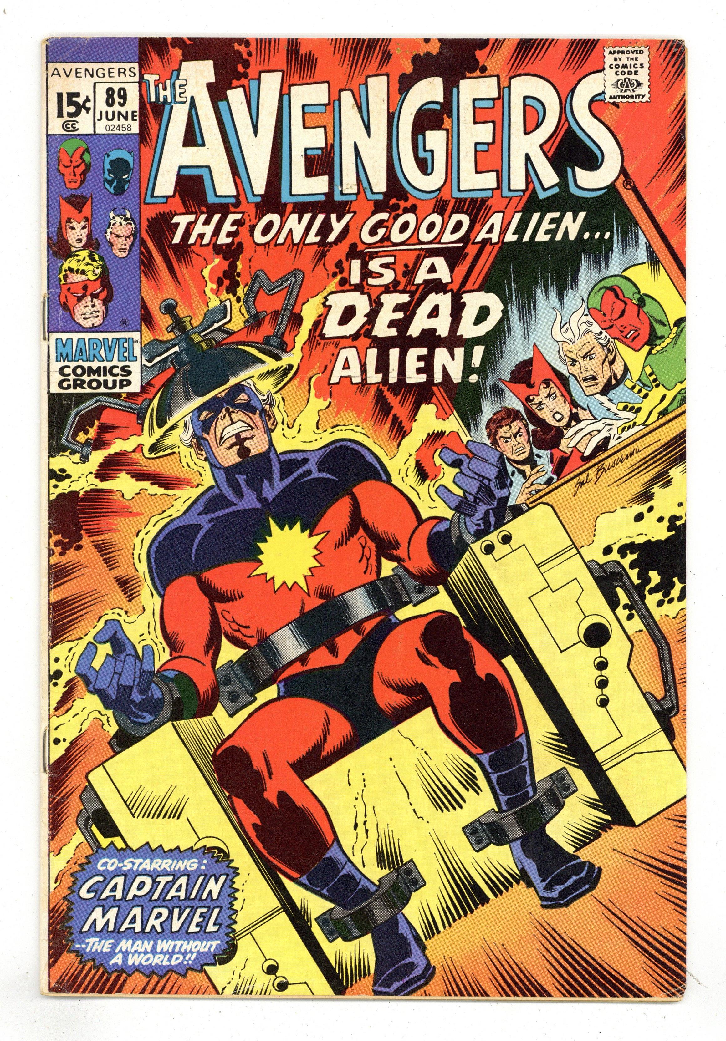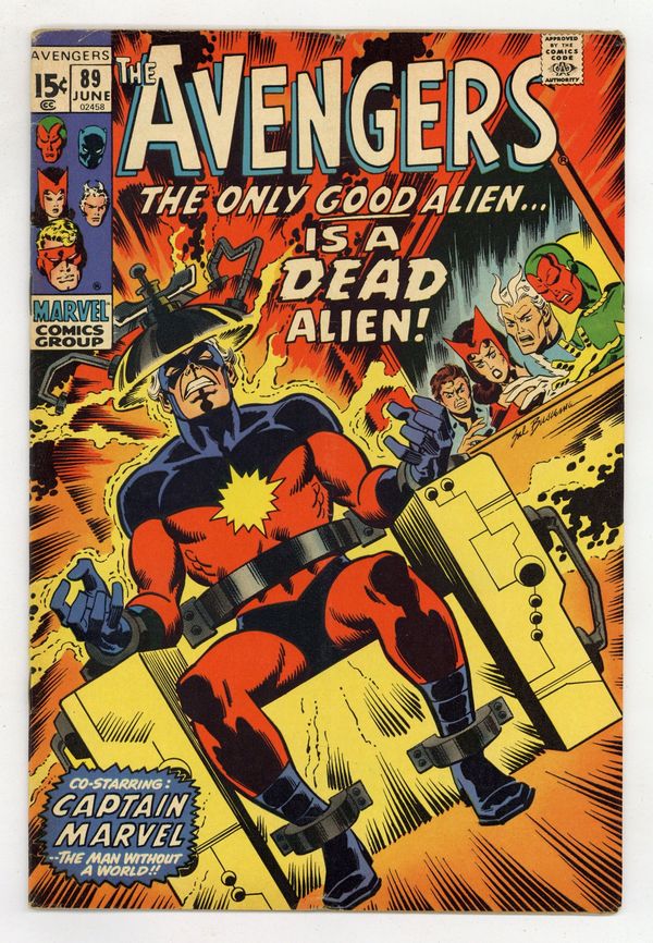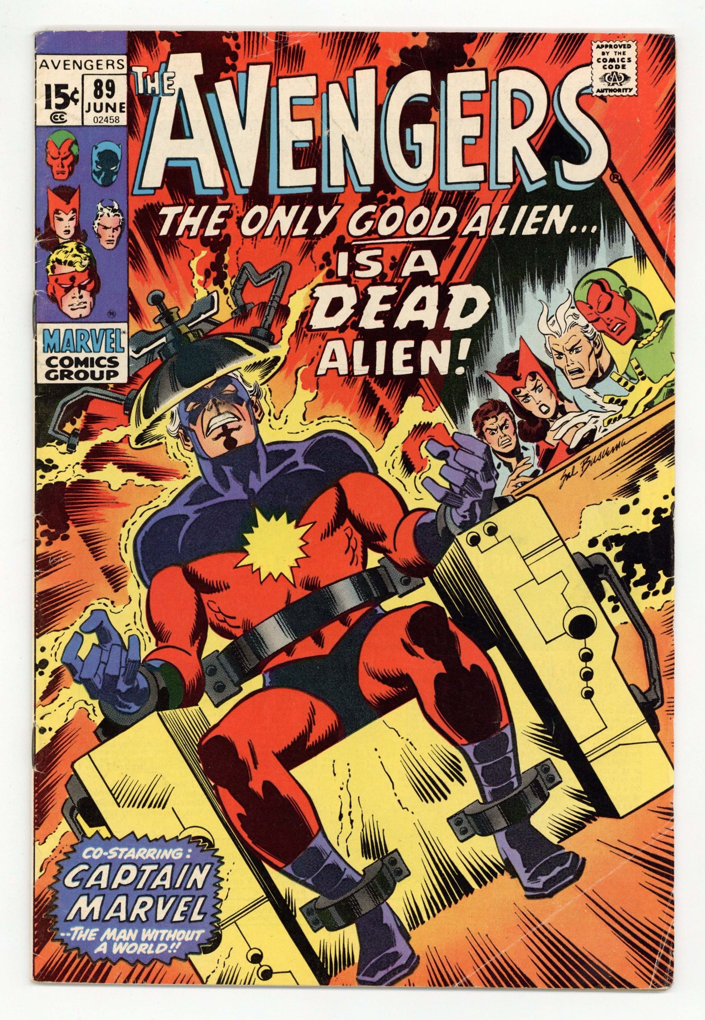 "The Only Good Alien... " Part 1 of 9. Guest-starring Captain Marvel. Script by Roy Thomas. Pencils by Sal Buscema. Inks by Sam Grainger. Cover by Sal Buscema. The classic Kree/Skrull War storyline starts with a bang as Earth's Mightiest Heroes and Rick Jones pursue Captain Marvel on the streets of Miami! Wow, why are the Avengers chasing the Kree Warrior? Especially after Wanda, Pietro, and the Vision just fought alongside him several hours ago in the Baxter Building vs. Annihilus! Dangerously though, the cosmic superhero's body is teeming with deadly radiation after spending too much time in the Negative Zone! Once the Avengers capture Captain Marvel, they take him to Cape Canaveral in hopes of saving his life! Meanwhile on Hala, the Kree homeworld, Ronan the Accuser leads a rebellion against the Supreme Intelligence! Ronan's actions will have immediate and far-reaching effects on the Milky Way Galaxy and of course Earth's Mightiest Heroes! Cameo appearance by Sentry 459. Flashback cameo by Mr. Fantastic to recap his escape from the Negative Zone in Fantastic Four 110. Avengers Lineup: Quicksilver, Scarlet Witch, and the Vision. (Notes: Captain Marvel's participation in the Kree/Skrull War occurs while his own series was on a 2-year hiatus. Ronan previously appeared in Captain Marvel 16. Annihilus appears next in Marvel Team-Up 2. The full Kree/Skrull War saga was reprinted in 2000 in the trade paperback: The Avengers -- The Kree-Skrull War.) 36 pages. Cover price $0.15.