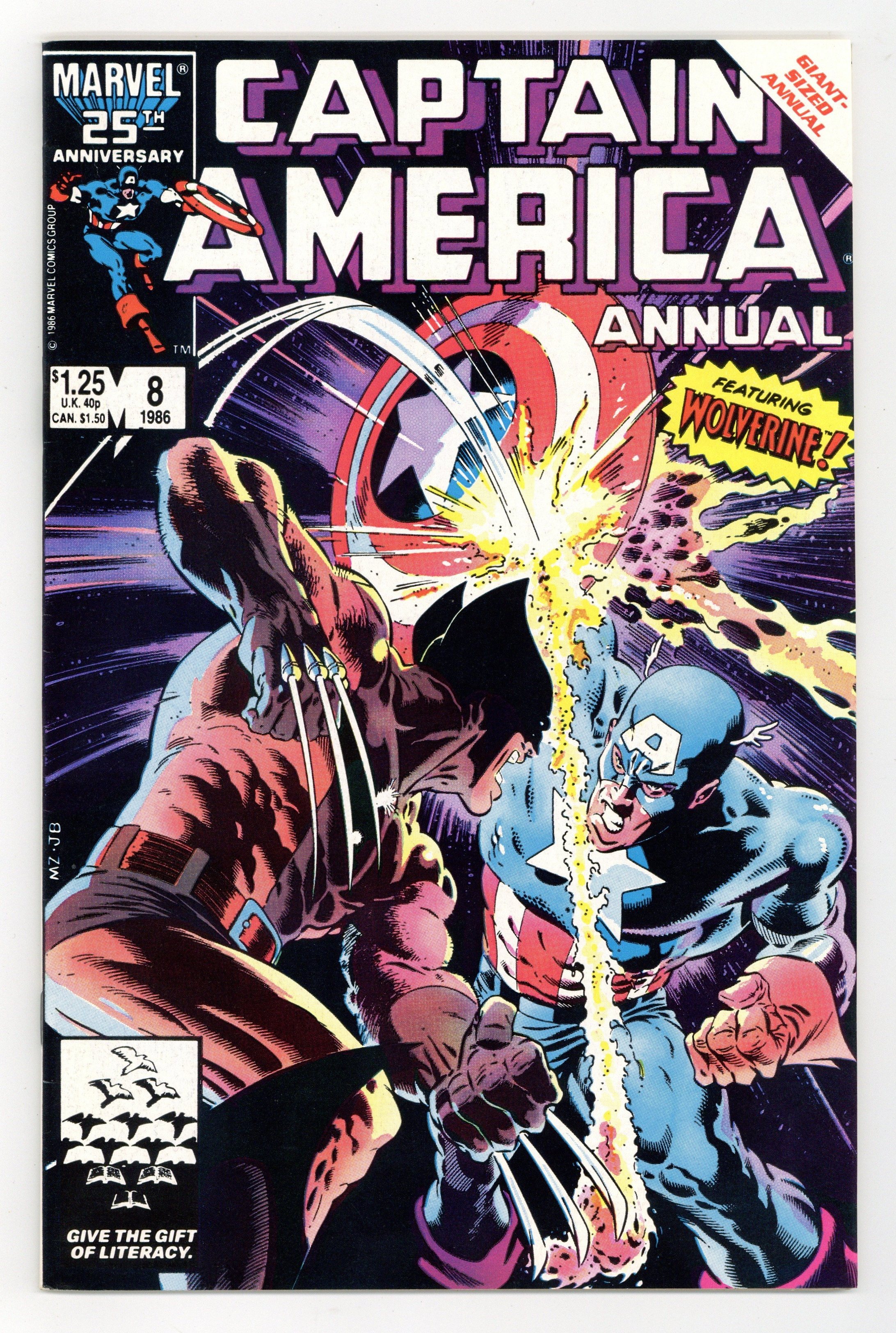 Direct Edition. "TESS-One" Guest-starring Wolverine. Script by Mark Gruenwald. Pencils by Mike Zeck. Inks by John Beatty and Joe Rubinstein. Cover by Mike Zeck and John Beatty. Captain America and Wolverine face off against a super-soldier killing robot in an attempt to avert a nuclear disaster! First appearance of TESS-One. Appearance by Bob Frank Jr. (aka Nuklo, son of the golden age Whizzer). Flashback cameo by President Franklin Delano Roosevelt. (Notes: TESS-One returns in Avengers 288. Overrider appears again in Nick Fury Agent of SHIELD (3rd series) 33. The plot in this annual resembles the story in Avengers Annual 9.) 52 pgs., $1.25 Cover price $1.25.