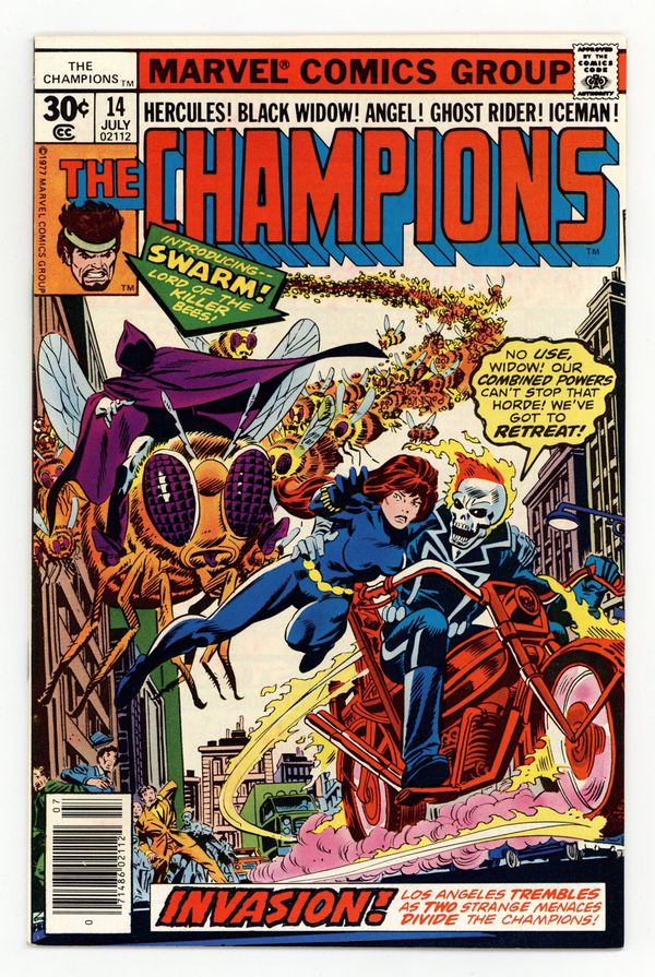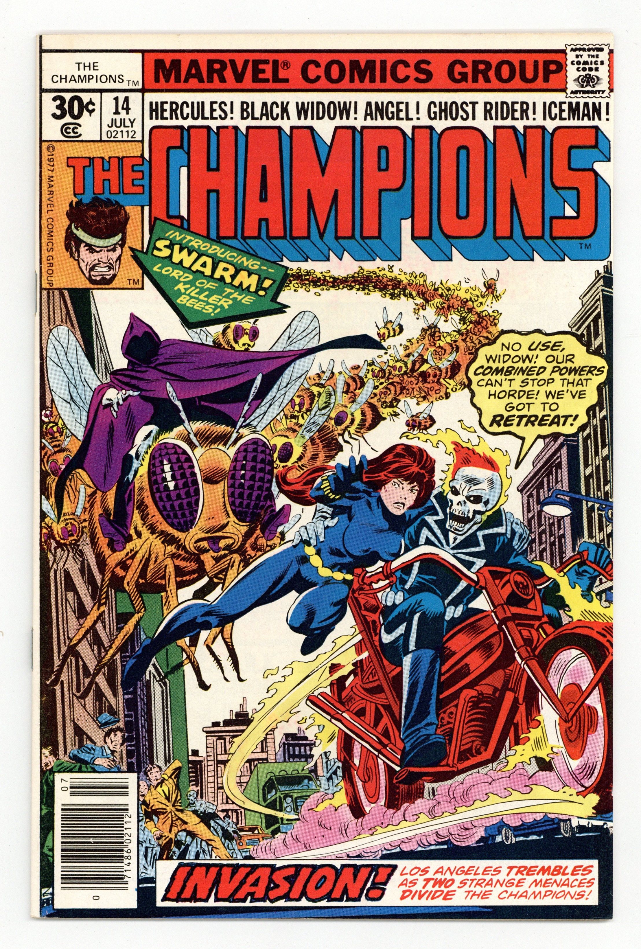 "The Creature called Swarm!" Part 1 of 2. Story by Bill Mantlo. Art by John Byrne and Mike Esposito. Introducing the menace of Swarm (1st appearance)! Can the Champions hope to defeat a fiend who can control the stings of millions of bees? What is this mysterious villain after, and what does it mean for the future of mankind? Meanwhile, Hercules and Ice Man are attacked by the Champions' headquarter's own defenses? Plus, the team says goodbye to one of their own. NOTE: Swarm made a memorable appearance in the "Spider-Man and His Amazing Friends" Saturday morning cartoon a few years after the release of this issue. - Odinson, Lone Star Comics Archivist Cover price $0.30.
