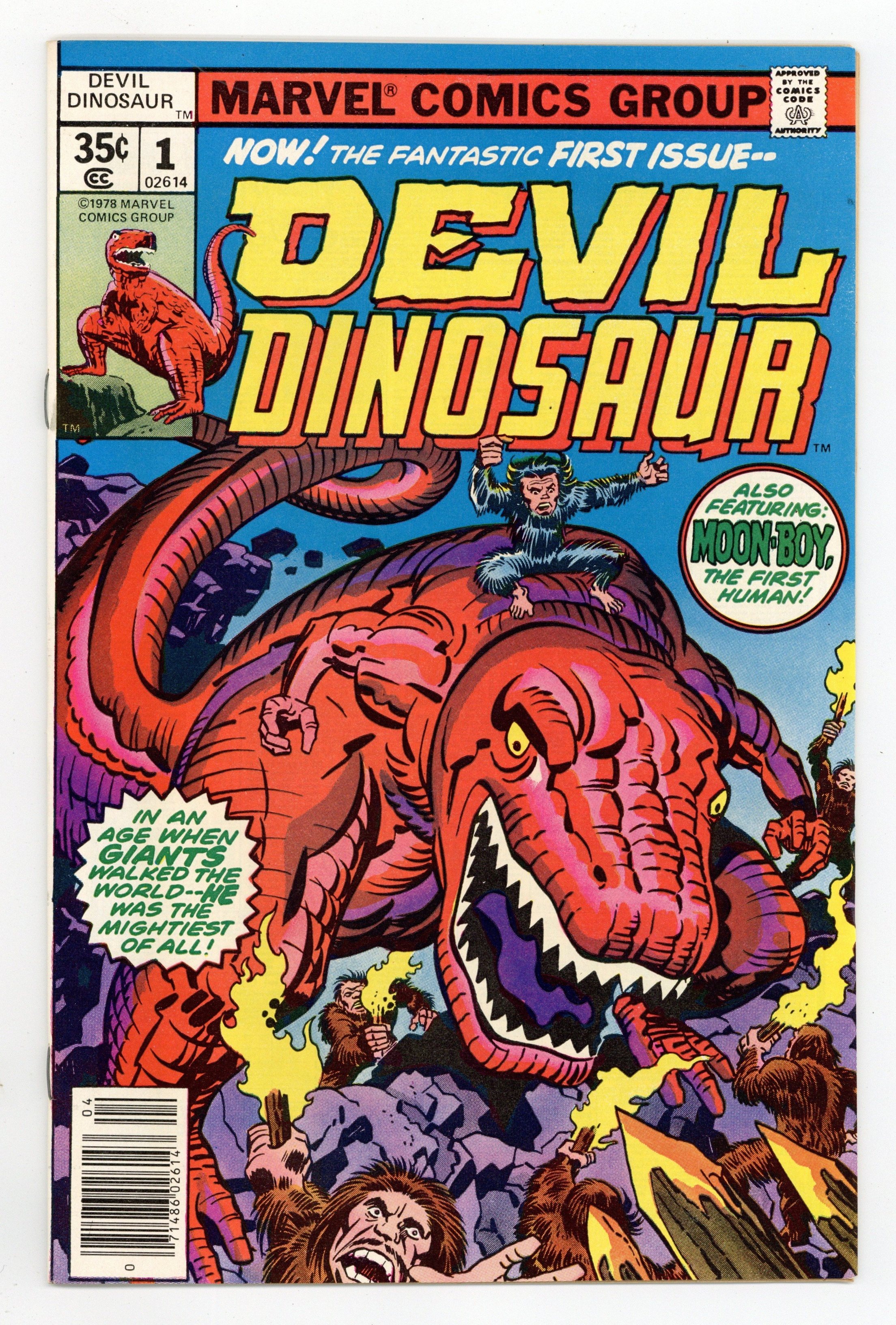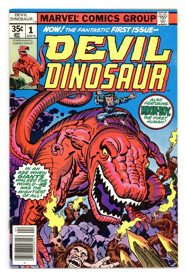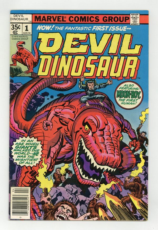 Cover pencils by Jack Kirby, inks by Frank Giacoia. Devil Dinosaur and Moon-Boy, script by Jack Kirby, pencils by Jack Kirby, inks by Mike Royer; Deep in the Valley of the Flame, Moon-Boy reveals the origins of Devil Dinosaur; Is the red-skinned and red-eyed Dino as menacing as the town-folk believe? 36 pgs., full color. $0.35. Cover price $0.35.