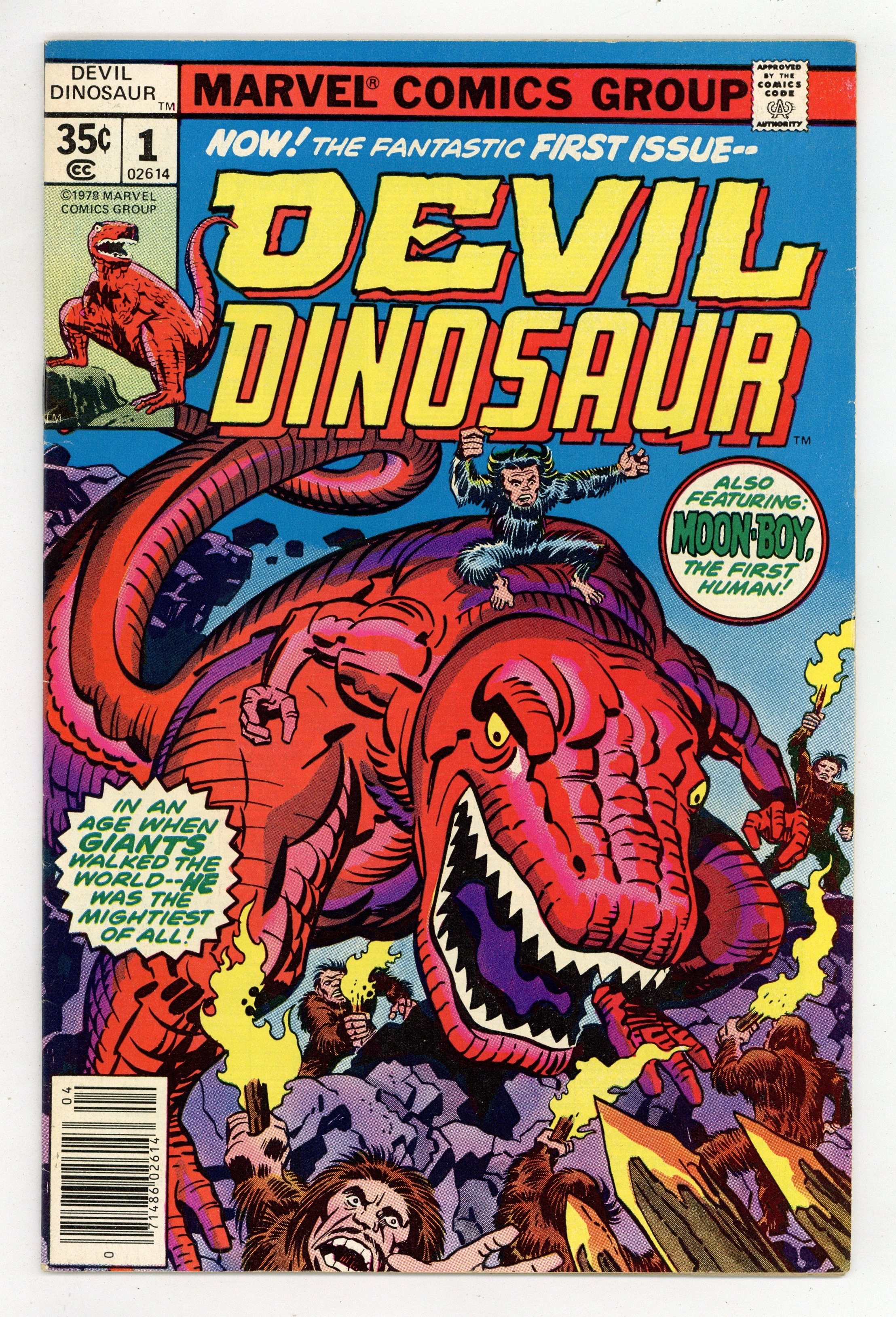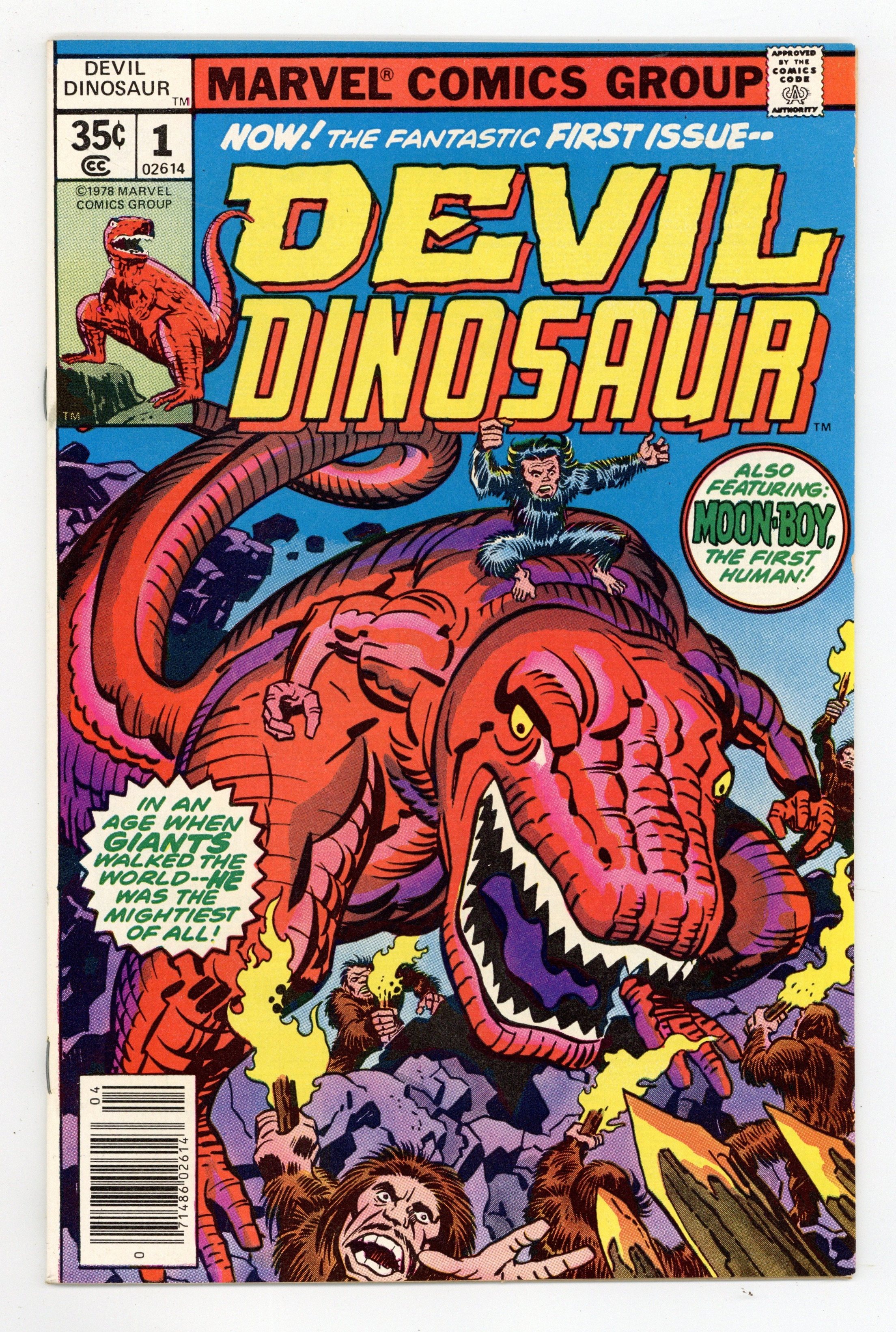 $18.00Cover pencils by Jack Kirby, inks by Frank Giacoia. Devil Dinosaur and Moon-Boy, script by Jack Kirby, pencils by Jack Kirby, inks by Mike Royer; Deep in the Valley of the Flame, Moon-Boy reveals the origins of Devil Dinosaur; Is the red-skinned and red-eyed Dino as menacing as the town-folk believe? 36 pgs., full color. $0.35. Cover price $0.35.