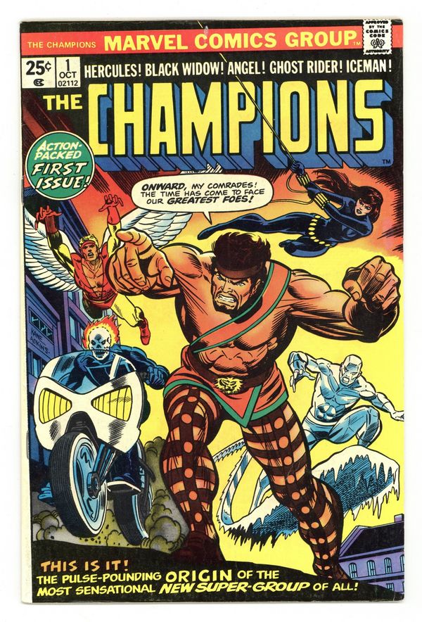 "The World Still needs the Champions!" Part 1 of 3. Story by Tony Isabella. Art by Don Heck and Mike Esposito. Cover by Gil Kane and Dan Adkins. Courage made them heroes - Fate made them Champions! Can a former super-spy, two mutants, a demi-god, and a demon carry on in the tradition of the mighty Avengers and Fantastic Four? Black Widow, Ice Man, Angel, Hercules, and Ghost Rider must unite to defend the Olympic goddess, Venus, from the evil machinations of Pluto, Lord of the Underworld, Ares, God of War, and Hyppolyta, Queen of the Amazons. Cover price $0.25.