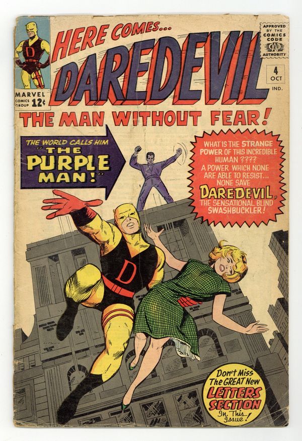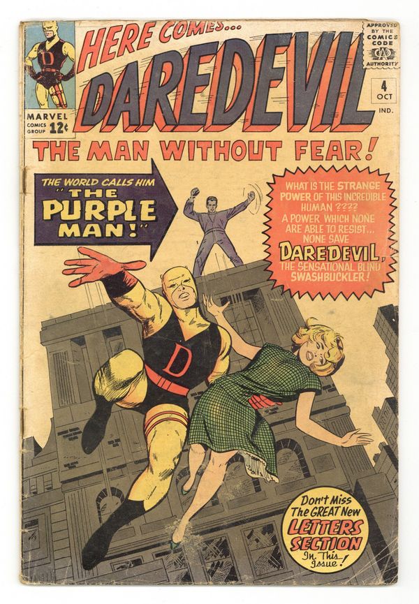 Cover pencils by Jack Kirby, inks by Vince Colletta. First appearance of the Purple Man in Killgrave, the Unbelievable Purple Man!, script by Stan Lee, pencils by Joe Orlando, inks by Vince Colletta; DD runs up against a purple man who can make anyone do what he wants just by suggesting it. First letters page. 36 pgs. Cover price $0.12. Cover price $0.12.