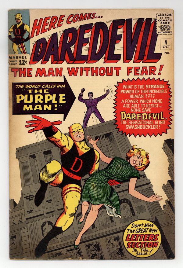 Starts Jan 3 Cover pencils by Jack Kirby, inks by Vince Colletta. First appearance of the Purple Man in Killgrave, the Unbelievable Purple Man!, script by Stan Lee, pencils by Joe Orlando, inks by Vince Colletta; DD runs up against a purple man who can make anyone do what he wants just by suggesting it. First letters page. 36 pgs. Cover price $0.12. Cover price $0.12.