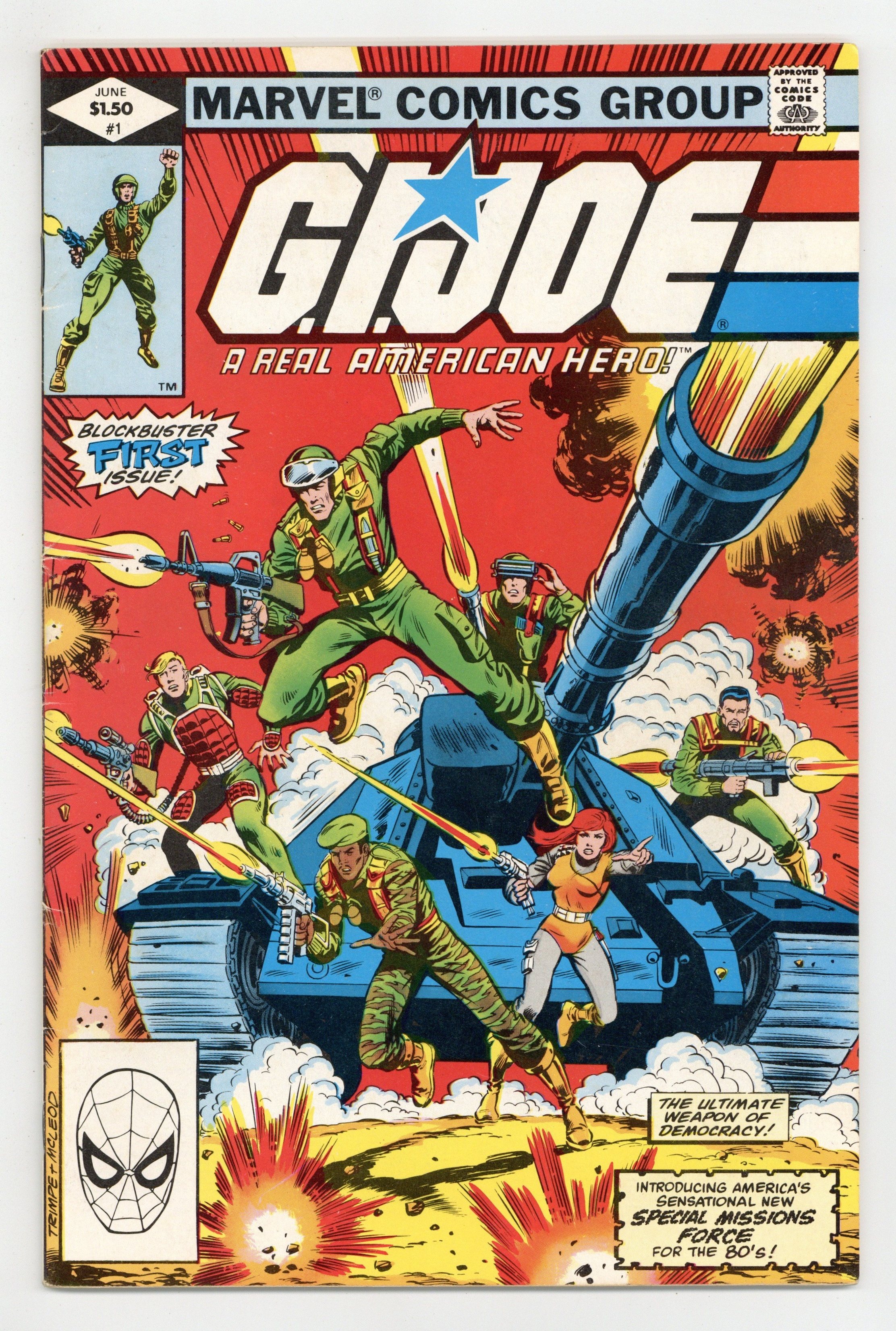 Direct Edition. Giant size issue - "Operation: Lady Doomsday!" Written by Larry Hama. Art by Herb Trimpe and Bob McLeod. Cobra is a sinister terrorist organization bent on world domination! There is only one thing standing in their way - GI Joe, the free world's elite strike force and a band of highly trained super soldiers who fight for freedom, justice and the American way. Yo, Joe! 1st appearance of Hawk, Snake-eyes, Scarlett, Clutch, Rock 'n' Roll, Stalker, Breaker, Flash, Grand Slam, Short-Fuse, Grunt, Cobra Commander and the Baroness. Includes back-up story "Hot Potato!" Written by Larry Hama. Art by Don Perlin and Jack Abel. Starring Snake-eyes, Scarlett, and Rock 'n' Roll. Also includes a 2-page diagram of "The Pit," the G.I. Joe Command Center. 52 pages, FC. Cover price $1.50.
