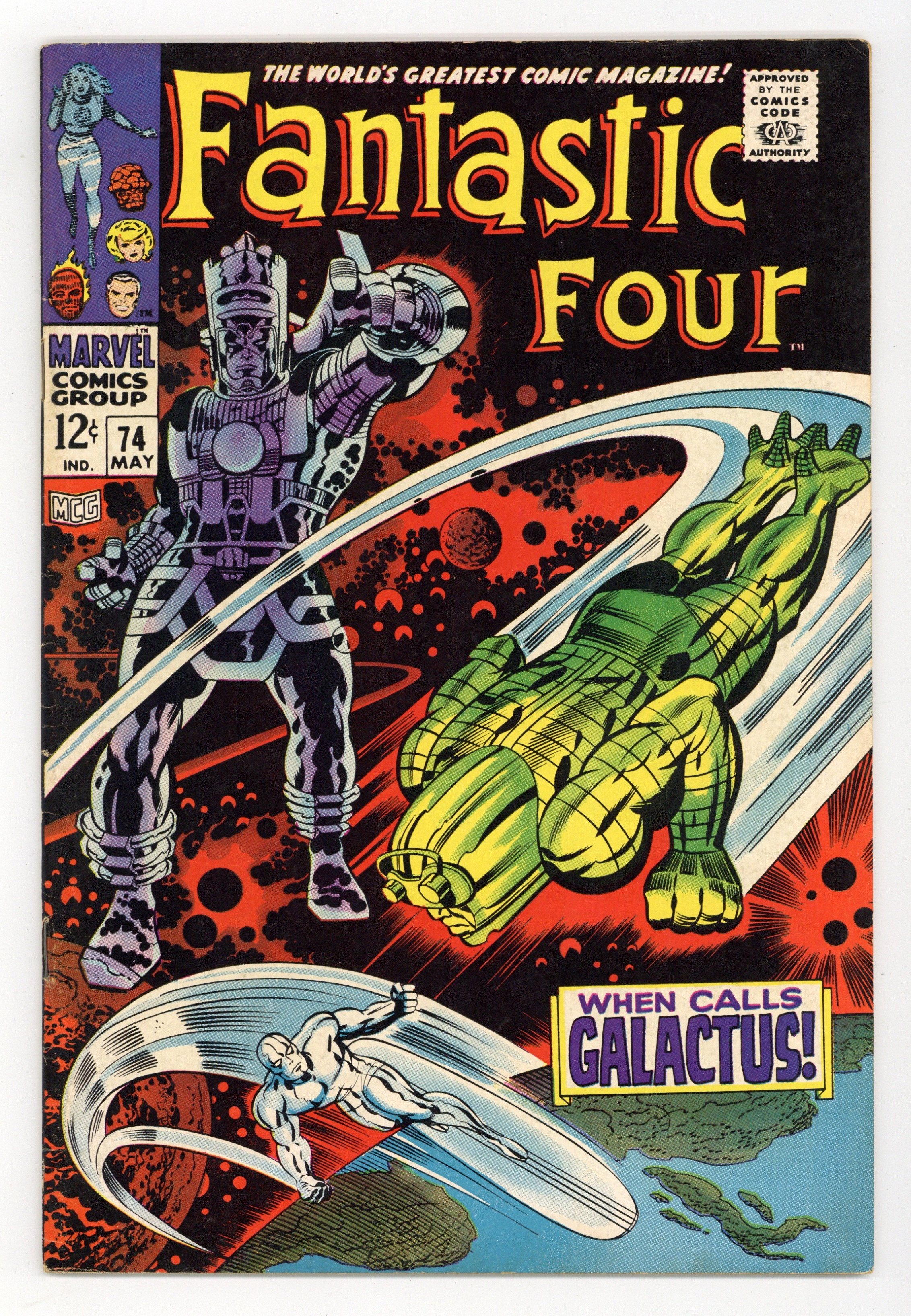 Cover pencils by Jack Kirby, inks by Joe Sinnott. The Silver Surfer, Galactus, and Crystal (of the Inhumans) guest star in When Calls Galactus, script by Stan Lee and Jack Kirby (co-plot), pencils by Jack Kirby, inks by Joe Sinnott; Galactus dispatches his Punisher to retrieve the Surfer who is protected by the FF. Letters to the editor from comics writers Don McGregor and Tony Isabella. Kirby/Sinnott cover. Reprinted in Marvel's Greatest Comics # 56. 36 pgs. Cover price $0.12.