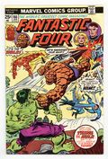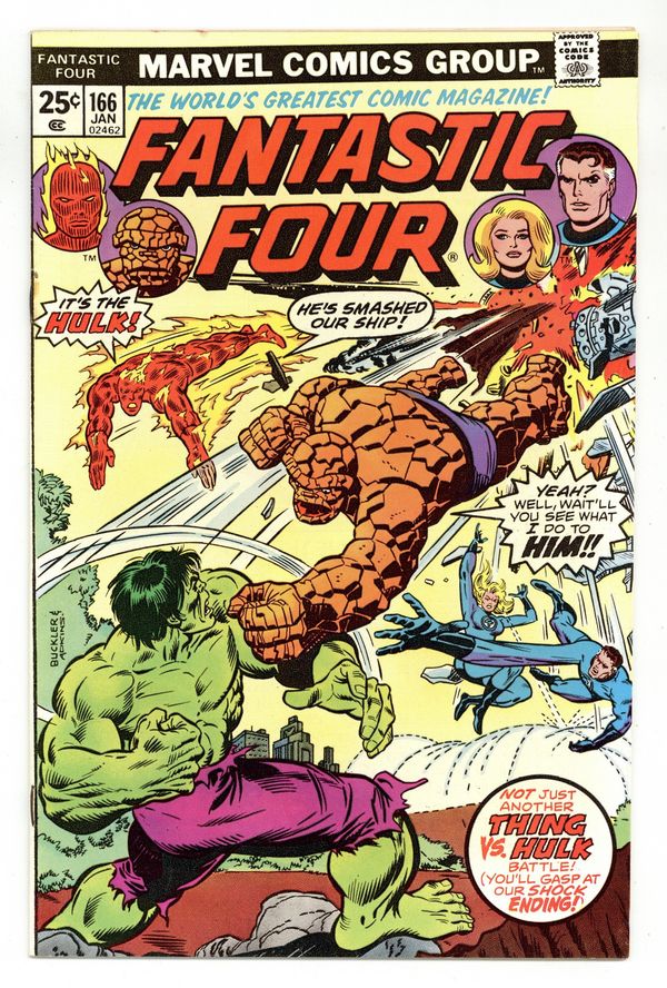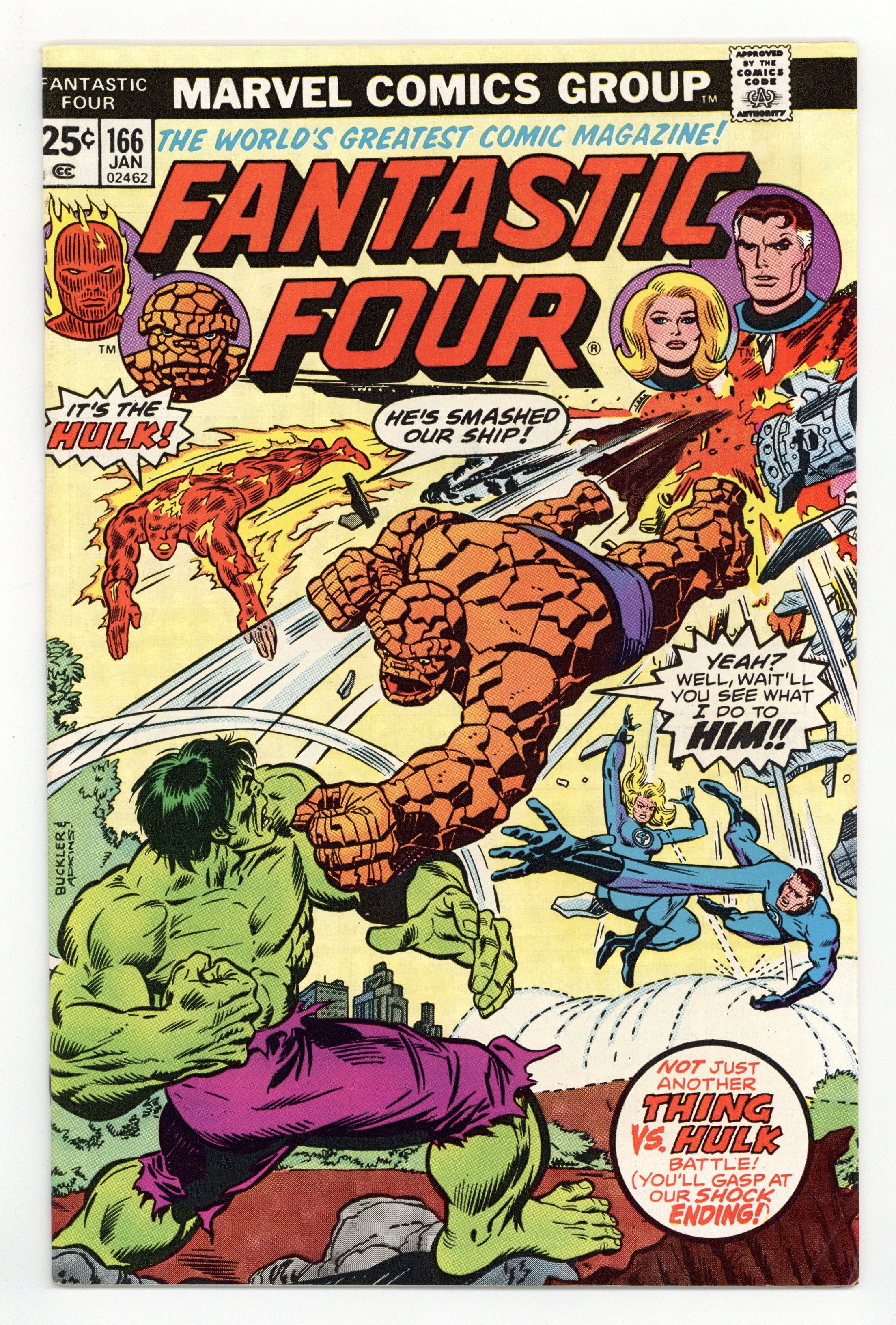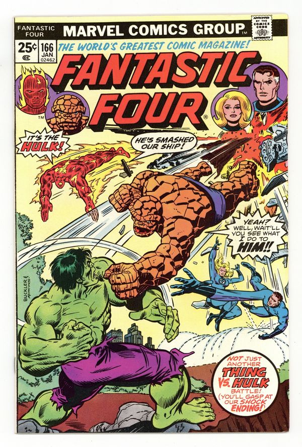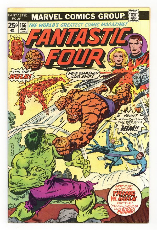 "If It's Tuesday, This Must Be The Hulk!" Part 1 of 2. Guest-starring the Hulk. Script by Roy Thomas. Pencils by George Perez. Inks by Vince Colletta. Cover by Rich Buckler and Dan Adkins. The federal government asks Reed Richards to take the Fantastic Four to the Midwest to apprehend the Hulk! Will the FF be able to find the Green Goliath? Yes! And that's were the trouble begins! However, the fabulous foursome successfully captures the Hulk and hands the behemoth over to the military. It looks like mission accomplished for the FF...until the Thing becomes dismayed over the rough treatment of Dr. Banner. Would Ben actually consider freeing the rampaging Hulk? Yes again! (Note: The letters page contains Marvel Value Stamp series B #13 Doctor Strange by Frank Brunner.) 36 pages Cover price $0.25.