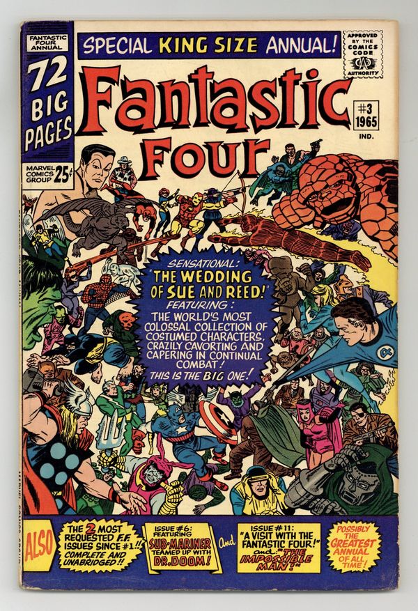 Reed and Sue get married in a new story, "Bedlam at the Baxter Building!" Script by Stan Lee, pencils by Jack Kirby, inks by Vince Colletta. Just about everyone in the Marvel Universe, both heroes and villains, appears in this story. Steve Ditko provided the art on Spider-Man in panel 4 of page 14. This issue also reprints "Captives of the Deadly Duo" (from FF 6), "A Visit with the Fantastic Four" (FF 11), and "The Impossible Man" (FF 11). Kirby/Chic Stone cover. 76 pgs. Cover price $0.25.