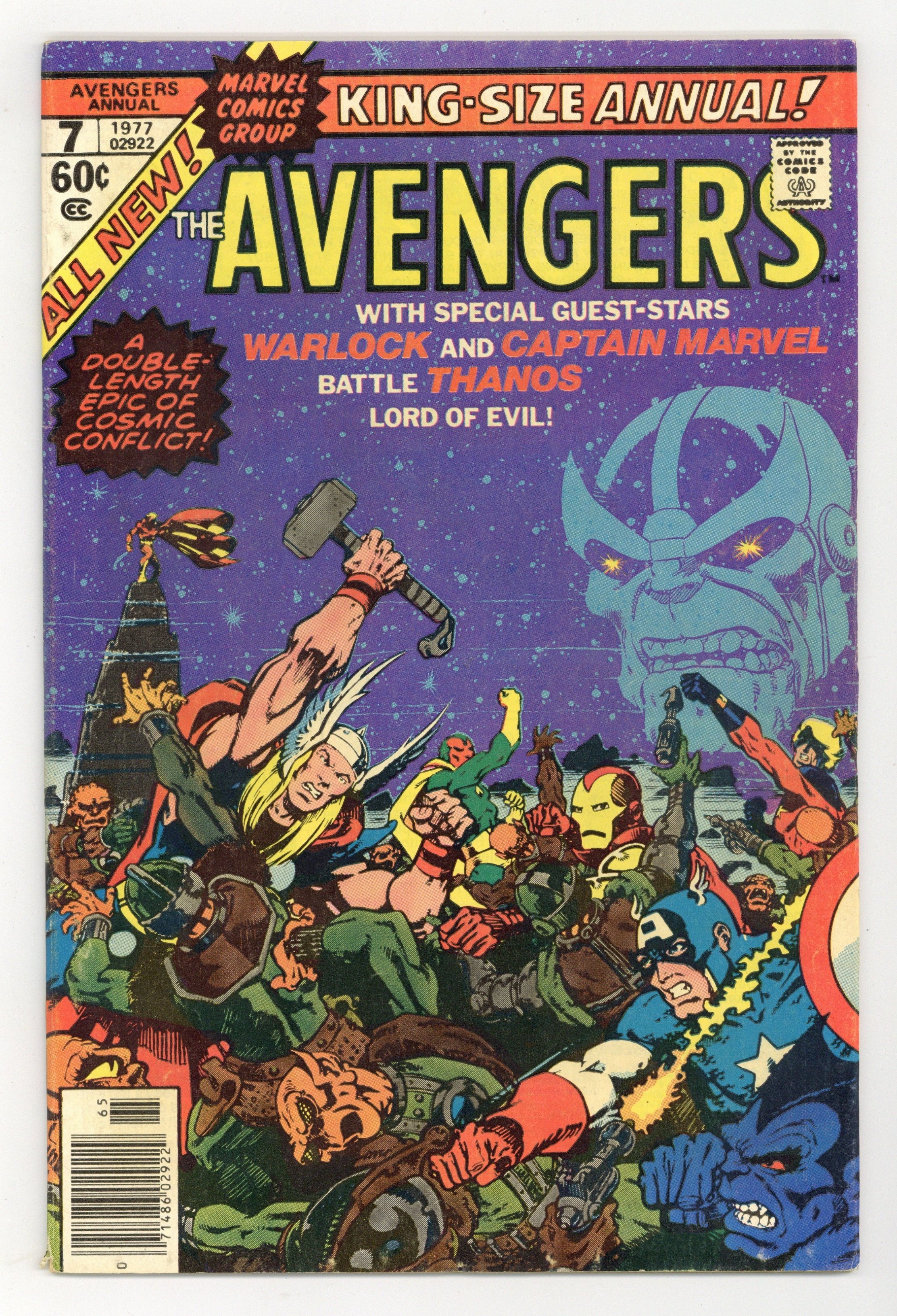 "The Final Threat" Part 1 of 2. Guest-starring Captain Marvel and Adam Warlock. Script by Jim Starlin. Art by Jim Starlin (breakdowns) and Joe Rubinstein (finishes). Cover by Jim Starlin. One of the epochal annuals of the bronze age! A stormy night at Avengers Mansion is interrupted by the sudden arrival of Captain Marvel and Moondragon. The duo feels that the universe is in imminent danger! Their fears are confirmed moments later when Adam Warlock also arrives and delivers troubling news: Thanos has a new plan for obliterating the universe! The evil Titan sends a giant space armada to attack Earth, while he prepares to blow up the sun via his massive star gem! However, the mightiest heroes on Earth intercept the fleet and set their sights on destroying Thanos' instrument of stellar genocide! Tragically though, Warlock falls in battle vs. the mad Titan. Leaving the trio of Iron Man, Thor, and Captain Marvel as the final hope of the universe! Can the Kree warrior, thunder god, and golden avenger triumph over Thanos? Story continues in Marvel Two-in-One Annual 2. Deaths of Gamora, Pip, and Warlock. Avengers lineup: Beast, Captain America, Iron Man, Scarlet Witch, Thor, and the Vision. (Notes: First appearances of the Space Gem, the Mind Gem, and the Reality Gem, and the first time all six Infinity Gems were in a story. Thanos previously appeared in Warlock 15. This annual was reprinted in 1993 in the trade paperback: The Greatest Battles of the Avengers.) 52 pgs. Cover price $0.60.