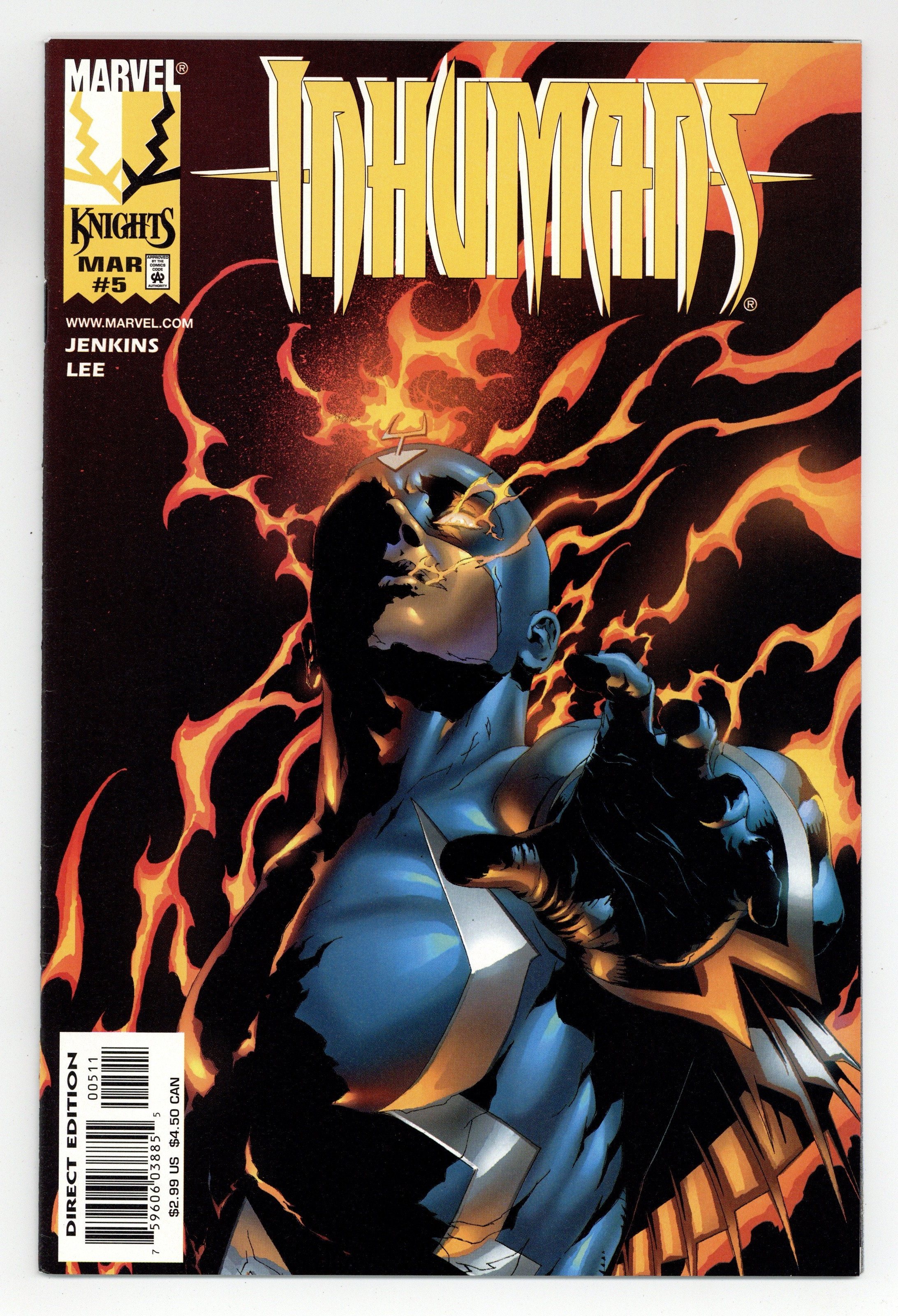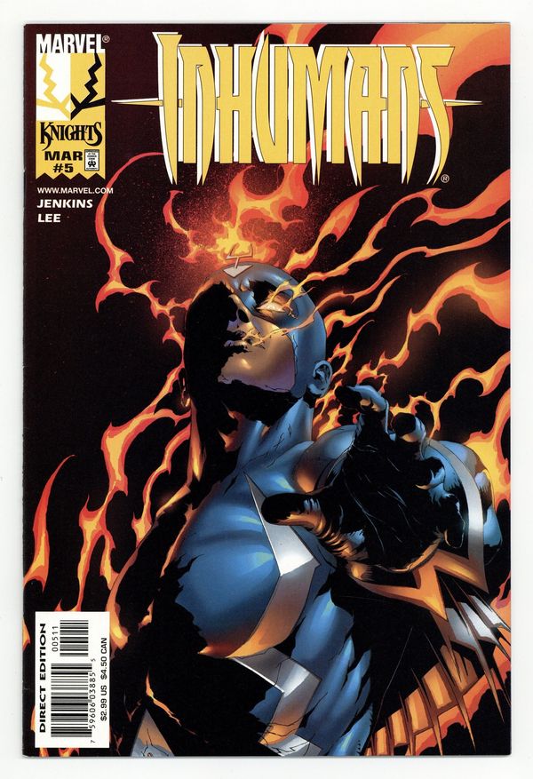First Contact - Written by Paul Jenkins. Art and Cover by Jae Lee. Earth vs. Attilan -- war! The first salvo has been fired in the assault on the fabled Attilan, whose inhabitants must now decide between diplomacy and retaliation. And while Black Bolt and his closest confidantes weigh their options, the wheels of deception turn in the outside world, as Stalyenko turns to an unlikely source for aid in his campaign against the aliens that live at humanity's door. For all their power, can the Inhumans handle the lies, greed and politics of mankind? Plus: a special guest appearance by the Black Widow, who will soon be starring in her own Marvel Knights limited series! 32 pages, full color. Cover price $2.99.