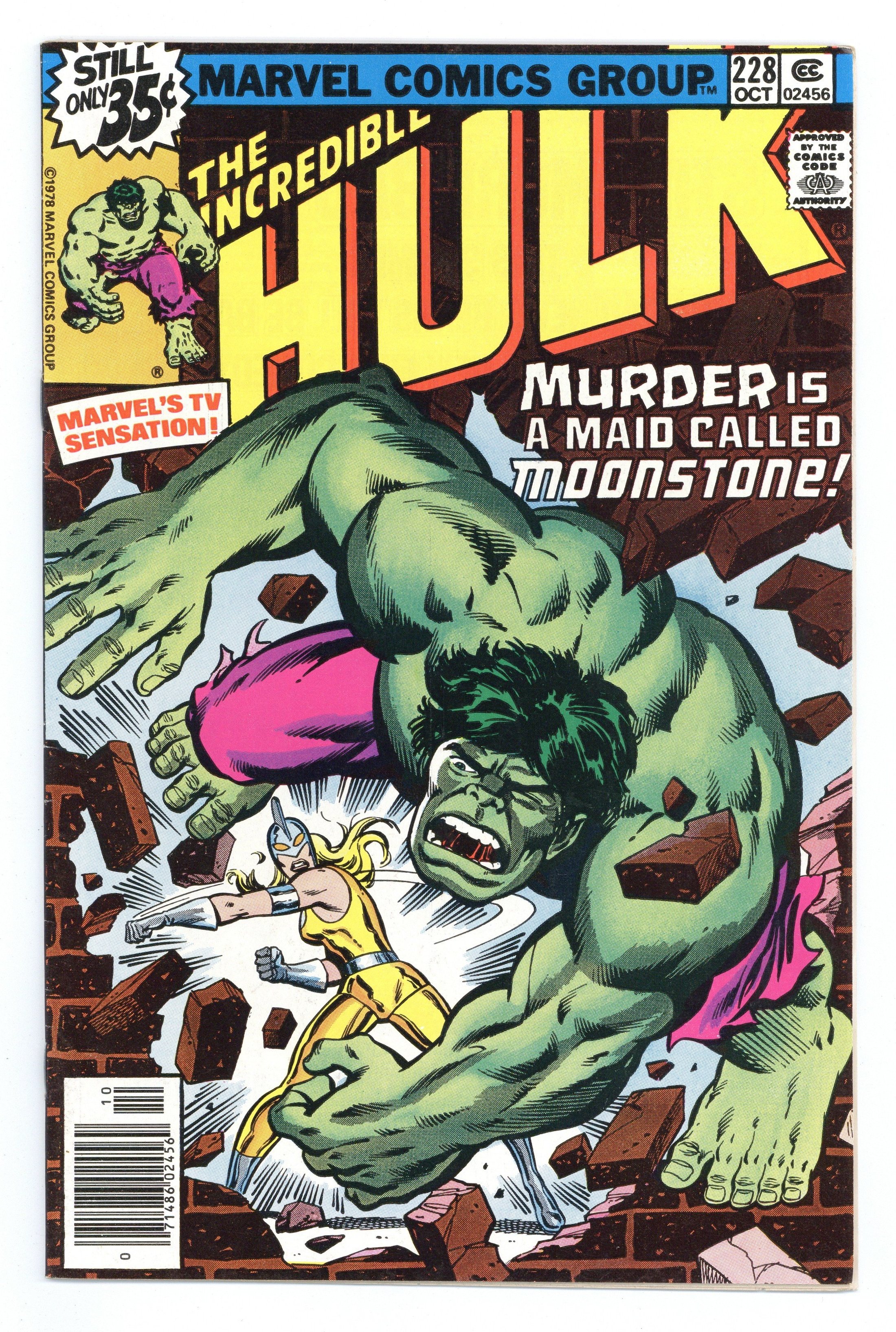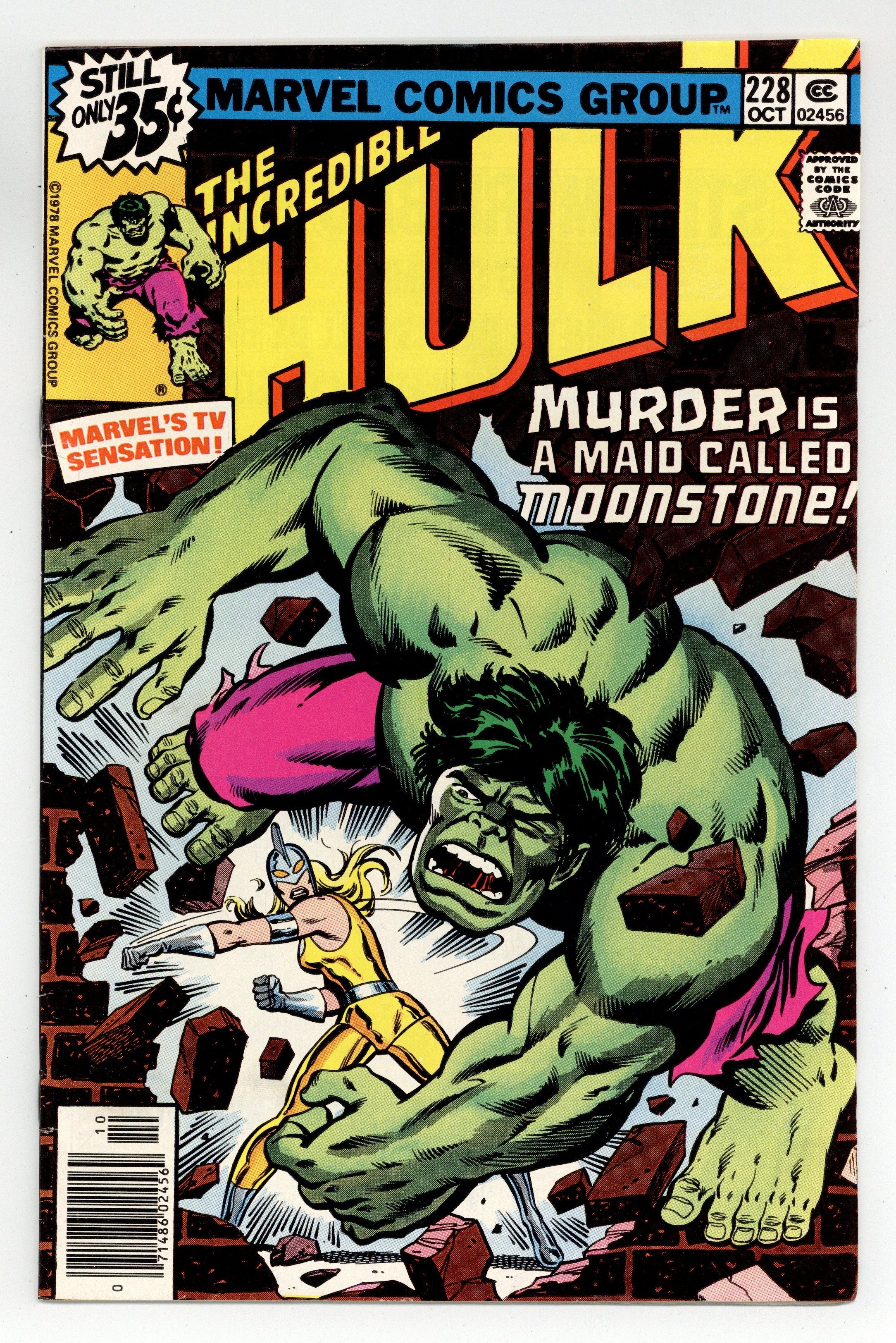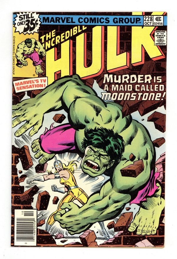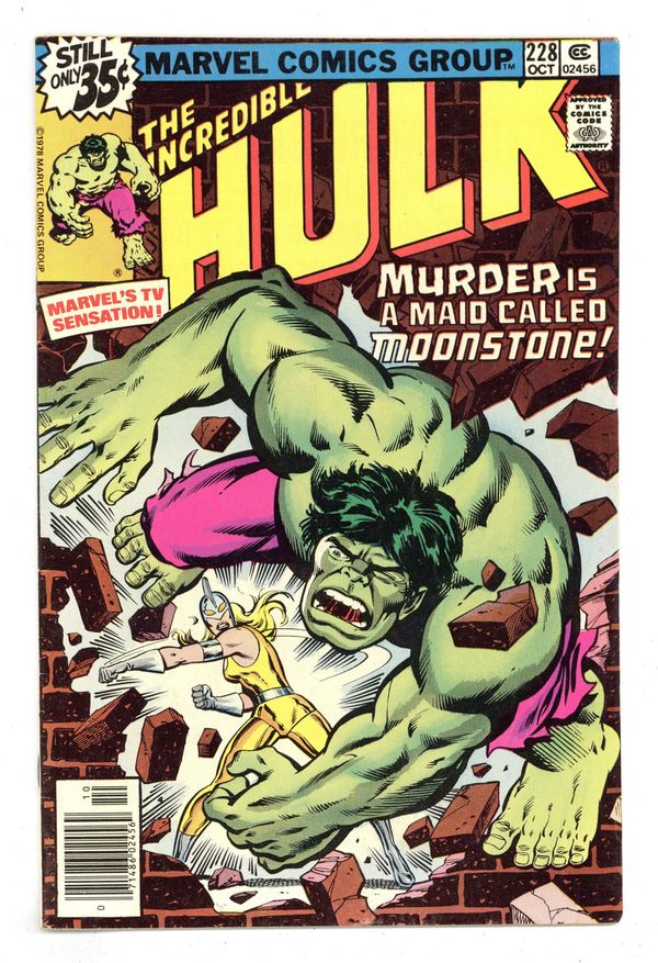 Tags: Marvel Legacy Numbering: Hulk (part 228), Hulk$25.50First appearance of Dr. Karla Sofen as Moonstone in "Bad Moon on the Rise!" Part 1 of 2. Script by Roger Stern and Peter Gillis. Art by Sal Buscema (breakdowns) and Bob McLeod (finishes). Cover by Herb Trimpe and Bob McLeod. At Gamma Base in the Desert Southwest, Doc Samson continues hiswork to find a way to cure the Hulk. And during a break in his research, he receives a phone call from a fellow psychiatrist named Dr. Karla Sofen. She would like to come to Gamma Base and assist with treating the Hulk. Oh, hownice! Doc Samson welcomes her with open arms, but he's not aware of her true intentions. Dr. Sofen is actually there to steal components of theGammavator for the criminal enterprise known as the Corporation. Once Karla completes her evening heist, she thinks she's home free! But on her way out of the storage vault, she runs into the Green Goliath! And then and there,the new Moonstone faces off with her first superhero -- none other than the Incredible Hulk! Cameo appearances by Betty Ross, Kropotkin, Clay Quartermain, General Thunderbolt Ross, and Jim Wilson. (Notes: Dr. Karla Sofen first appeared in Captain America 192. She is the second Moonstone after stealing the alien gemstone from the first Moonstone aka Lloyd Bloch.) 36 pages. Cover price $0.35.