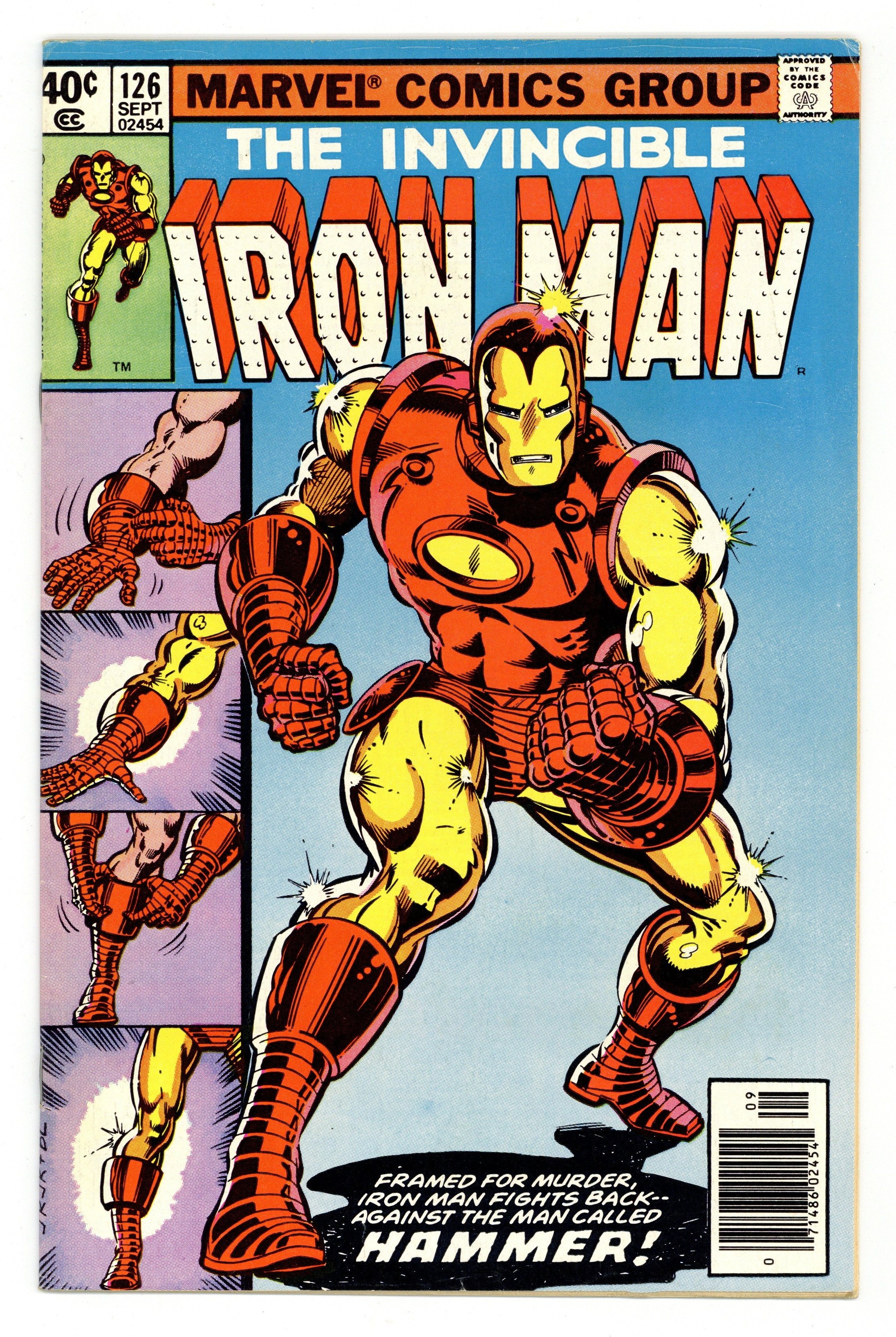 Newsstand Edition. "The Hammer Strikes!" Part 4 of 5. Script by David Michelinie. Art by John Romita Jr. (breakdowns) and Bob Layton (finishes). Cover by John Romita Jr. and Bob Layton. At last Tony Stark comes face-to-face with Justin Hammer! However the circumstances of their first meeting are not favorable to the CEO of Stark International! Tony is a prisoner on Hammer's floating Mediterranean fortress! And his only chance of escape lies in locating his briefcase that contains his backup suit of armor! As shown on the intense cover, the golden avenger indeed finds what he's looking for and successfully suits up! But Justin Hammer has an army of super-villains waiting for him! The battle royal is coming next issue! Cameo appearances by Jim Rhodes, Bethany Cabe, Ling McPherson, the Blizzard, Beetle, Constrictor, Discus, Leap-Frog, Man-Killer, Melter, Porcupine, Spymaster, Stiletto, Water Wizard, and Whiplash. Flashback cameos by Ant-Man and the Avengers. 32 pages. Cover price $0.40.