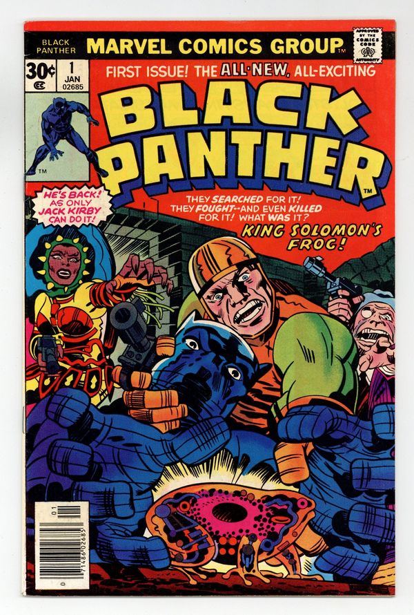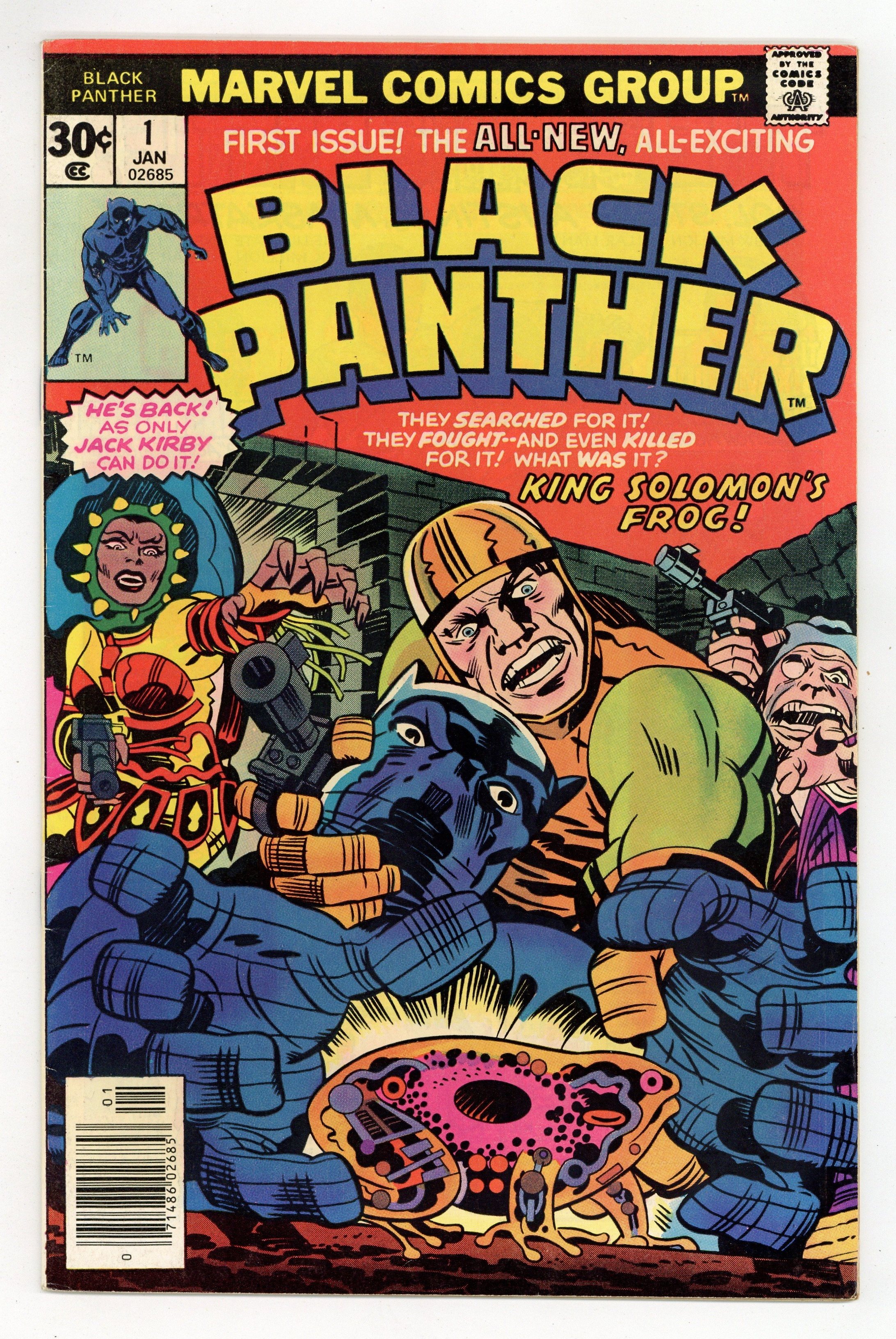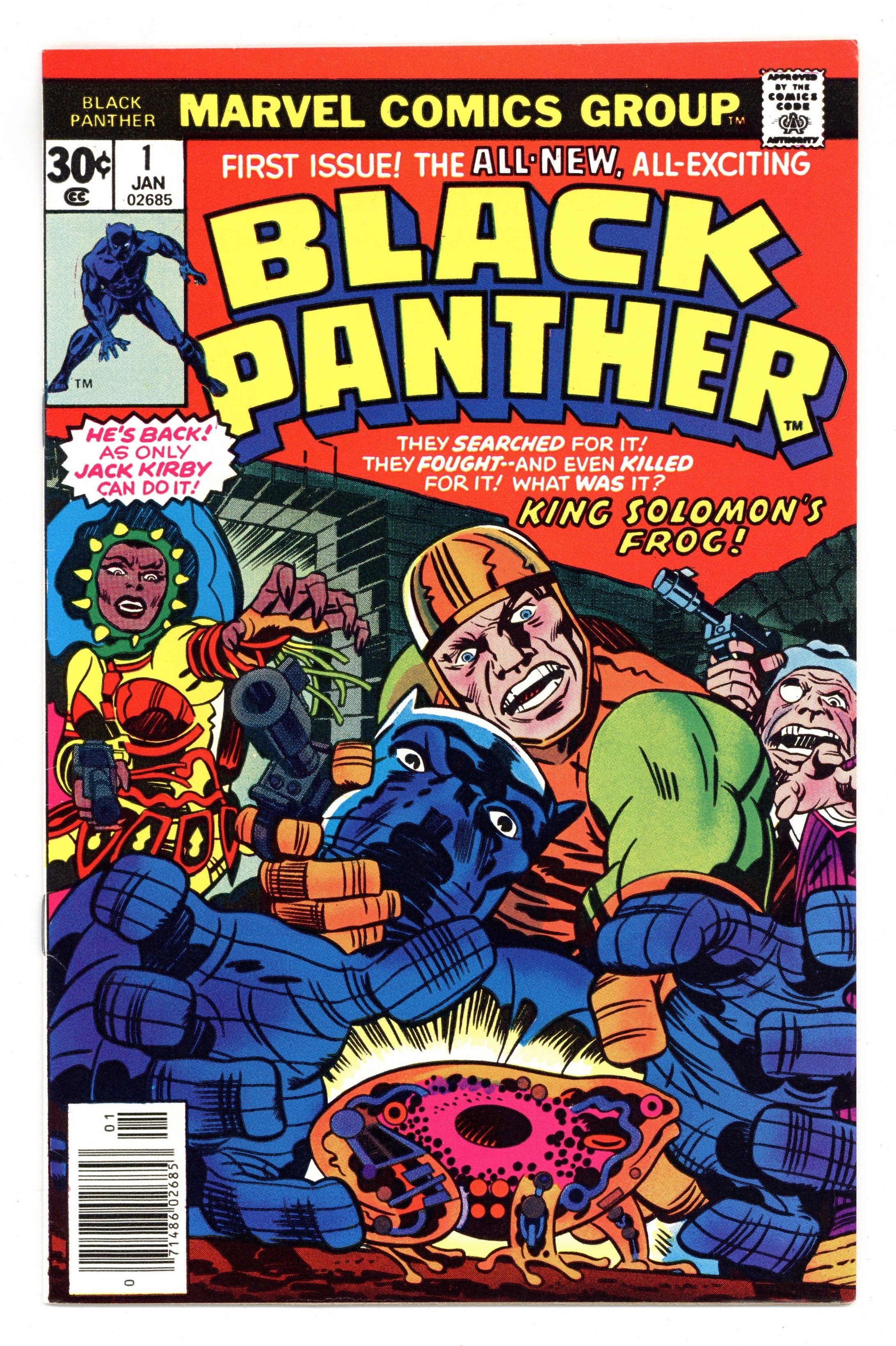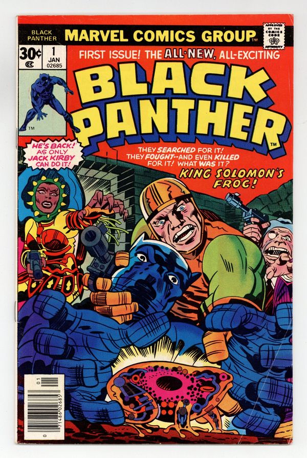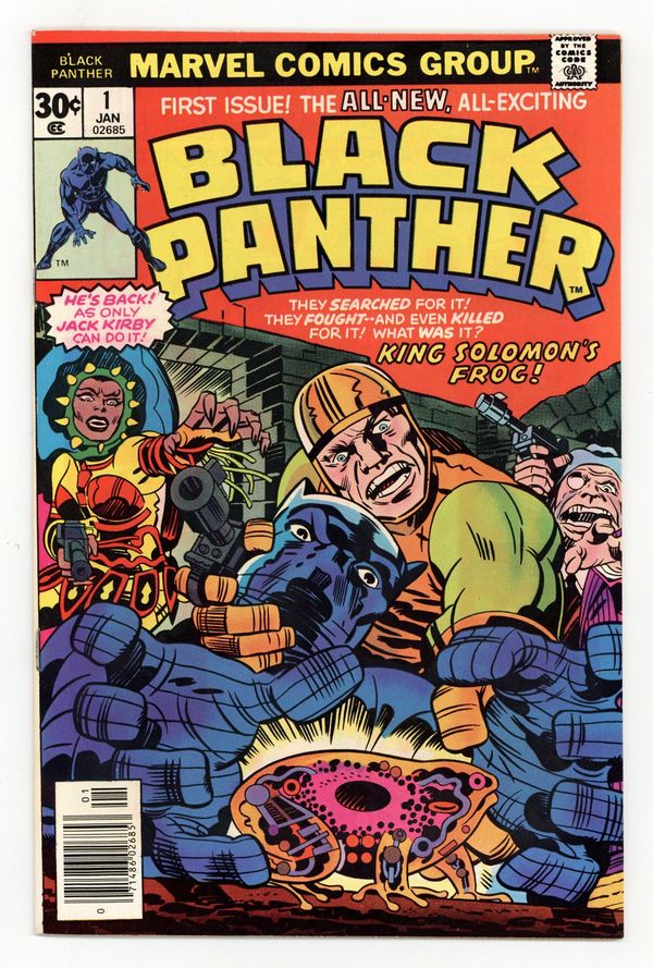 Cover pencils by Jack Kirby, inks by John Verpoorten. King Solomon's Frog!, script and pencils by Jack Kirby, inks by Mike Royer; Black Panther helps Abner Little, a member of the Collectors, recover the Brass Frog, an ancient time machine; Due to its dangerous nature, the Frog had previously been hidden away by the Black Panther's grandfather, Azzuri, but was taken by Alfred Queely, a fellow member of the Collectors; After getting the Frog, the Black Panther and Little are attacked by Princess Zanda, another member of the Collectors, for control of the artifact. During the battle, the Frog is activated and a mysterious creature, Hatch-22, appears. Jack Kirby writes about what readers can expect from his new Black Panther. 36 pgs. $0.30. Cover price $0.30.
