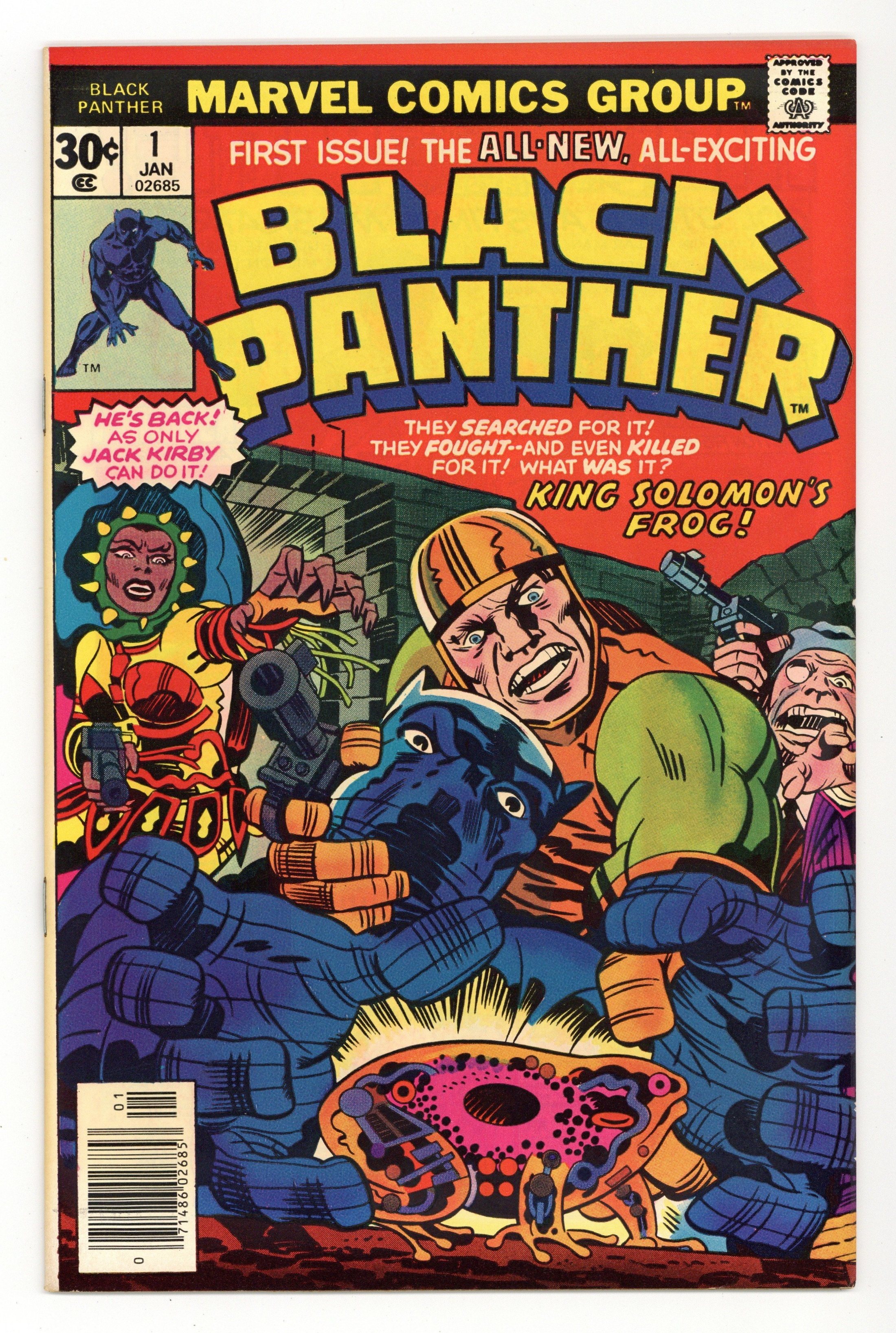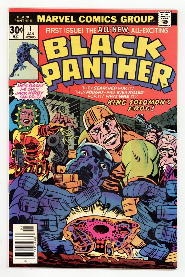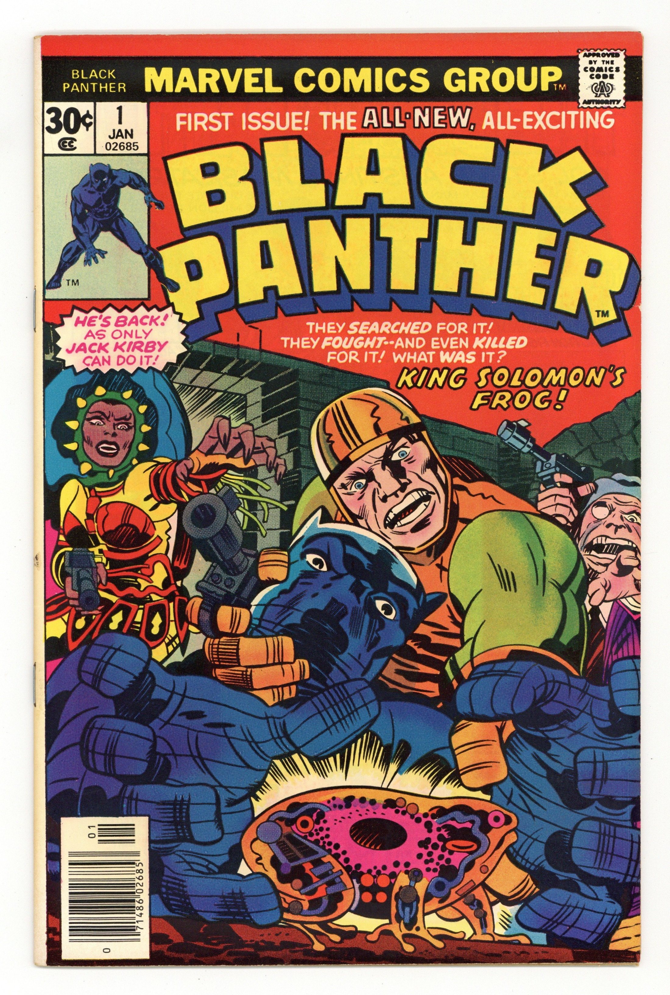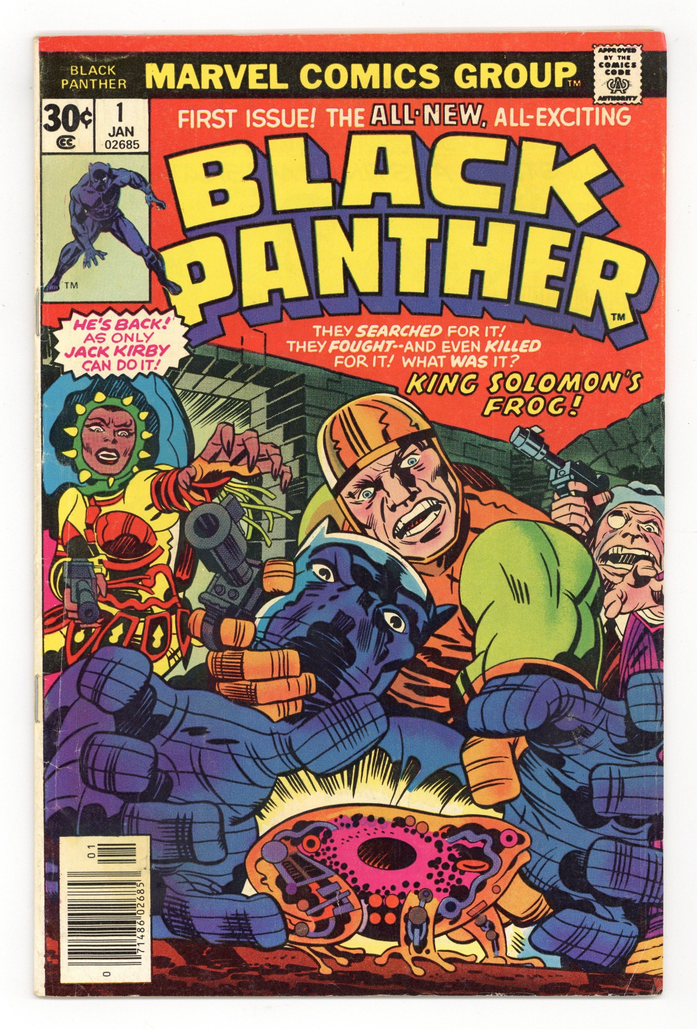 Cover pencils by Jack Kirby, inks by John Verpoorten. King Solomon's Frog!, script and pencils by Jack Kirby, inks by Mike Royer; Black Panther helps Abner Little, a member of the Collectors, recover the Brass Frog, an ancient time machine; Due to its dangerous nature, the Frog had previously been hidden away by the Black Panther's grandfather, Azzuri, but was taken by Alfred Queely, a fellow member of the Collectors; After getting the Frog, the Black Panther and Little are attacked by Princess Zanda, another member of the Collectors, for control of the artifact. During the battle, the Frog is activated and a mysterious creature, Hatch-22, appears. Jack Kirby writes about what readers can expect from his new Black Panther. 36 pgs. $0.30. Cover price $0.30.