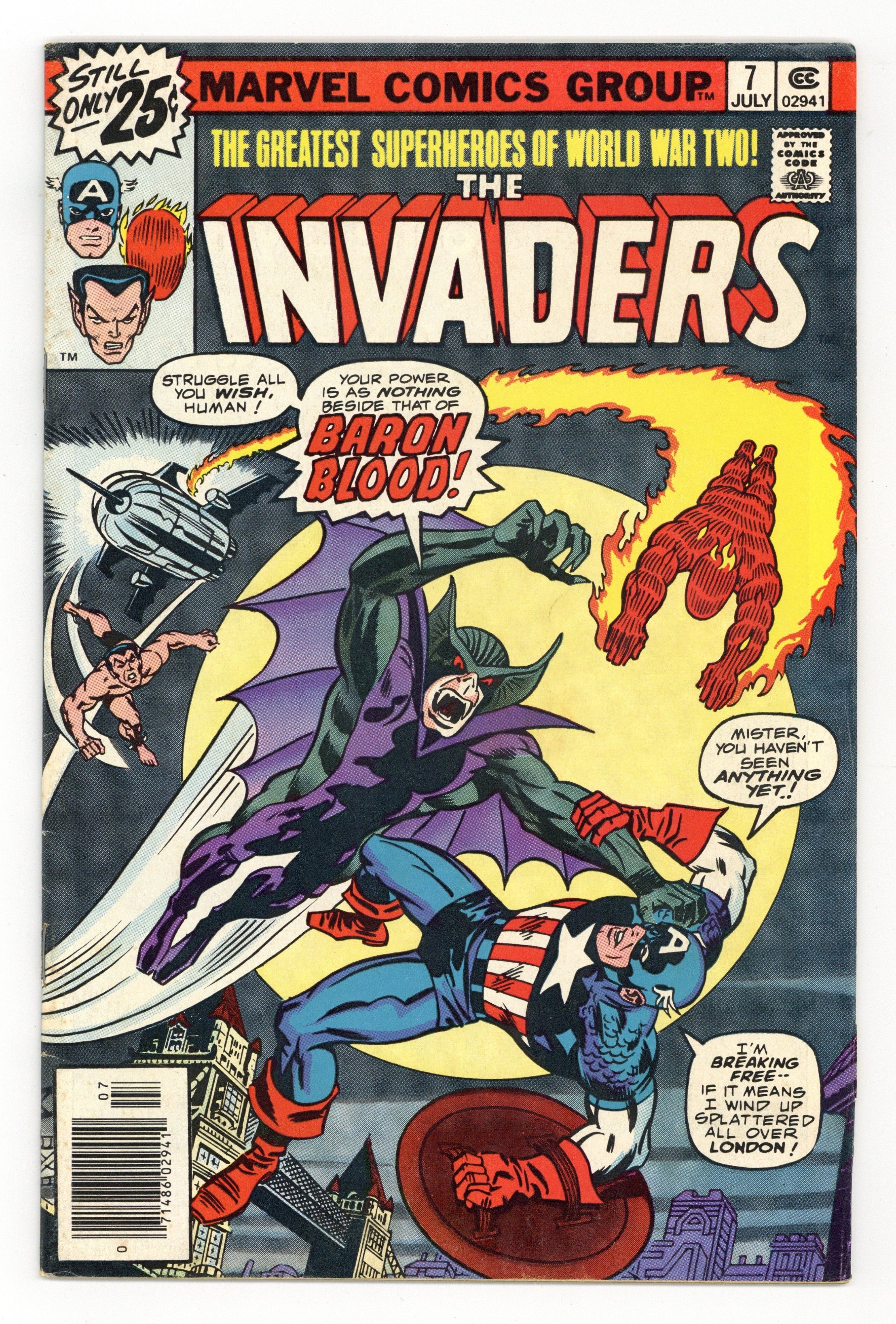 Part 1 of 3 - "The Blackout Murders of Baron Blood!" Written by Roy Thomas. Art by Frank Robbins and Vince Colletta. The Invaders come face-to-face with the nightmare that is Baron Blood. Plus, meet Union Jack, masked avenger from World War I. 1st appearance of Baron Blood, 1st appearance of Union Jack (James Falsworth) and 1st appearance of Jacqueline Falsworth (she becomes Spitfire in Invaders #12). Marvel Value Stamp. Cover price $0.25.