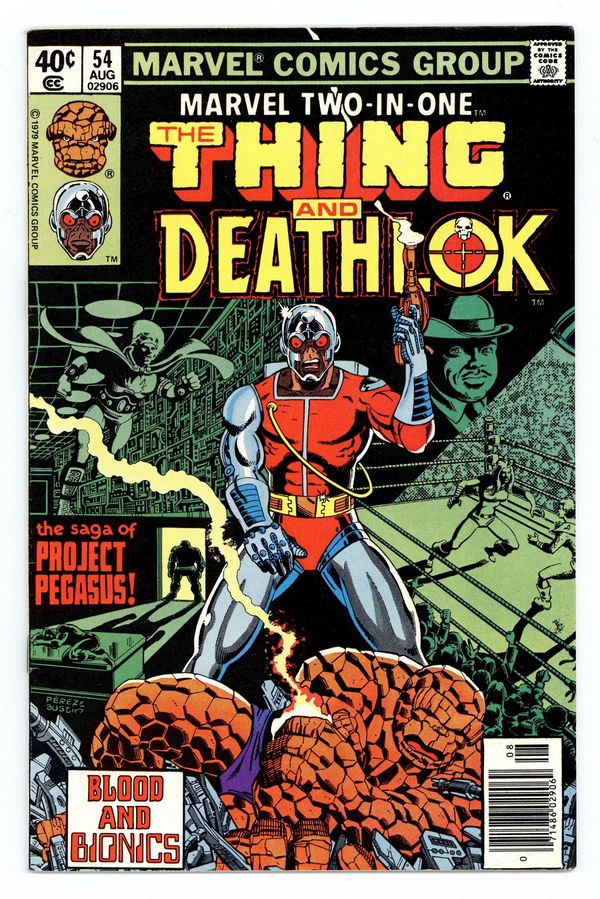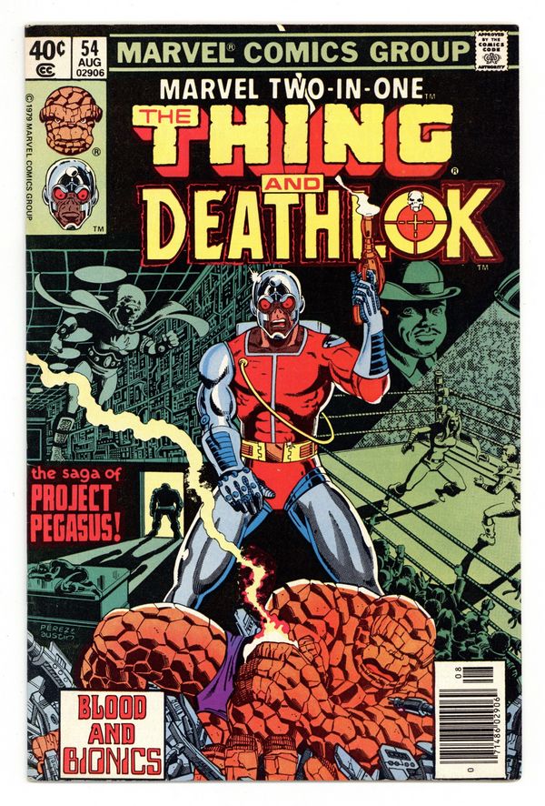 Newsstand Edition. Cover by George Pérez and Terry Austin. The Pegasus Project. Part 2 of 6. "Blood and Bionics!" Guest-starring Deathlok and Quasar. Thundra cameo. Story by Mark Gruenwald and Ralph Macchio. Art by John Byrne and Joe Sinnot. Can even the combined might of the Thing and Quasar take down the cybernetic killer from the future known as Deathlok? Plus beware, there is betrayal at Project: Pegasus. Cover price $0.40.