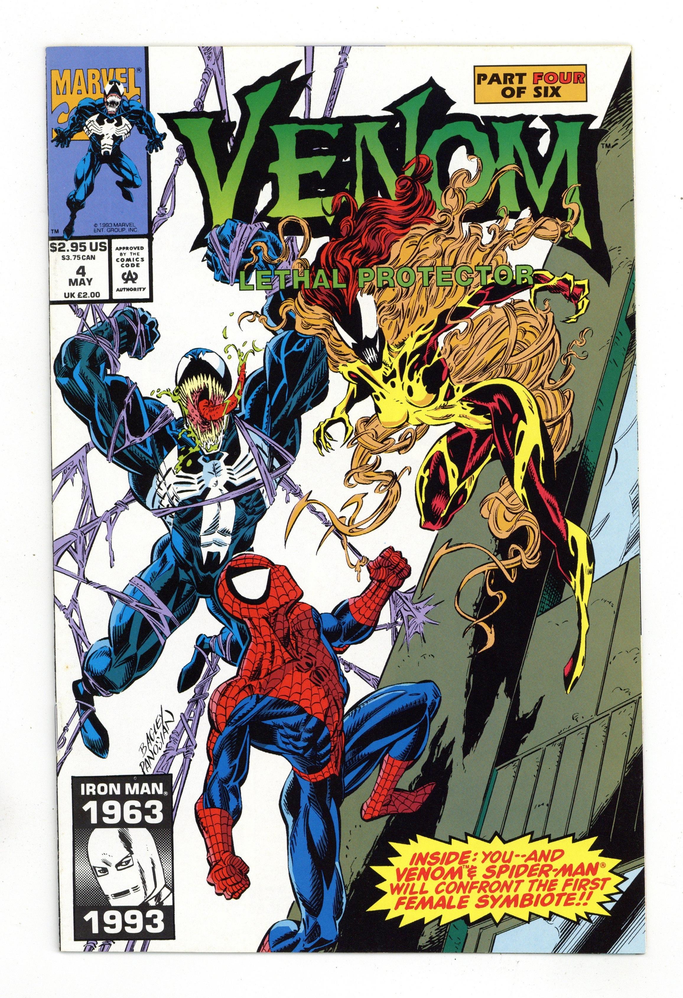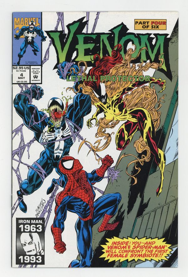 Tags: Marvel Legacy Numbering: Venom (part 4), Spider-Man$8.00Direct Edition. The first female symbiote enters the scene! Spider-Man and Venom confront the Life Foundation's master plan, when a new killer symbiote is born. Written by David Michelinie. Art by Ron Lim, Sam de la Rosa and Al Milgrom. Cover by Mark Bagley and Dan Panosian. Cover price $2.95.