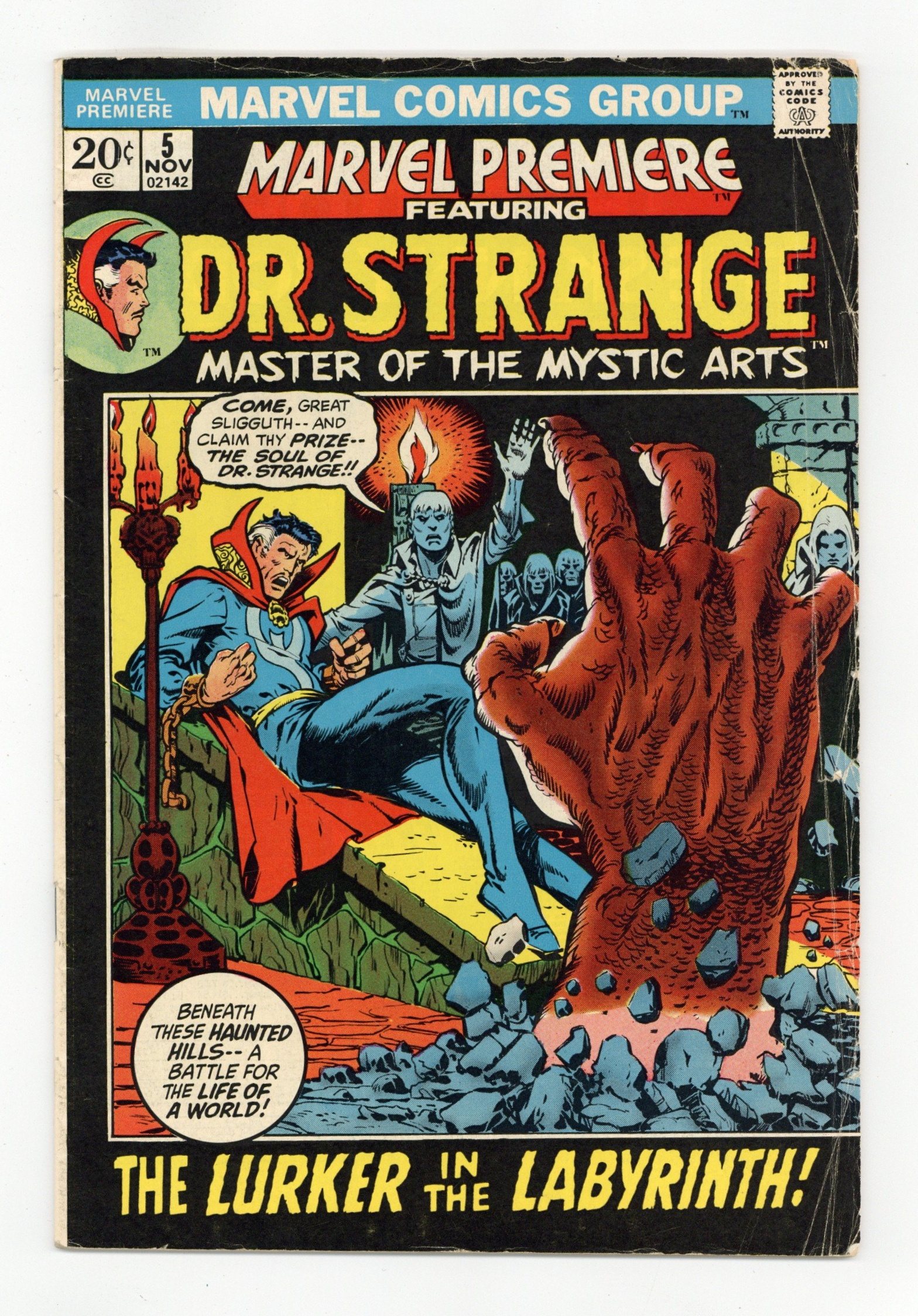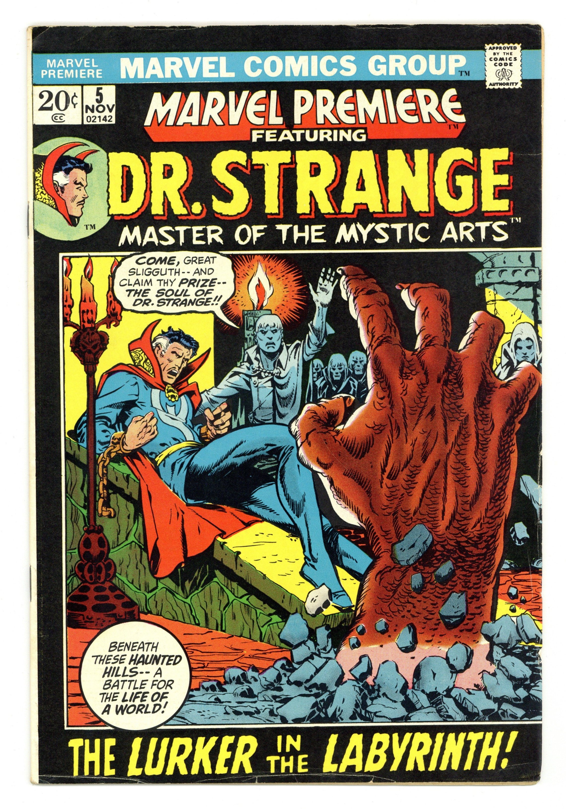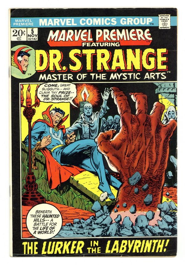 Cover art by Mike Ploog. The Lurker in the Labyrinth!, script by Gardner F. Fox, pencils by Irv Wesley, inks by Don Perlin; Strange escapes being sacrificed to Sligguth, learns of the slumbering evil of Shuma-Gorath; Ancient One, weakened from giving power to Strange, is carried away by Shadowmen of sunken Kaa-U. Featuring concepts created by Robert E. Howard. 36 pgs. $0.20. Cover price $0.20.